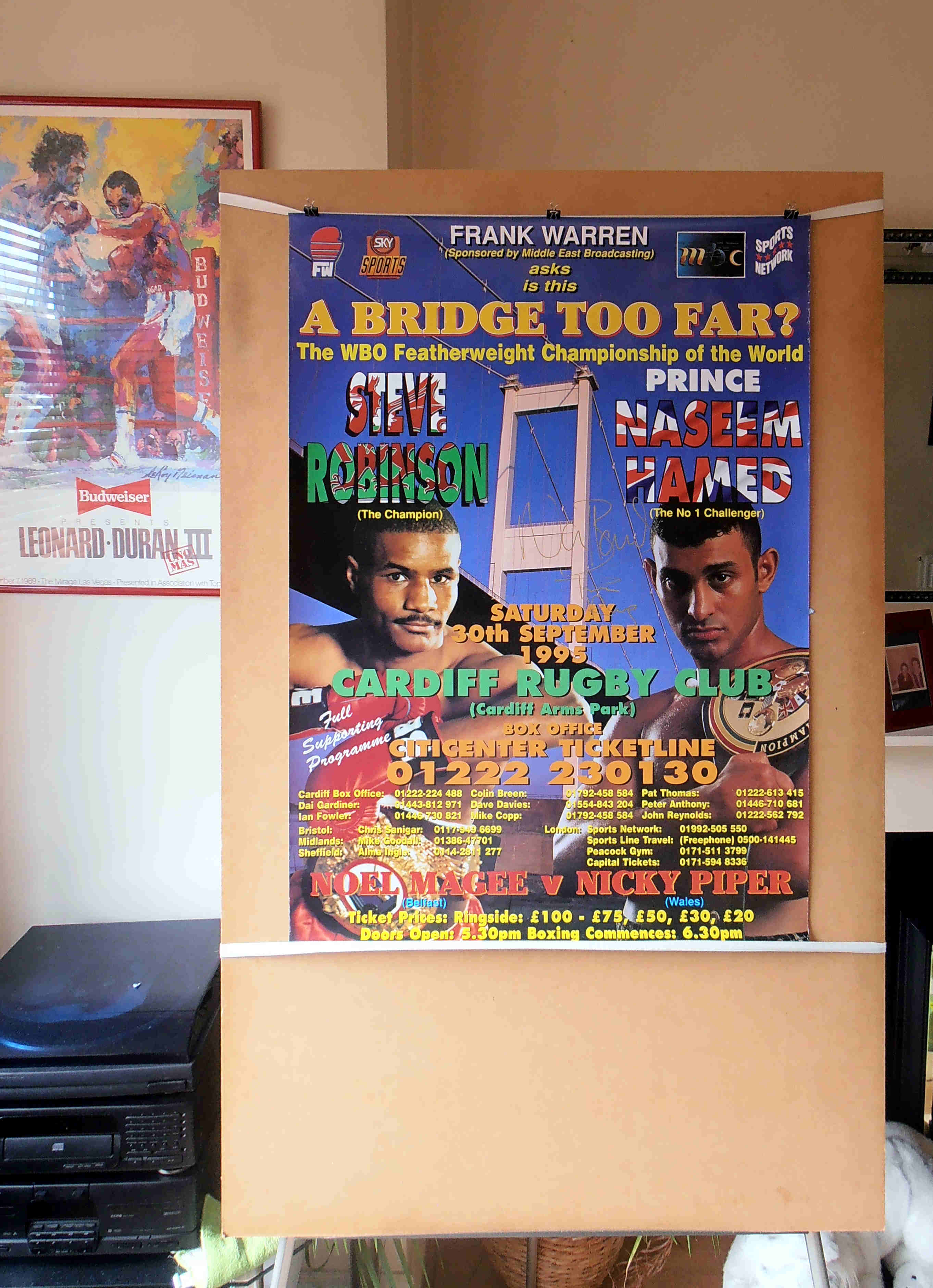 Description : Here we have an authentic Prince Naseem Hamed signed original frank warren promotions poster for the WBO World featherweight title bout held at Cardiff Arms Park, 30th September 1995.