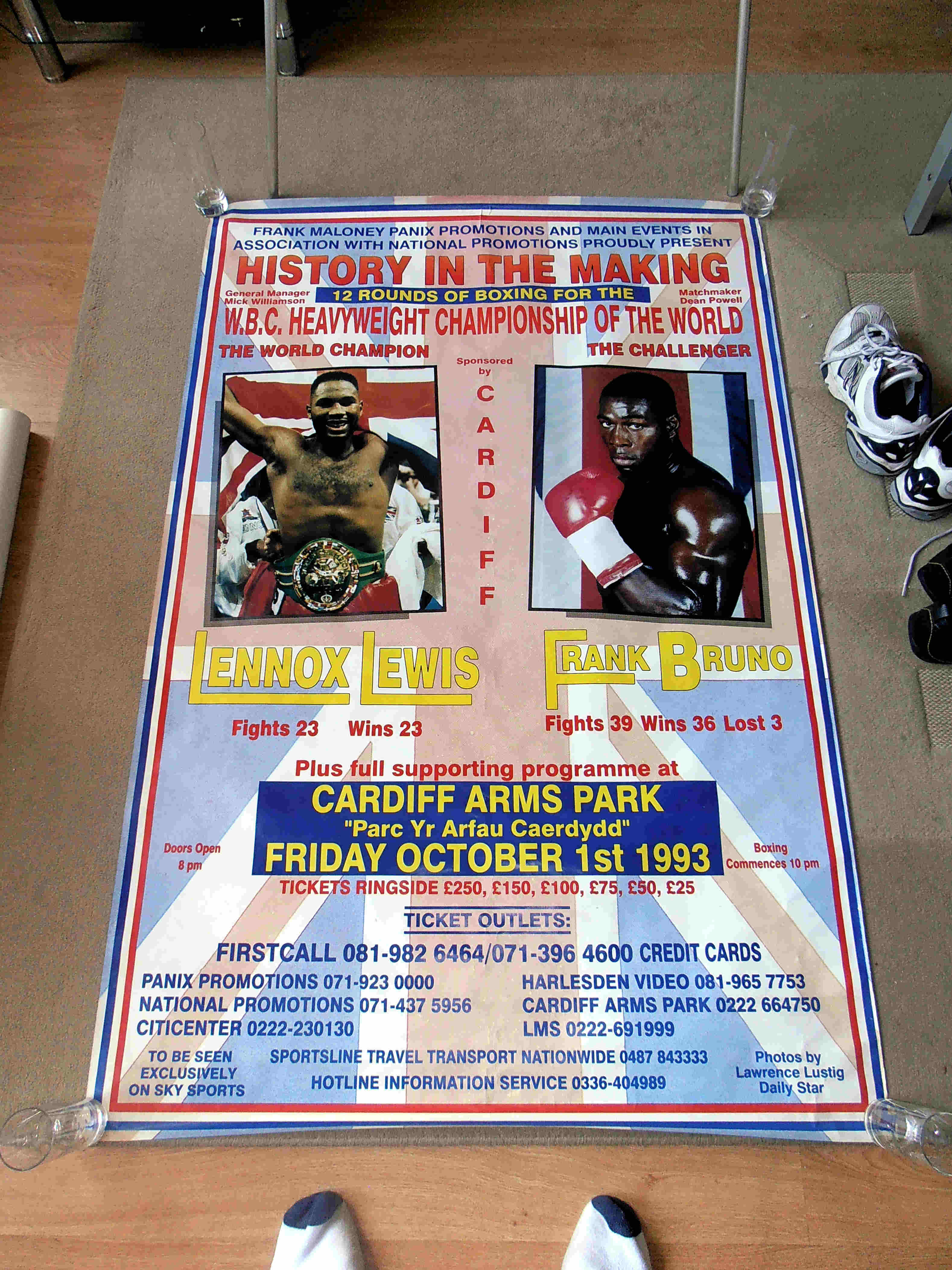 Description : Here we have a fantastic mega huge 40in x 60in official Frank malony & Pannix promotions onsite arena billboard poster for the WBC Super/middleweight title bout between Lennox Lewis vs. Frank Bruno, billed as "The battle of Britain". This fight took place on 1 October 1993, at the National Stadium, Cardiff Arms Park, Cardiff, Wales. These posters were not distributed for public consumption, and made available for what their purpose actually was & that was to advertise the fight.