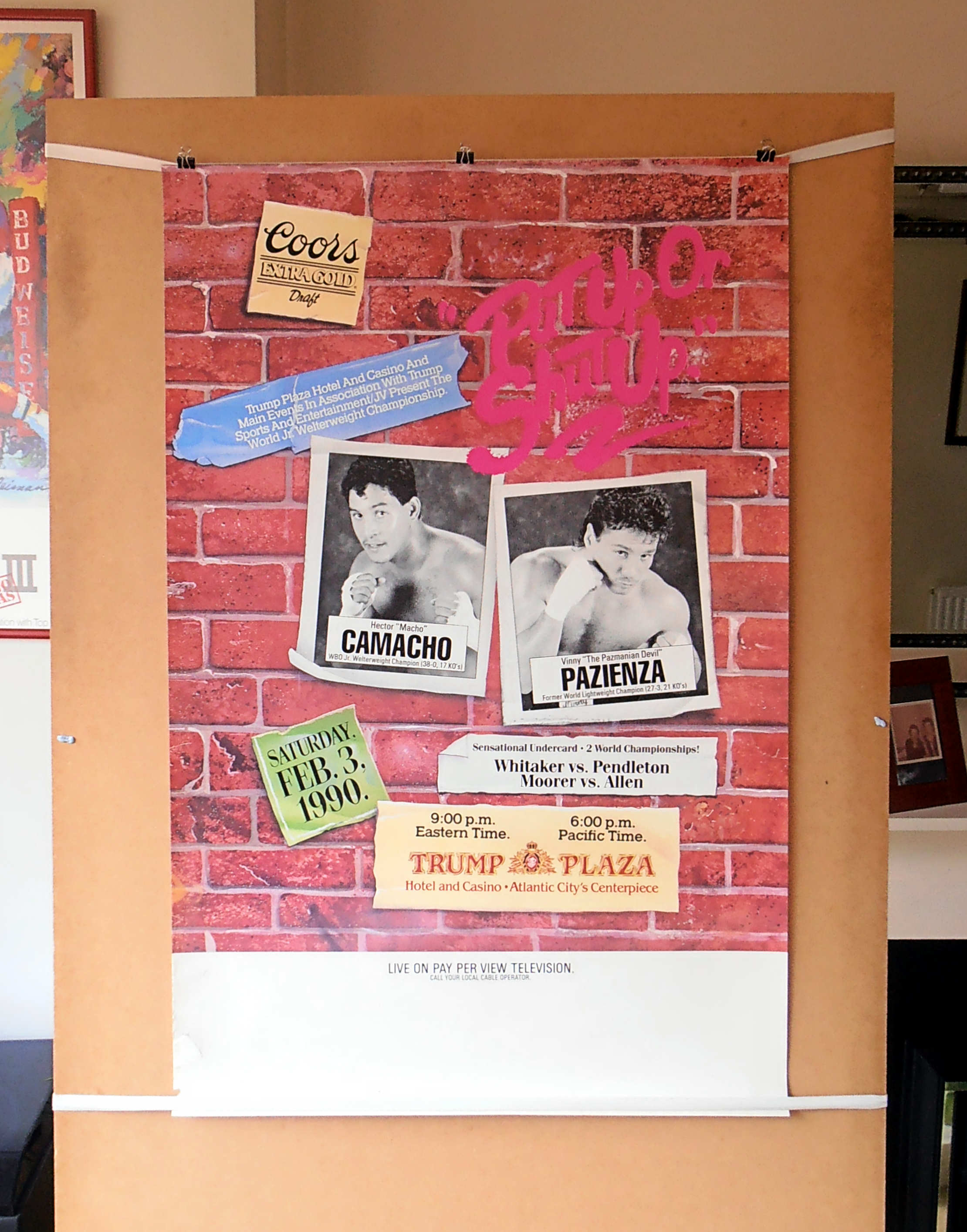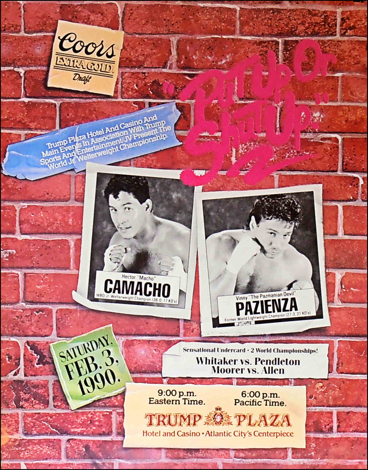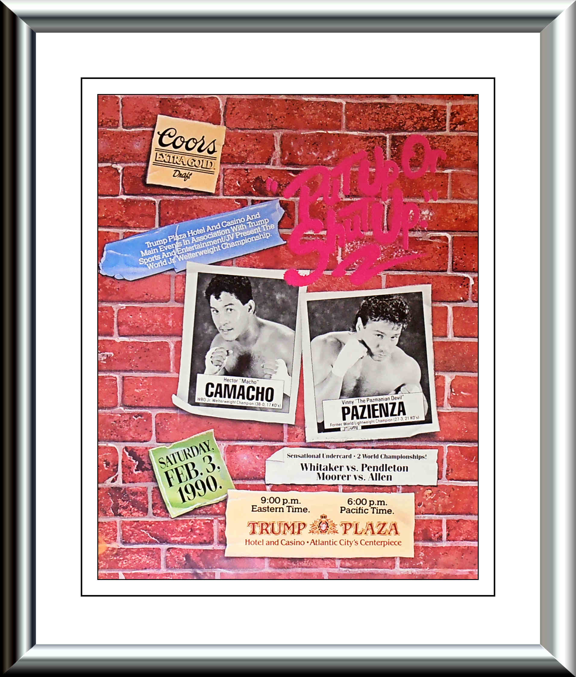 Description : Here we have an original closed circuit PPV fight poster for the WBO Light/welterweight world championship bout at the Convention Hall, Atlantic City, New Jersey, USA,. Billed as "Put up or Shut Up" 3rd February 1990.