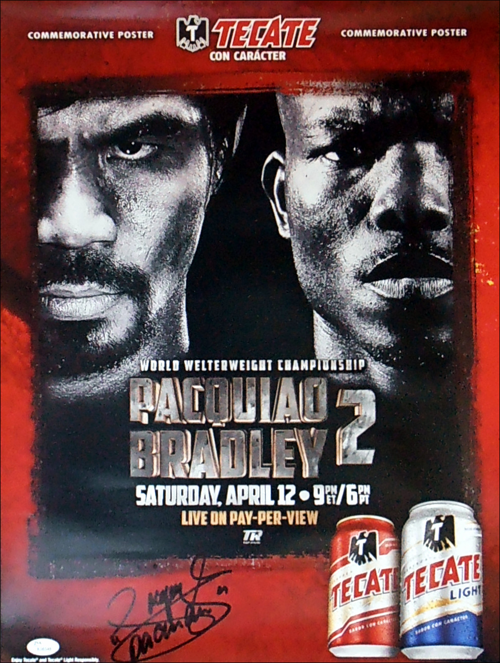 This Manny Pacquiao autographed Tecate closed circuit poster comes with a letter of guarantee of authenticity from KOfightposters.com & James Spence Authentication cert.