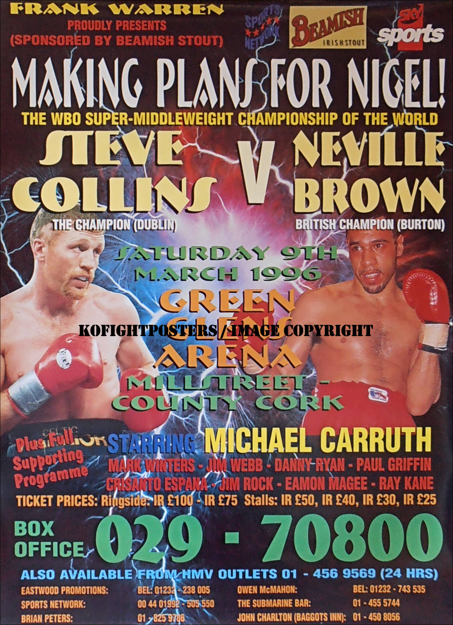 Steve Collins (Holder) successfully defended his world title for the 3rd time when he stopped the challenger in the 11th round by TKO after having dropped Brown in the 1st round & twice in the 11th forcing the referee to call a halt to proceeding's. All three judges up to that point have the defending champion ahead by scores of 99-89 / 99-89 / 99-89, respectively.