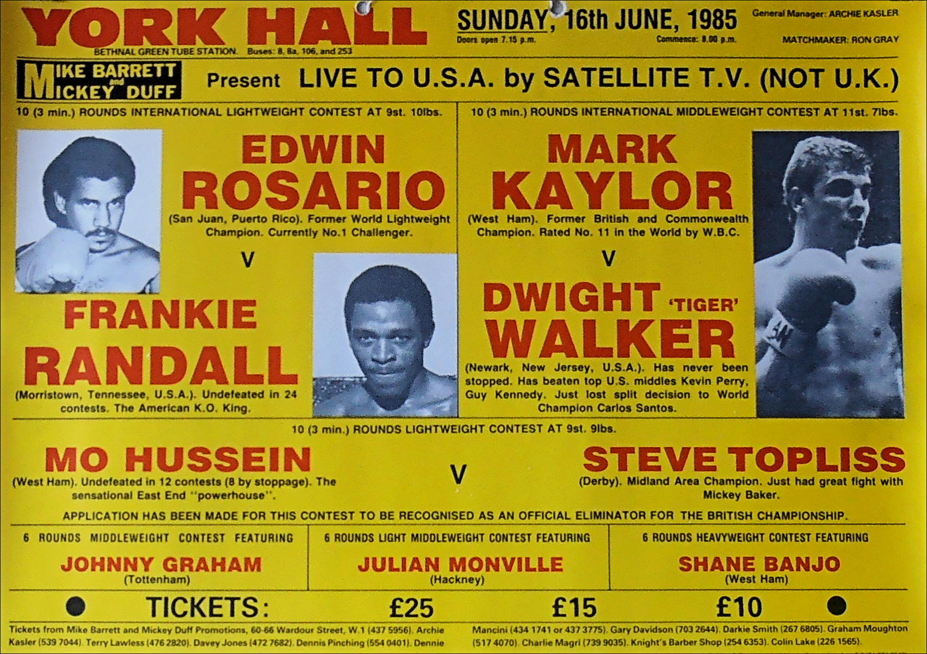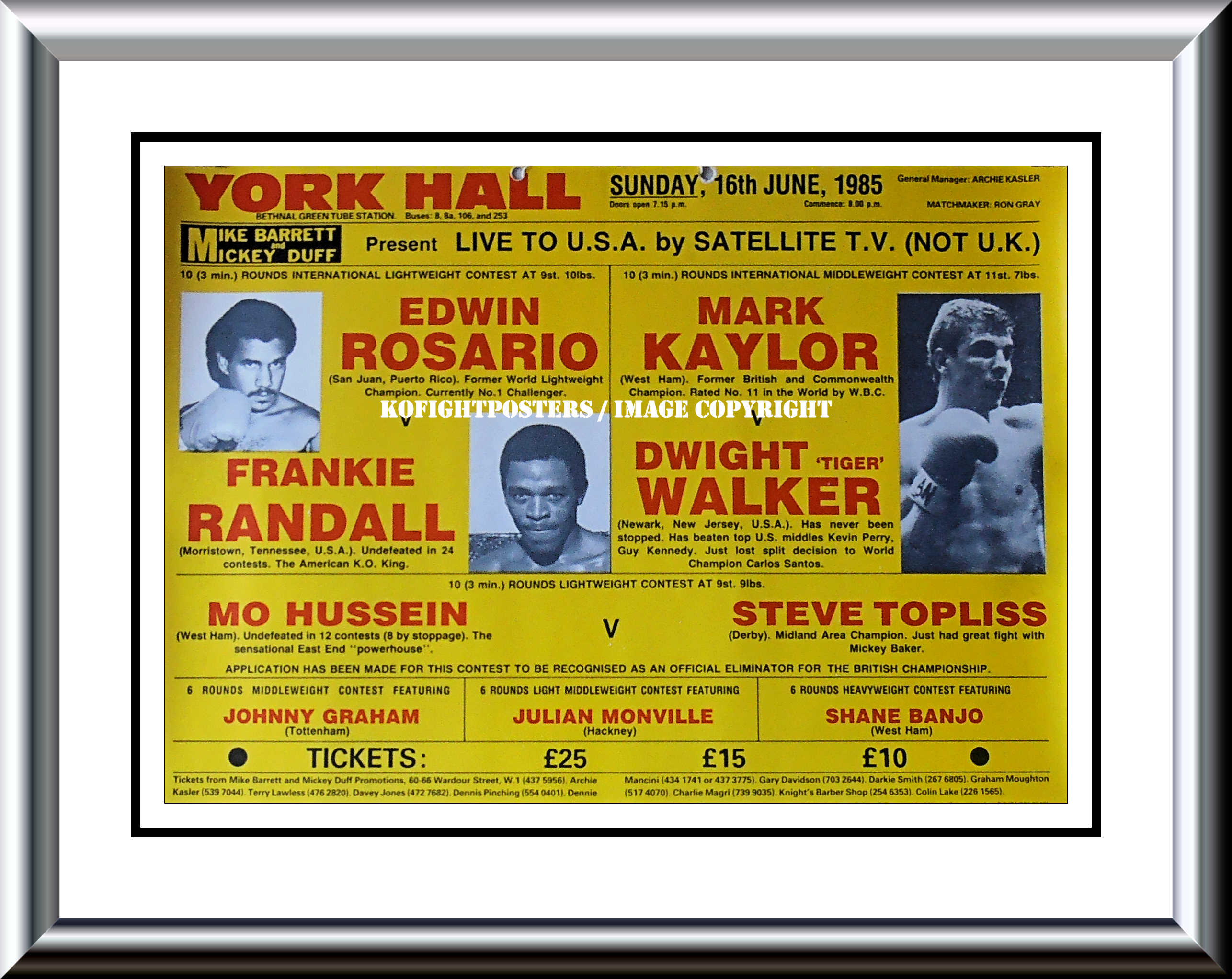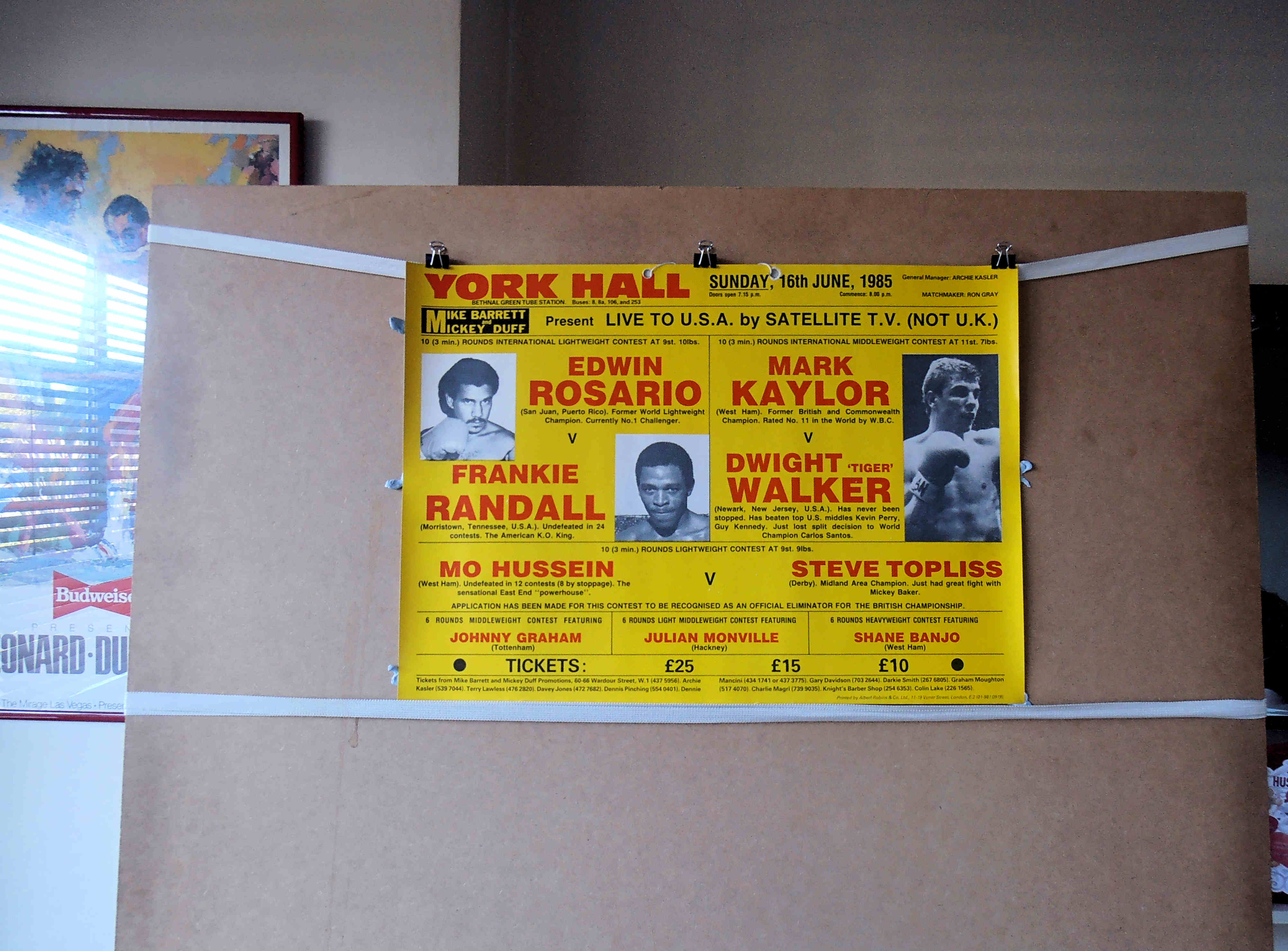 Description : Here we have an original vintage onsite boxing poster from the York Hall Bethnal Green, London, 16th June 1985.