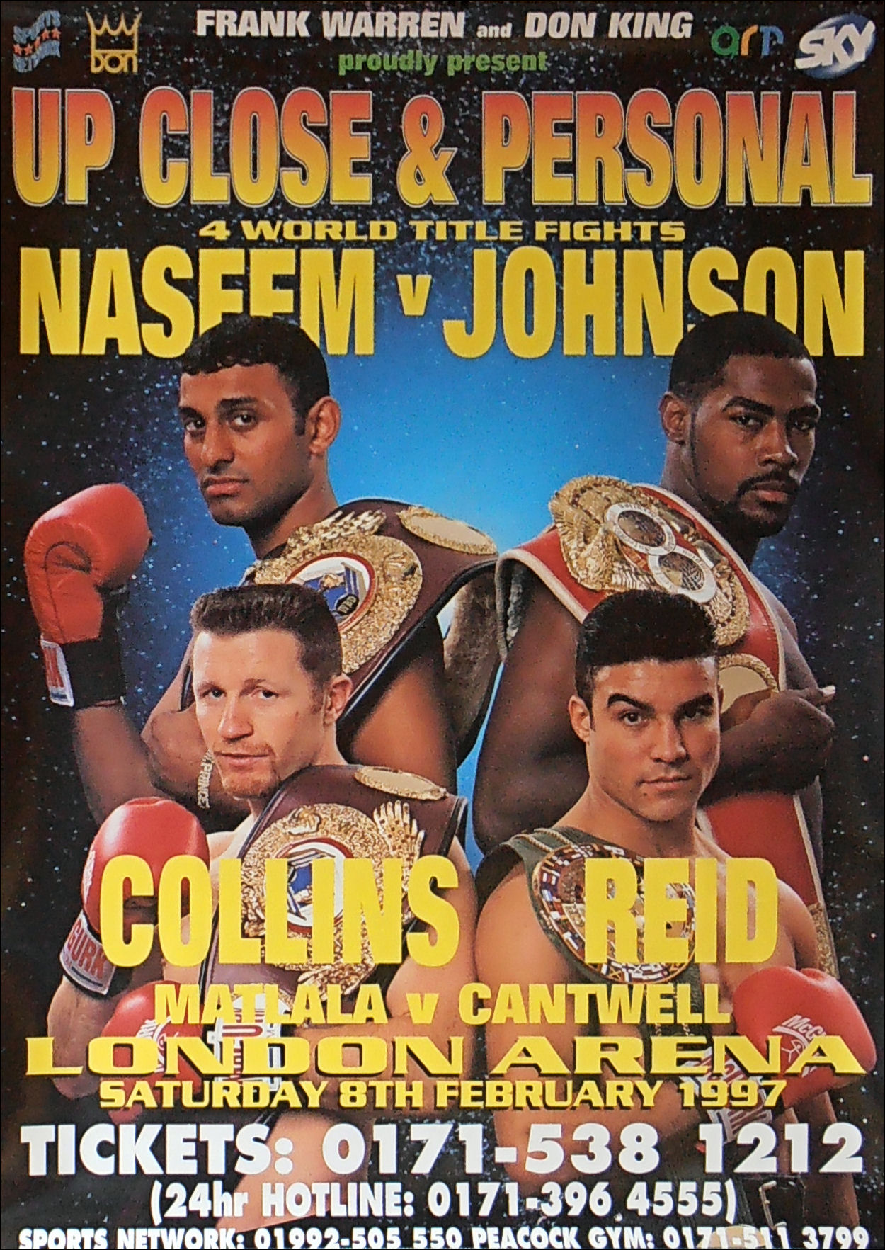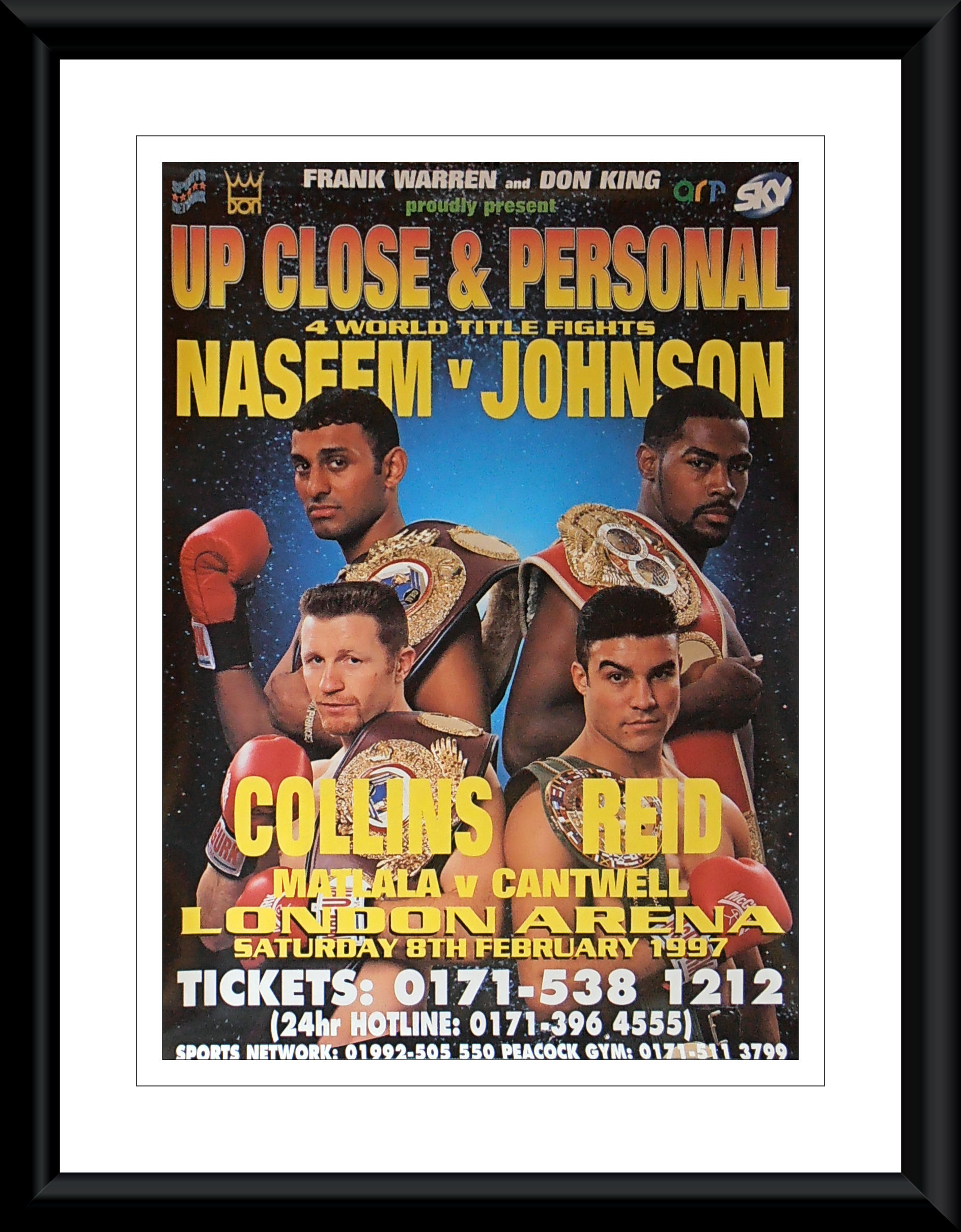 Description : Here we have an original frank warren promotions poster for the WBO & IBF featherweight title unification bout held at the London 'Docklands' Arena, London, England on Saturday 8th February 1997.