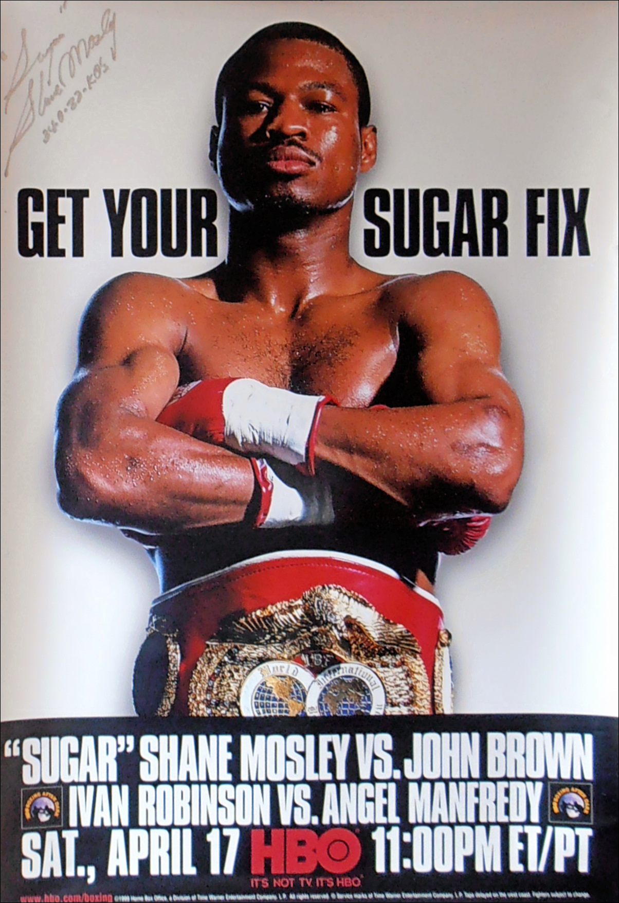 Description : Here we have an original full-size official HBO boxing closed circuit fight poster for the IBF world lightweight championship title bout held at the Fantasy Springs Casino, Indio, California, USA, 17th April 1999....This poster has been signed by Sugar Shane Mosley in silver paint pen.