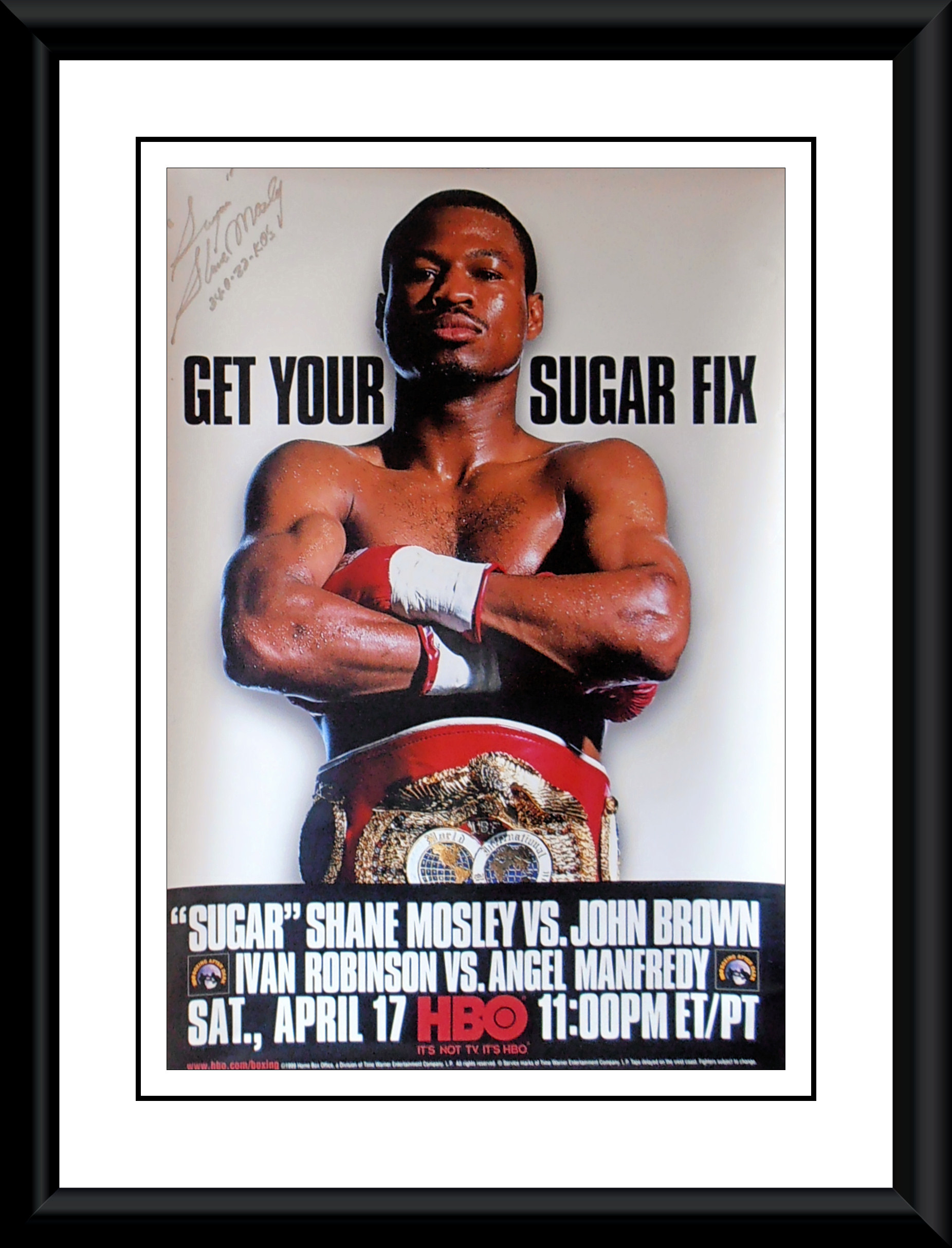 This Sugar Shane Mosley autographed HBO closed circuit fight poster comes with a letter of guarantee of authenticity from KOfightposters.com for a lifetime & beyond.