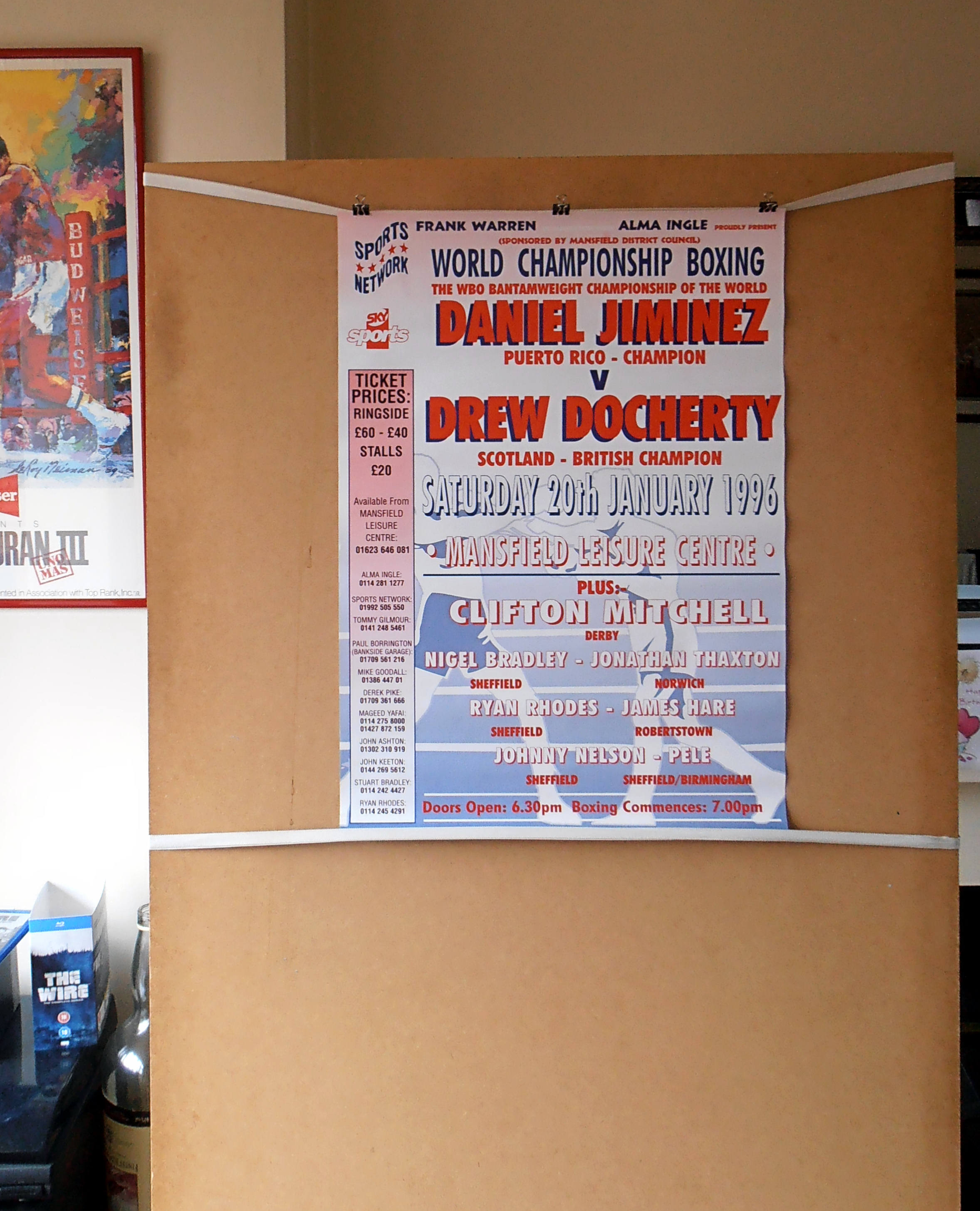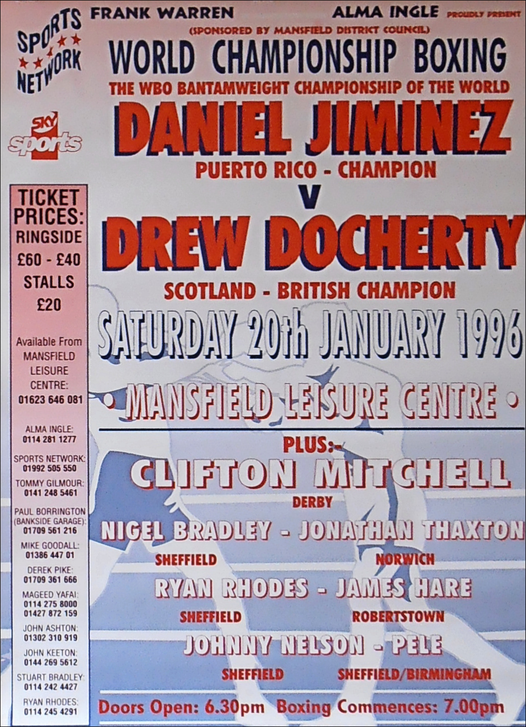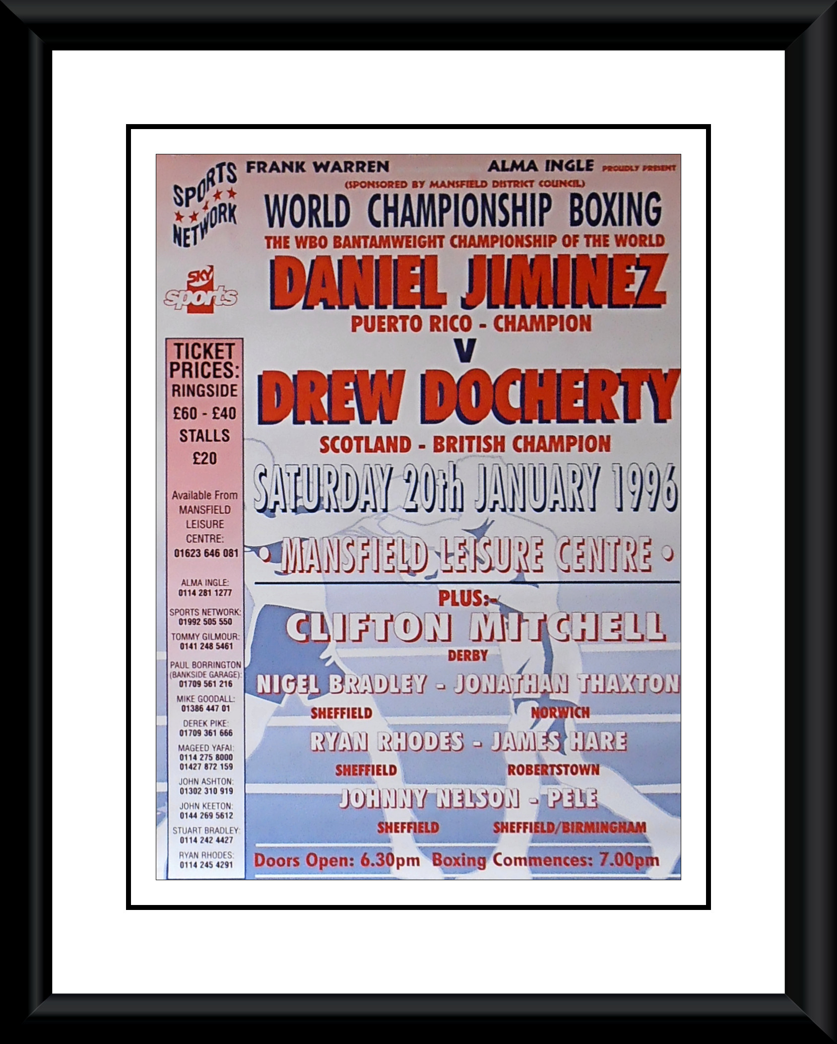 Description : Here we have an original Frank Warren official main event promotional boxing poster for the WBO world bantamweight championship title bout held at the Leisure Centre, Mansfield, Nottinghamshire, United Kingdom, 20th January 1996.