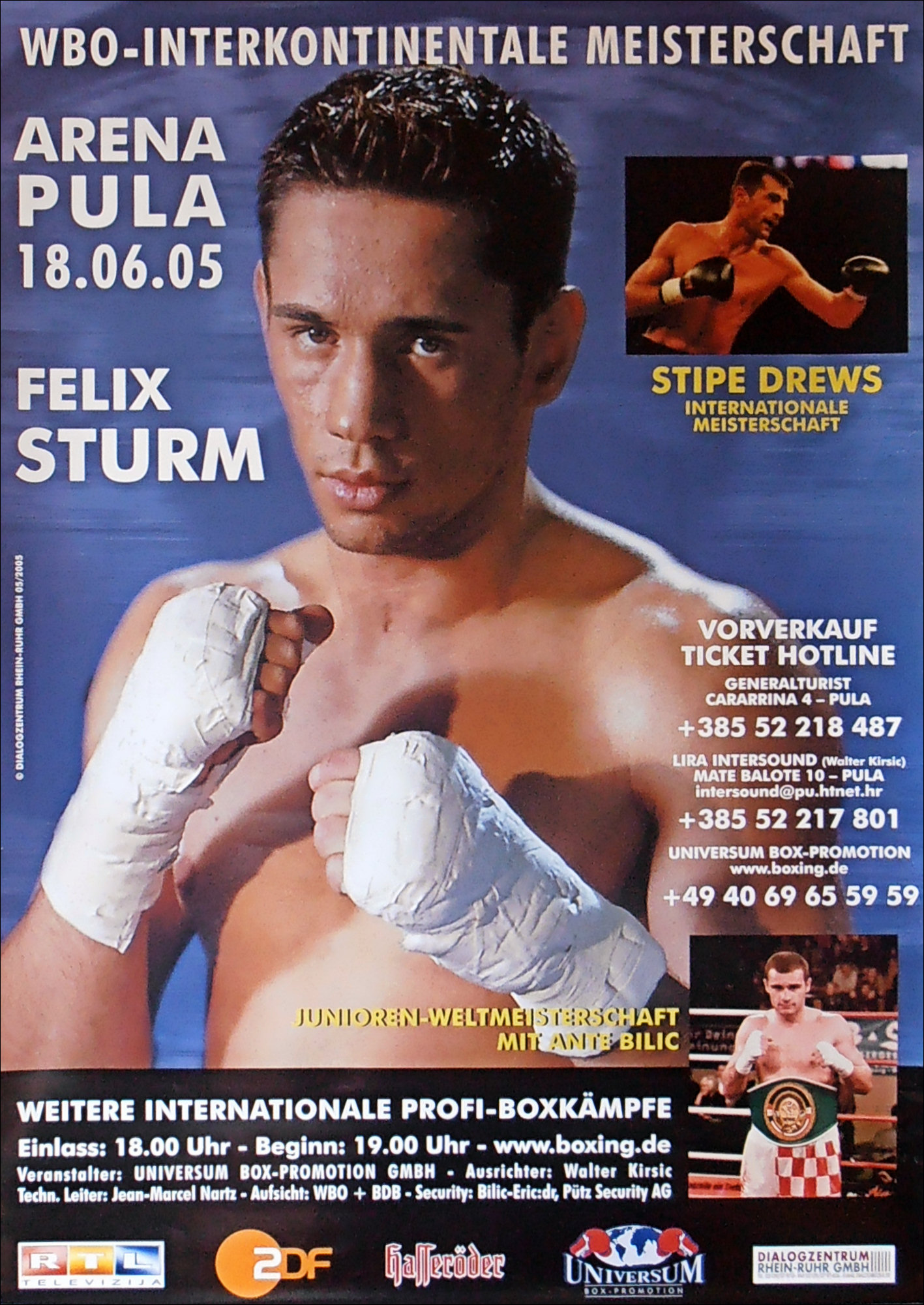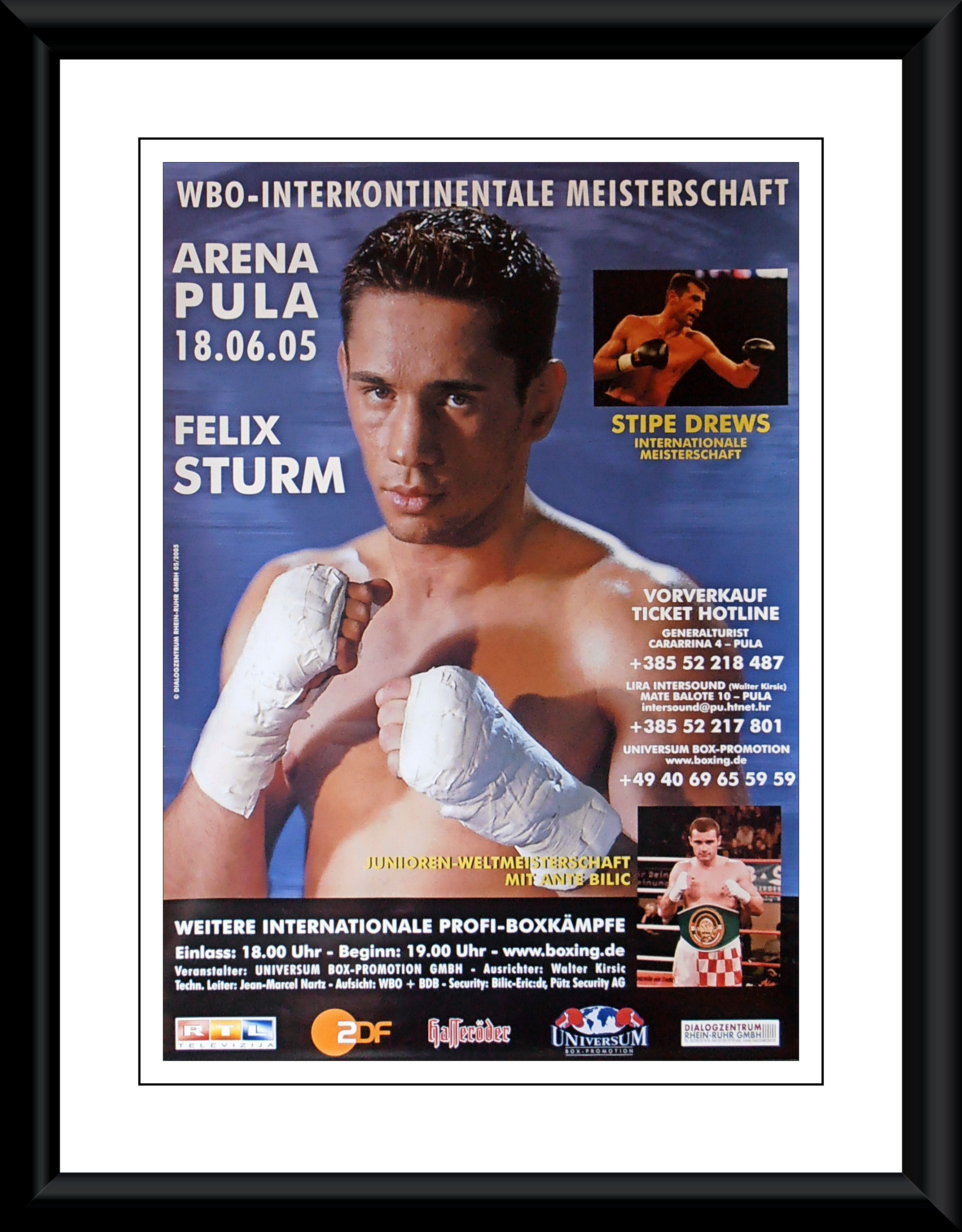 Description : Here we have an original onsite main event boxing poster for the WBO Inter-Continental Middleweight title bout held at the Amphitheater Arena, Pula, Croatia, 18th June 2005.