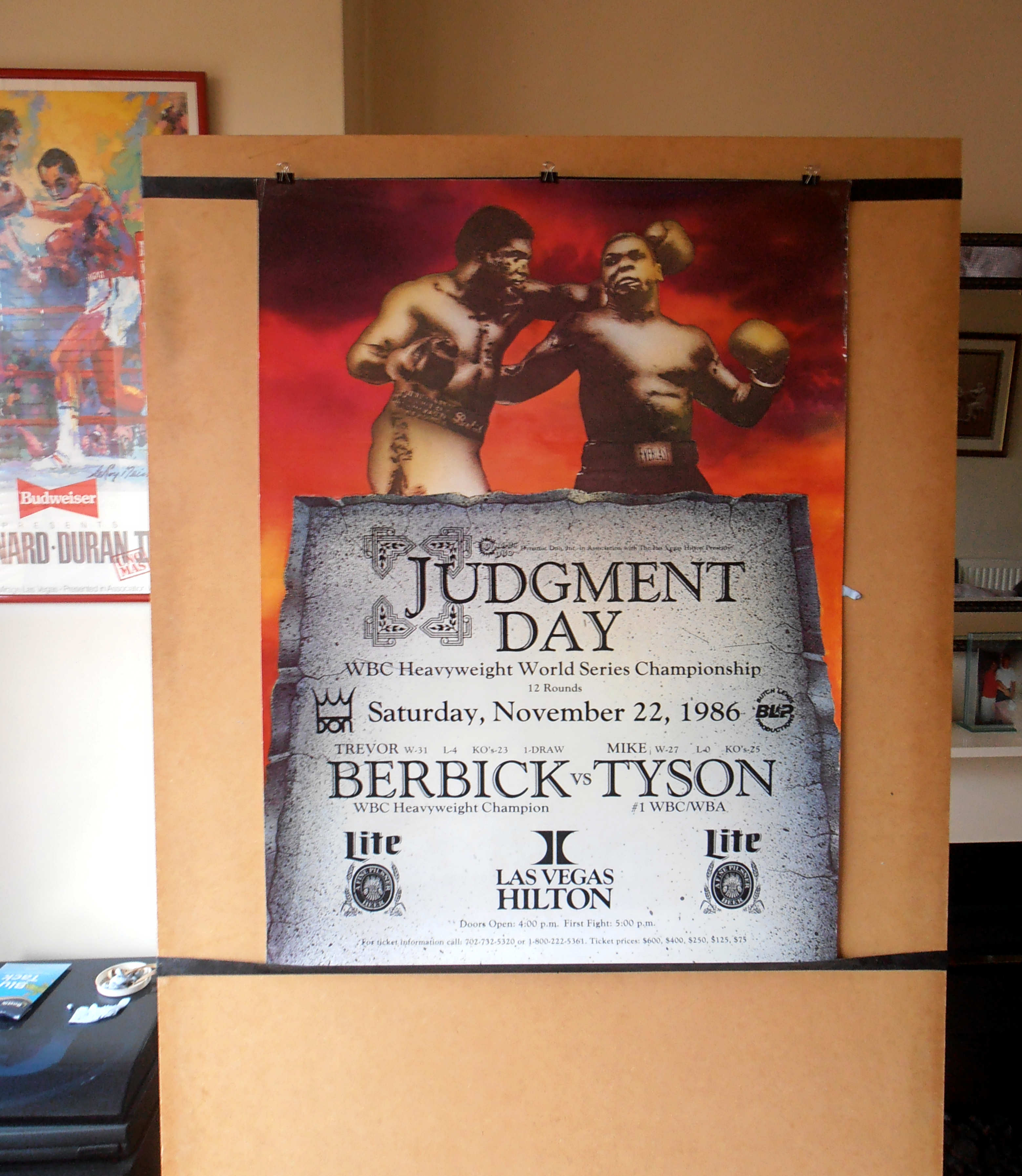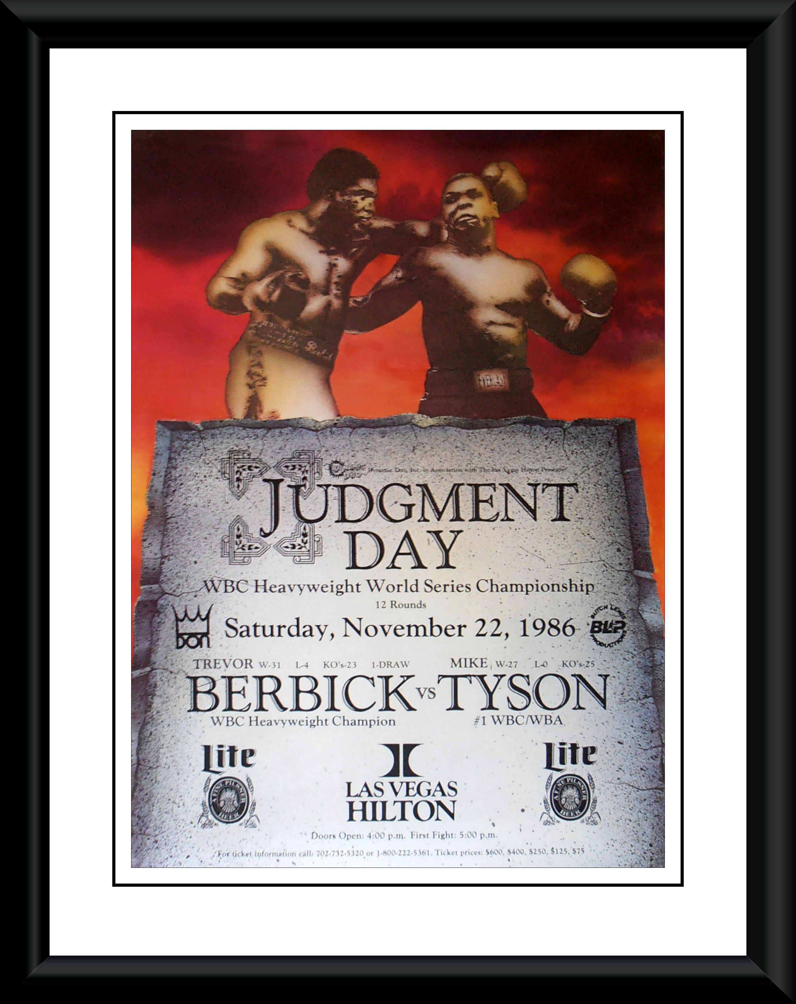 Description : Here we have the official super rare On-Site poster from the Hilton Las Vegas for the WBC world heavyweight championship title bout held on the 22nd November 1986!