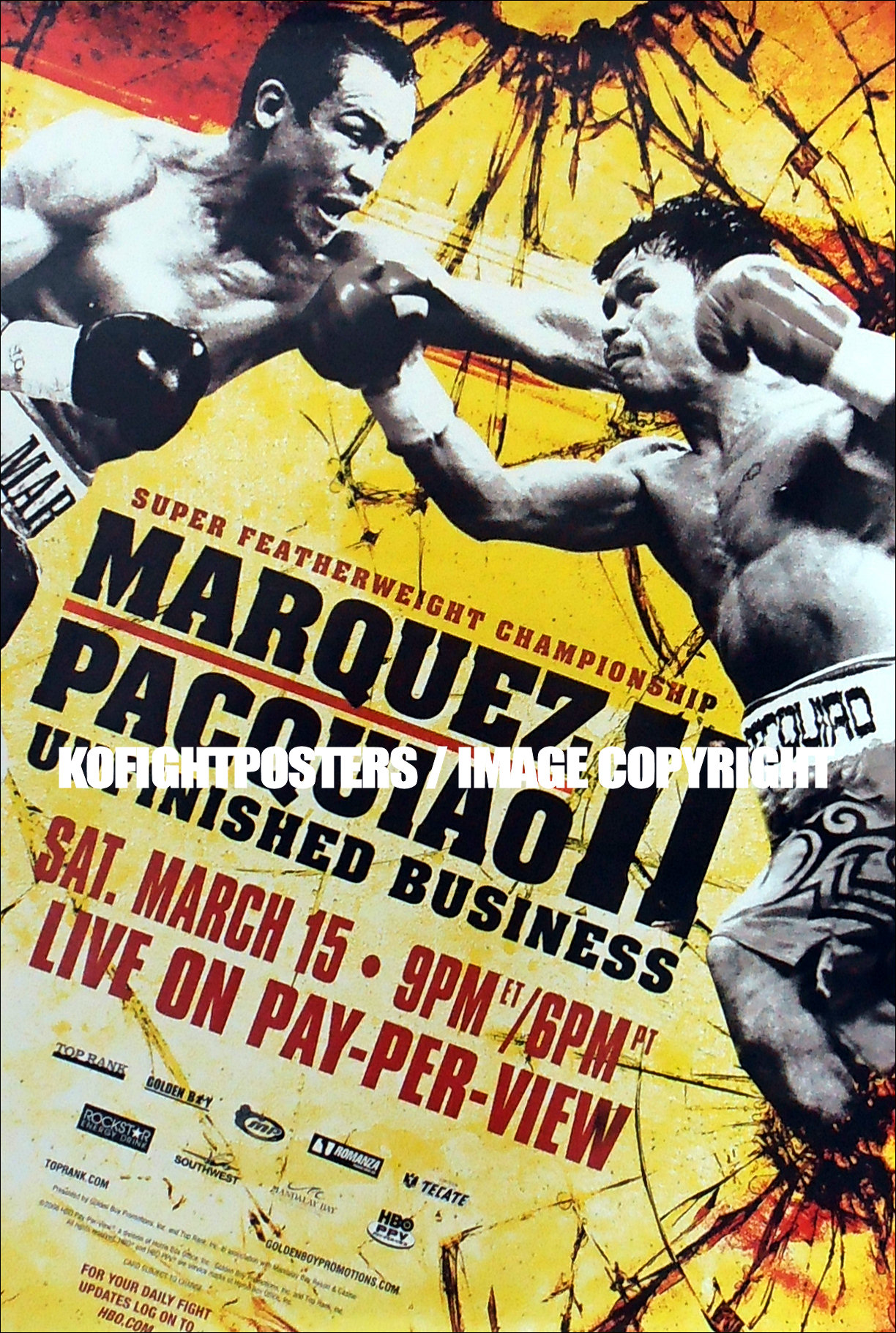Description : Here we have an original full-size HBO boxing pay-per-view closed circuit fight poster for the WBC World super featherweight championship title bout held at the Mandalay Bay Resort & Casino, Las Vegas, Nevada, USA, 15th March 2008.