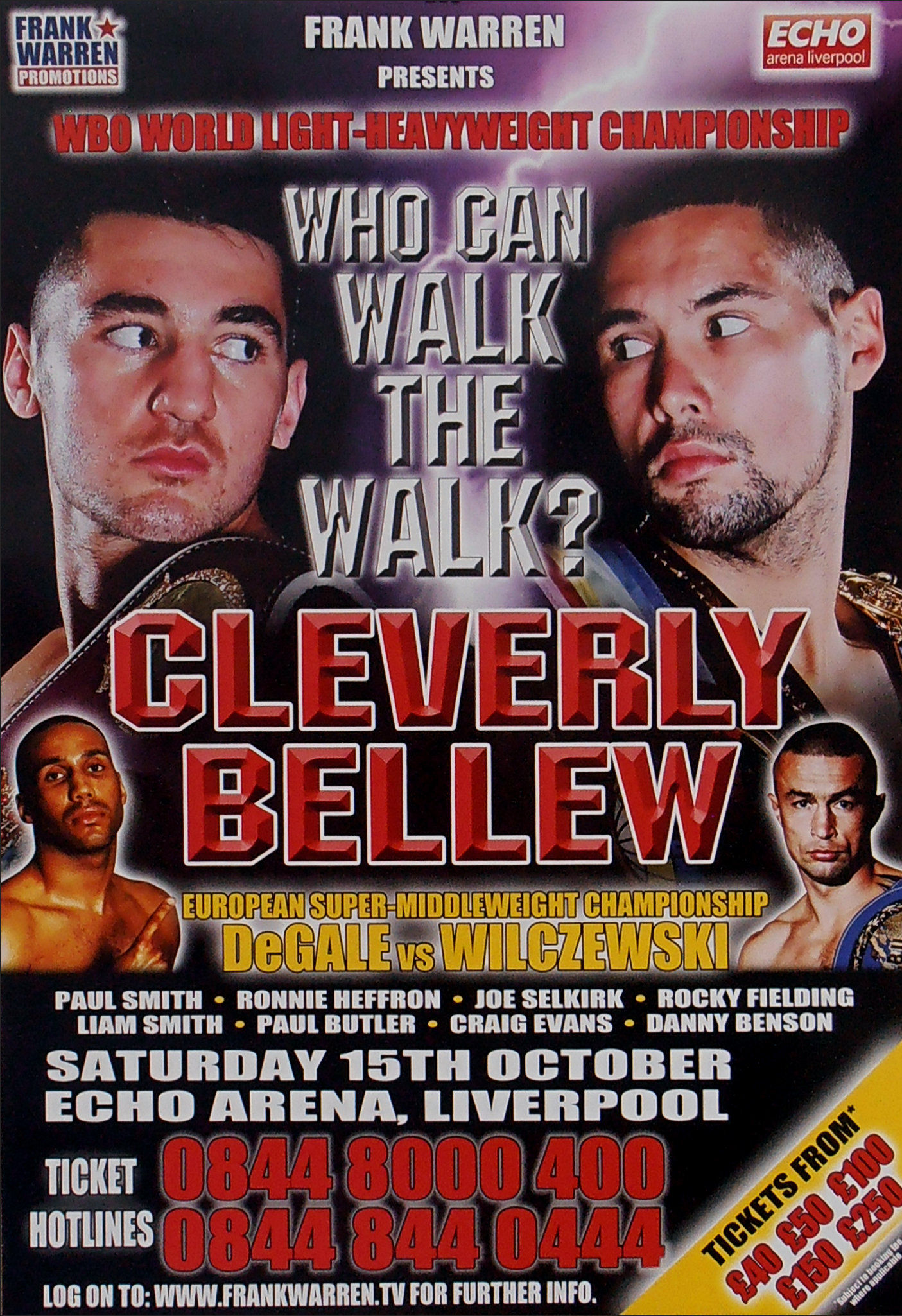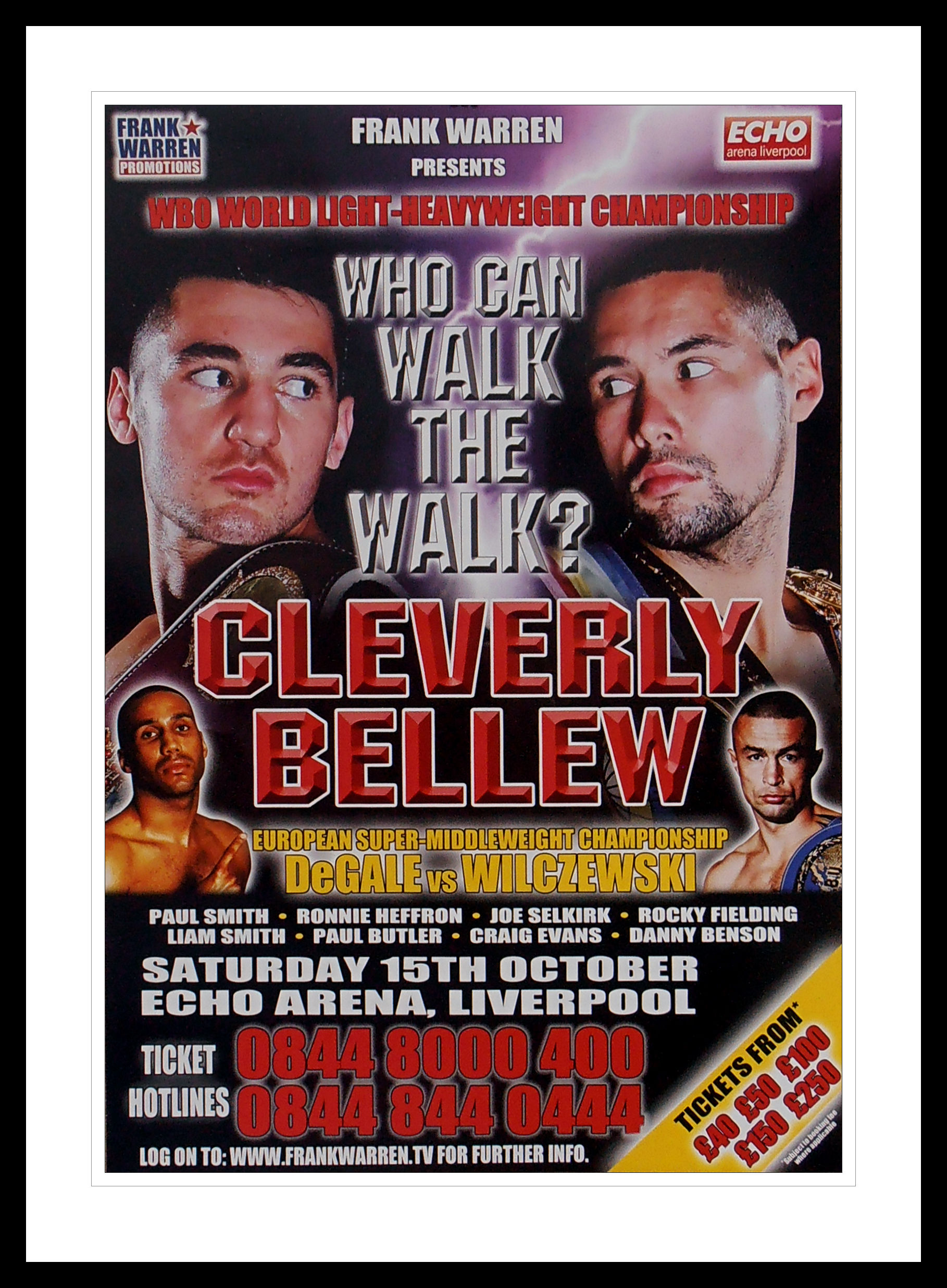 Description : Here we have the official Frank Warren promotions onsite boxing fight poster produced for the WBO World Light Heavyweight Championship Title bout held at the Echo Arena, Liverpool, 15th October 2011.