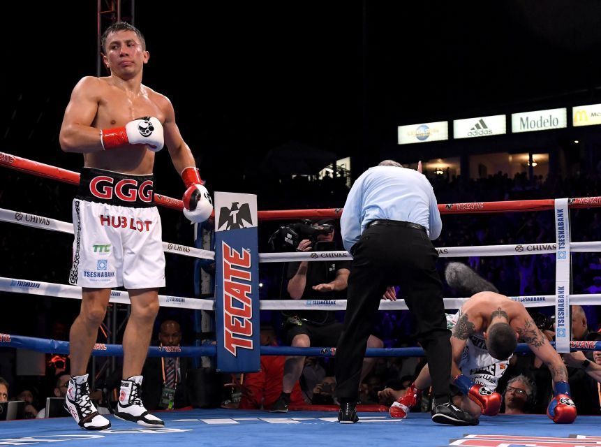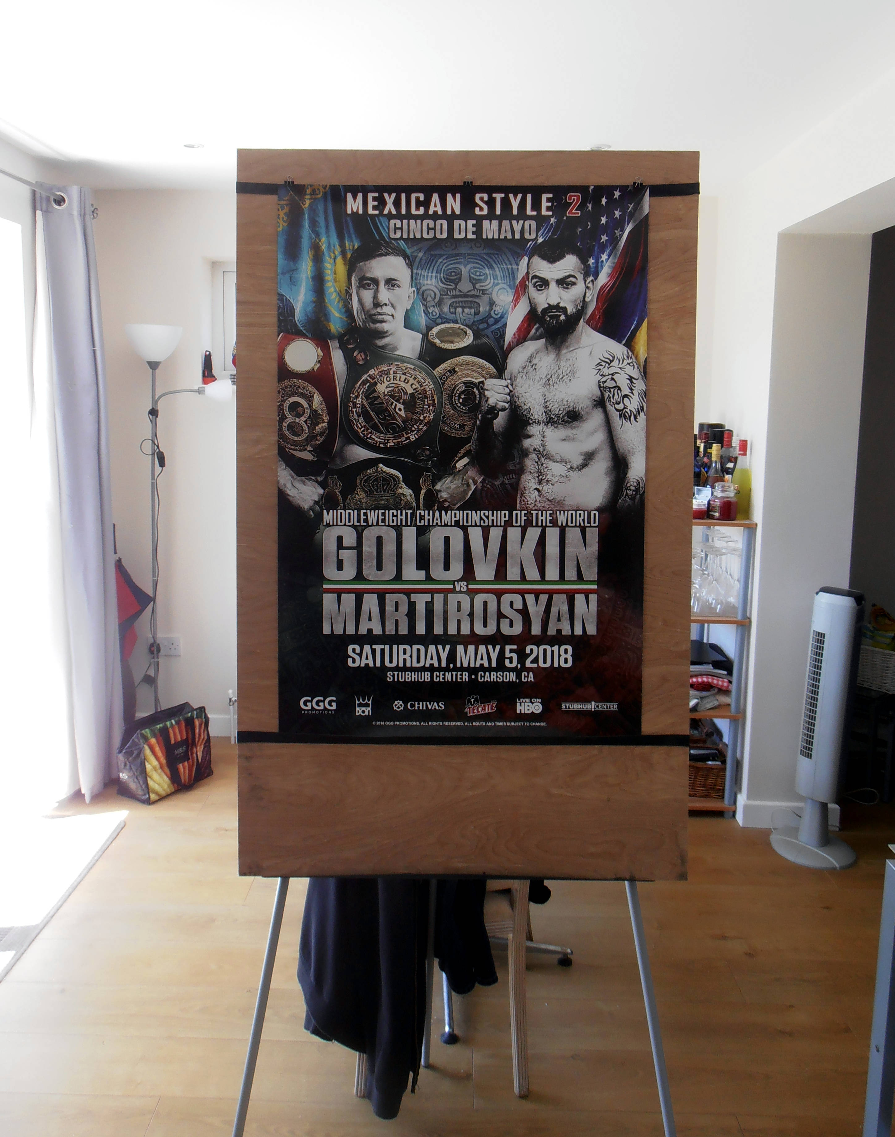 Description : Here we have an original full-size official onsite main event boxing fight poster for the WBA/WBC & IBO world middleweight championship title bout held at the Stub Hub Centre, Carson, California, USA. 5th May 2018.