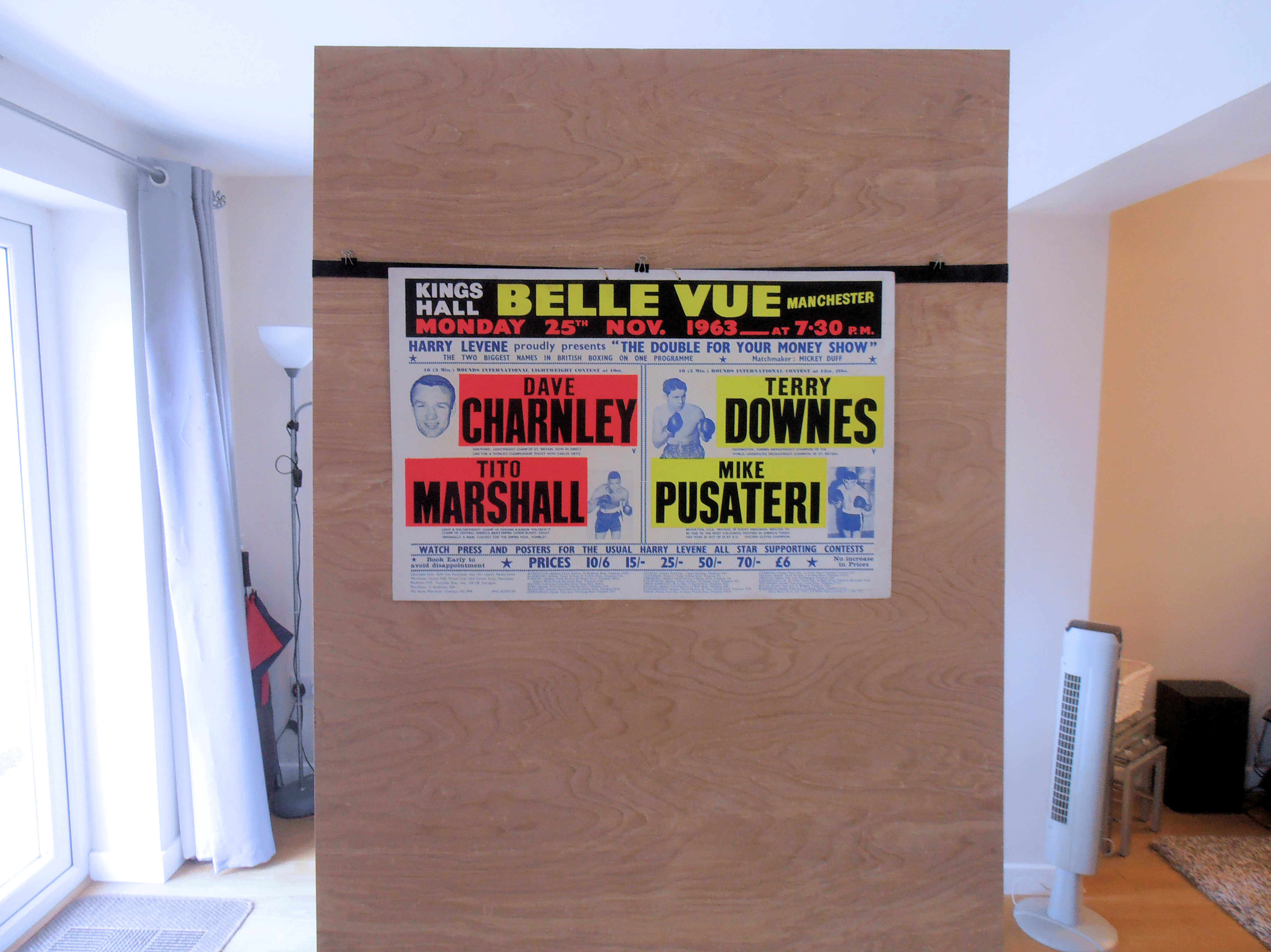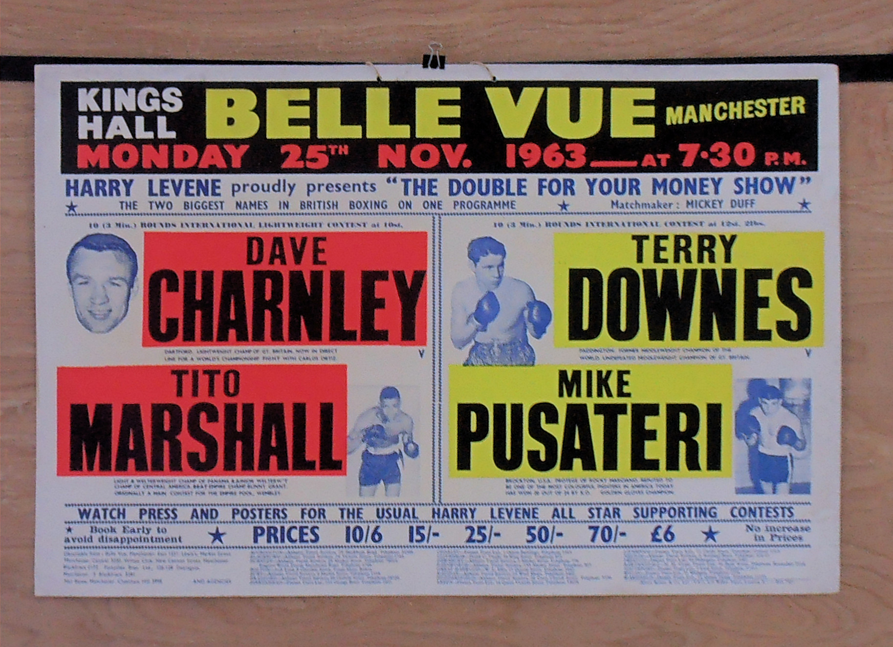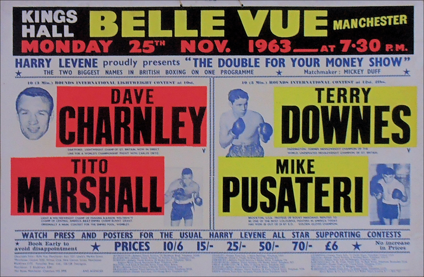 Description : Original vintage onsite boxing fight poster from the King's Hall, Belle Vue, Manchester, Lancashire, England for the 10 round light heavyweight bout on 25th November 1963.