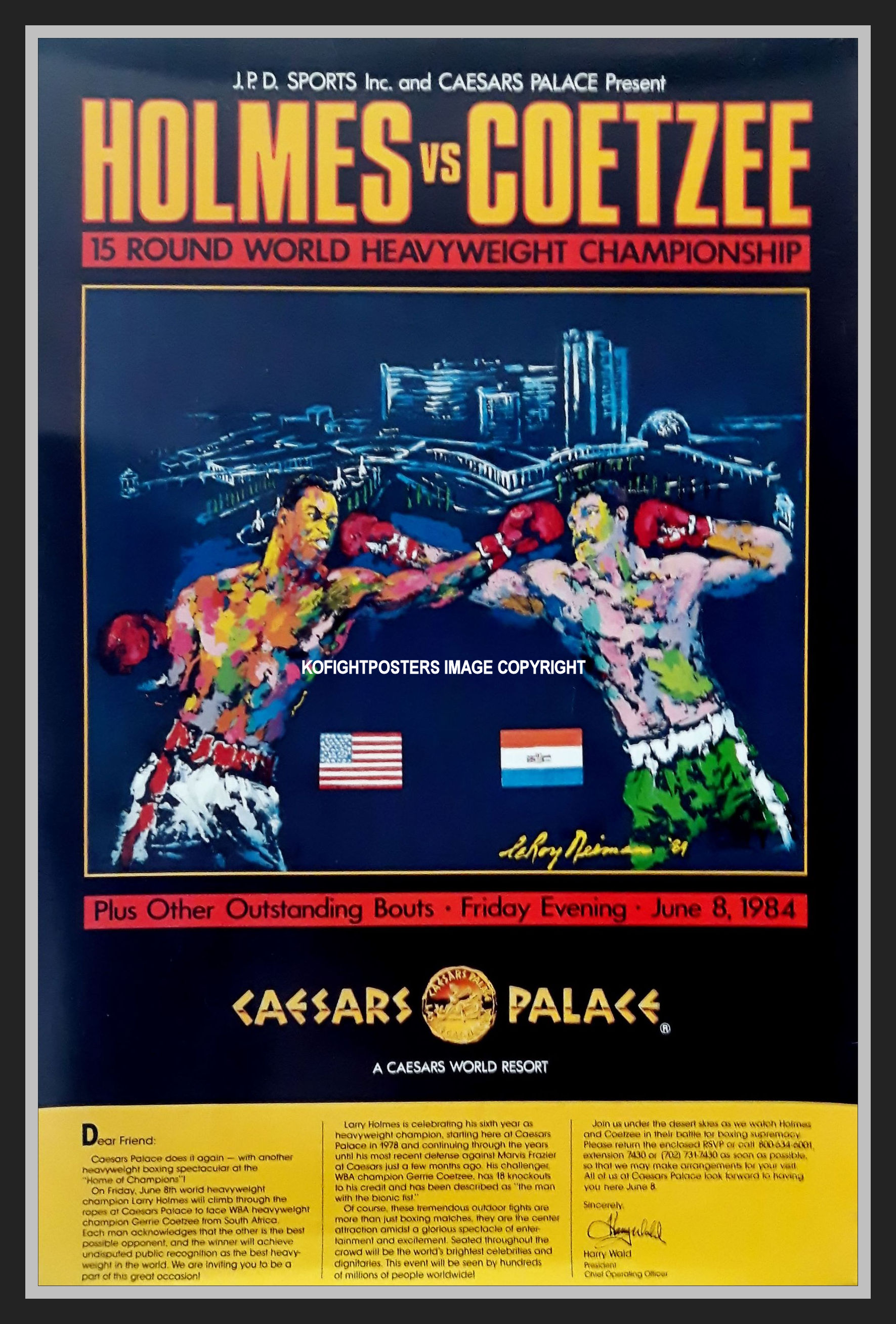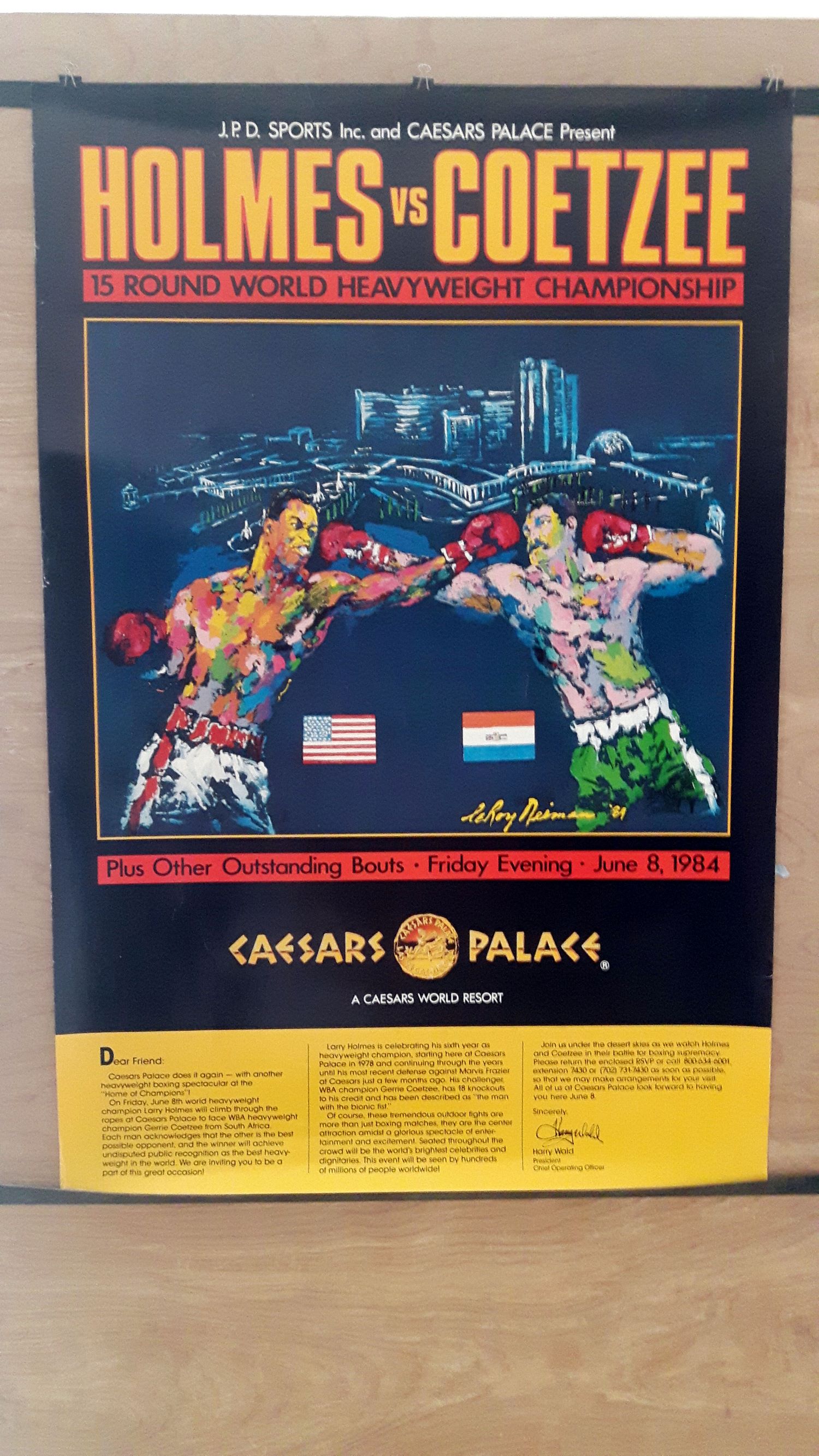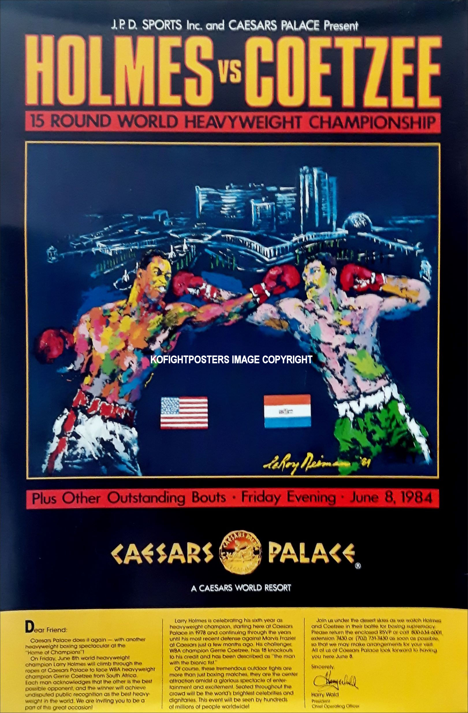Description : Here we have the official Caesars Palace VIP invitee/high roller poster sent only to selected guests (Leroy Neiman art work) onsite poster for the WBC/WBA world heavyweight title unification mega-fight between WBC champion Holmes & South African WBA world heavyweight title holder Gerrie Coetzee.