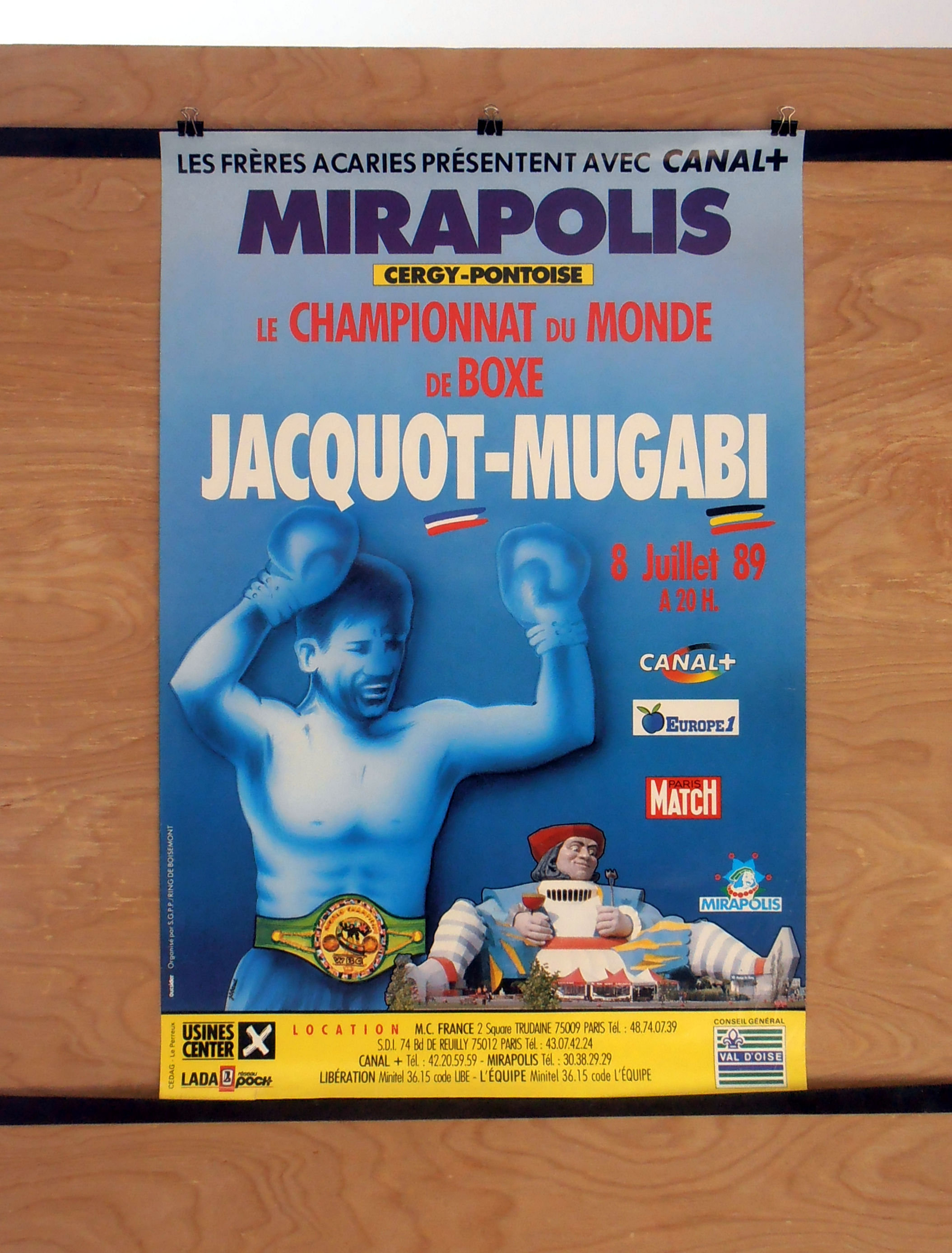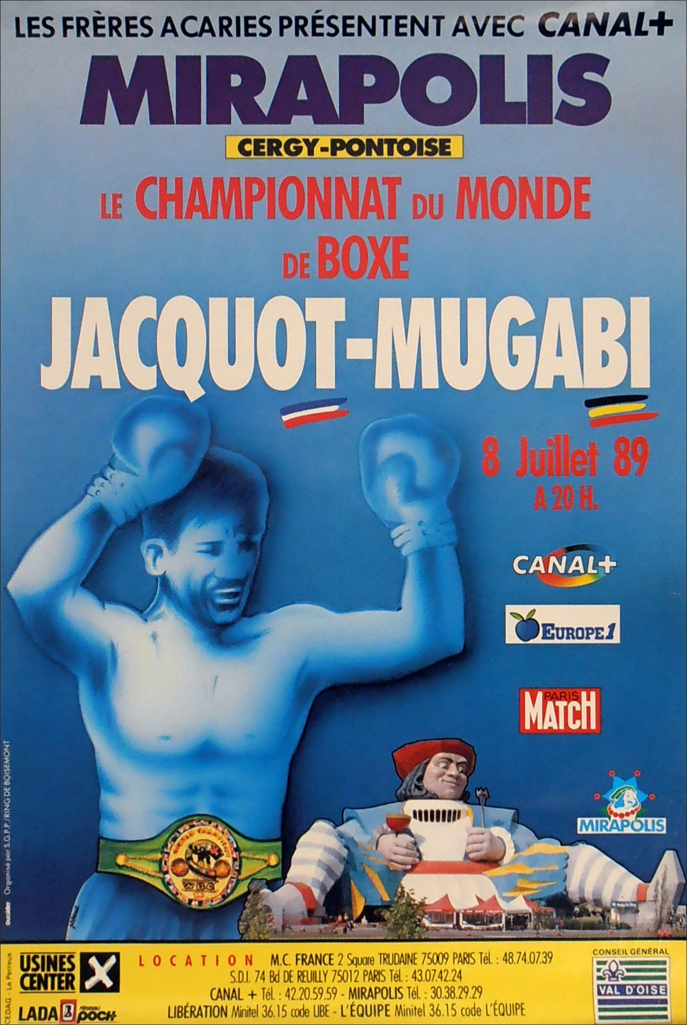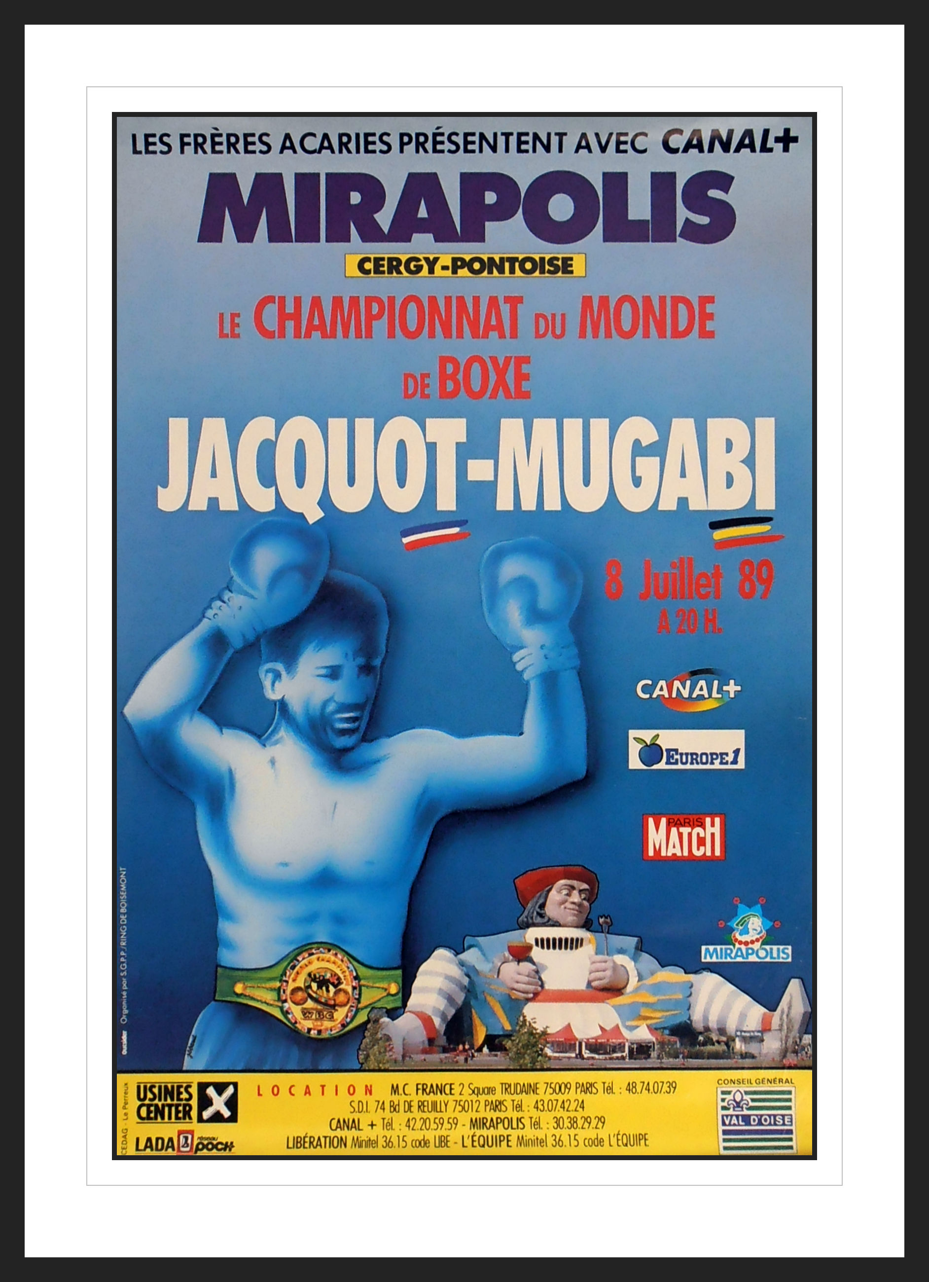 Description : Here we have an original onsite boxing fight poster produced by 'PARIS MATCH' for the WBC World Super/Welterweight Championship Title bout held at the Mirapolis, Cergy-Pontoise, Val-d'Oise, France, 8th July 1989.