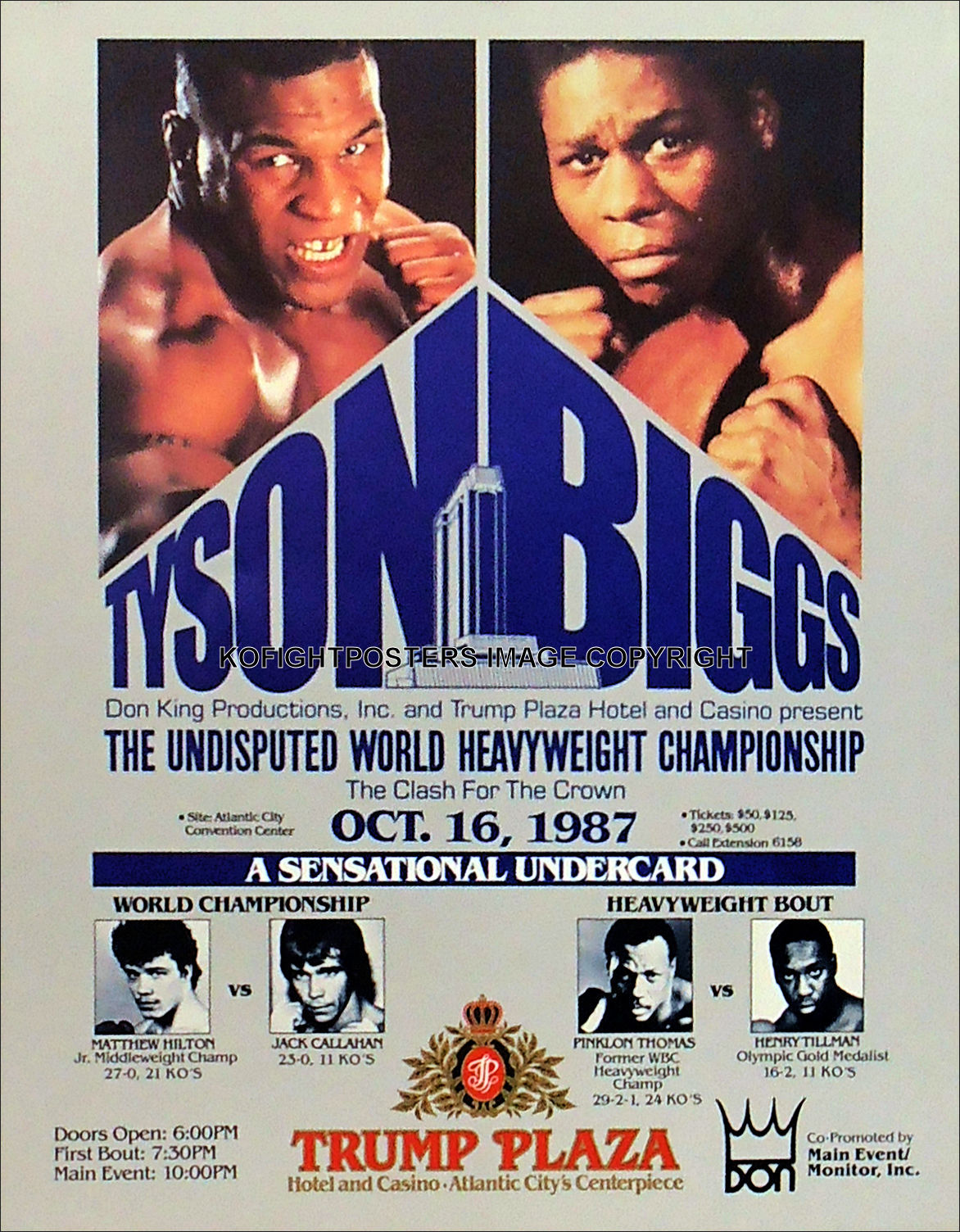 Description : Here we have an original vintage onsite poster for the undisputed world heavyweight championship title bout held at the Trump Plaza Convention Hall, Atlantic City, New Jersey USA. 16th October 1987.