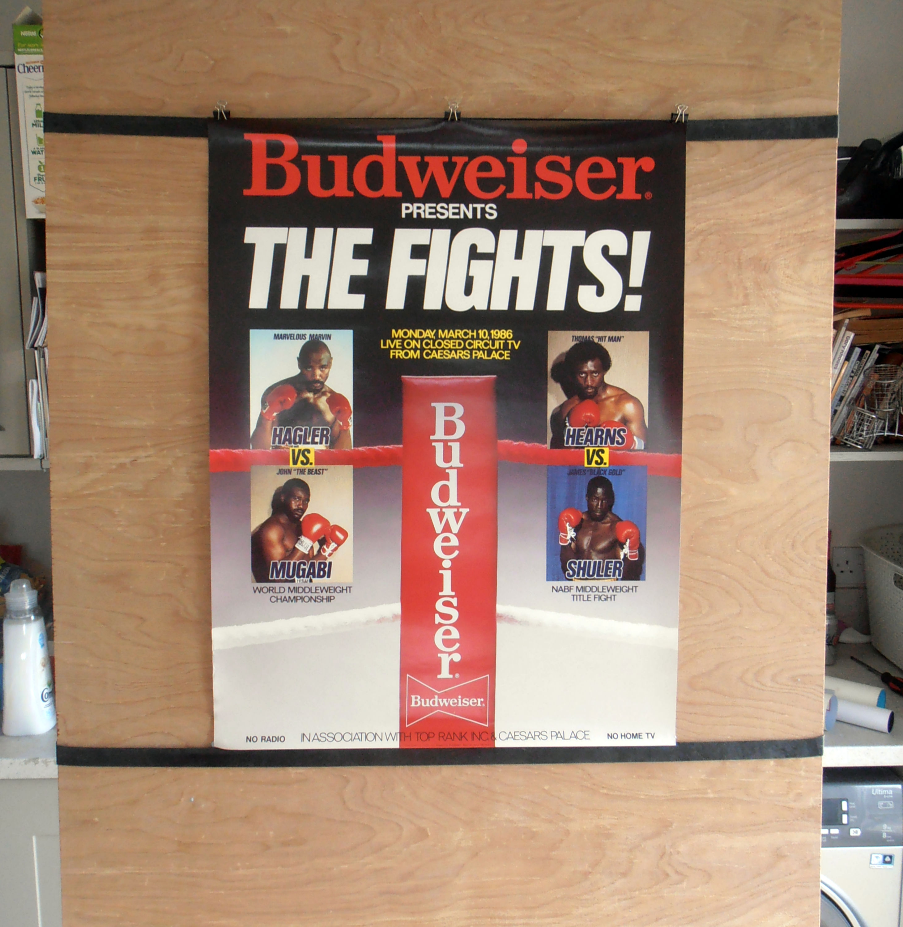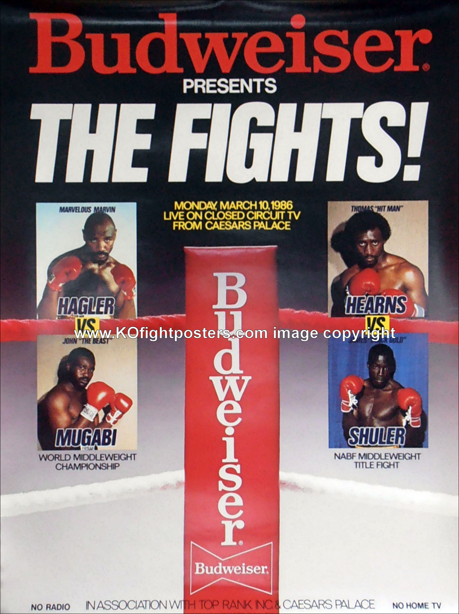 Description : Here we have the super-rare 'Budweiser' official fight night sponsors closed circuit poster for the Undisputed World Middleweight Title. Caesars Palace, Las Vegas, USA. 10th March 1986.