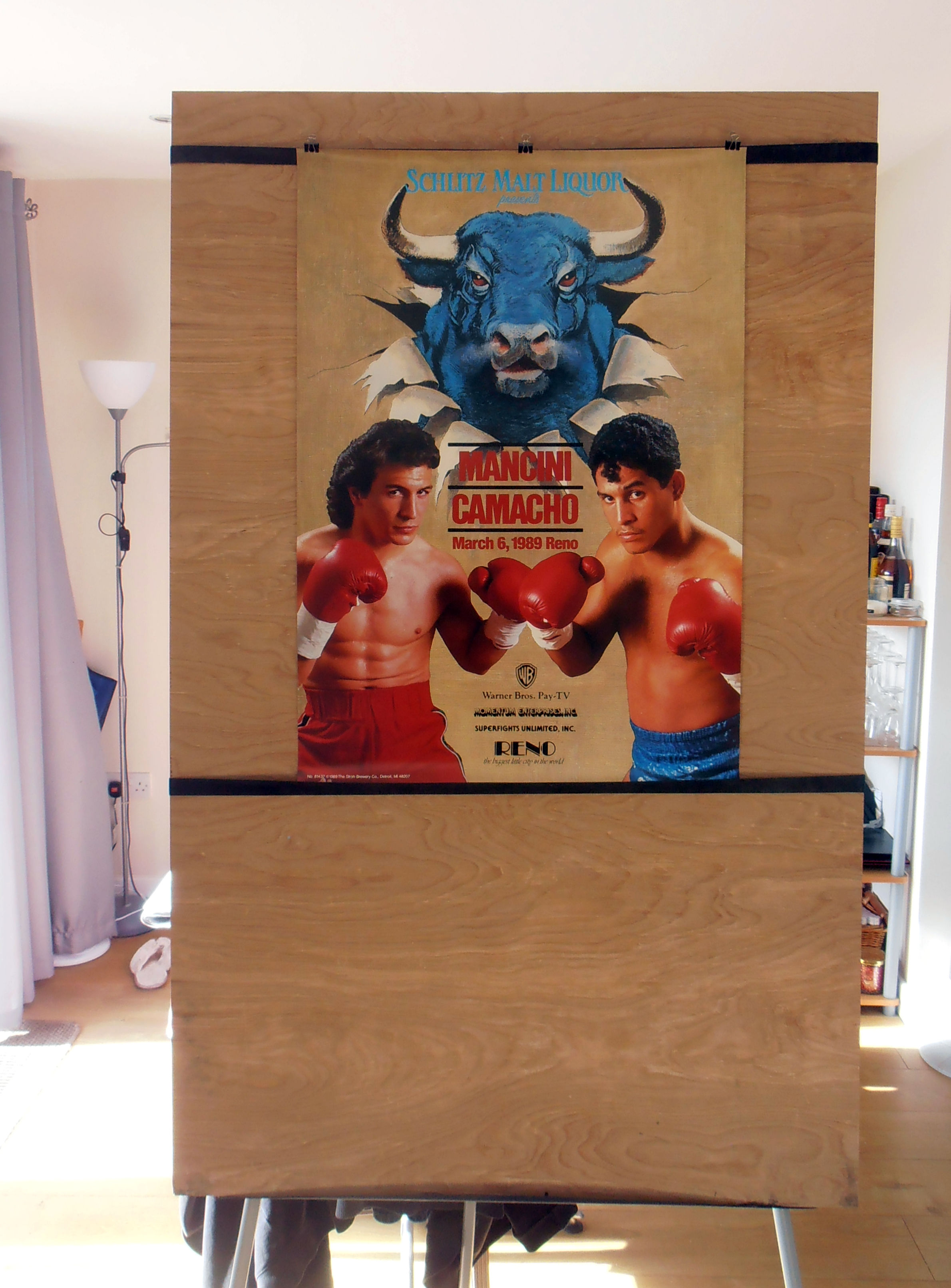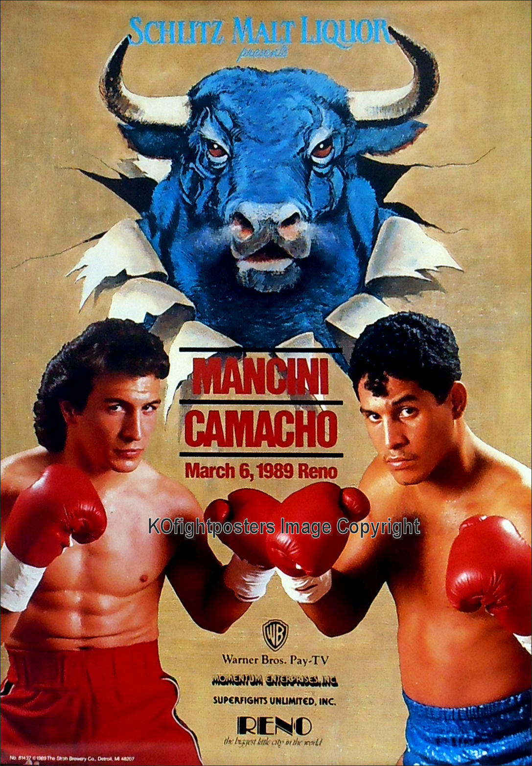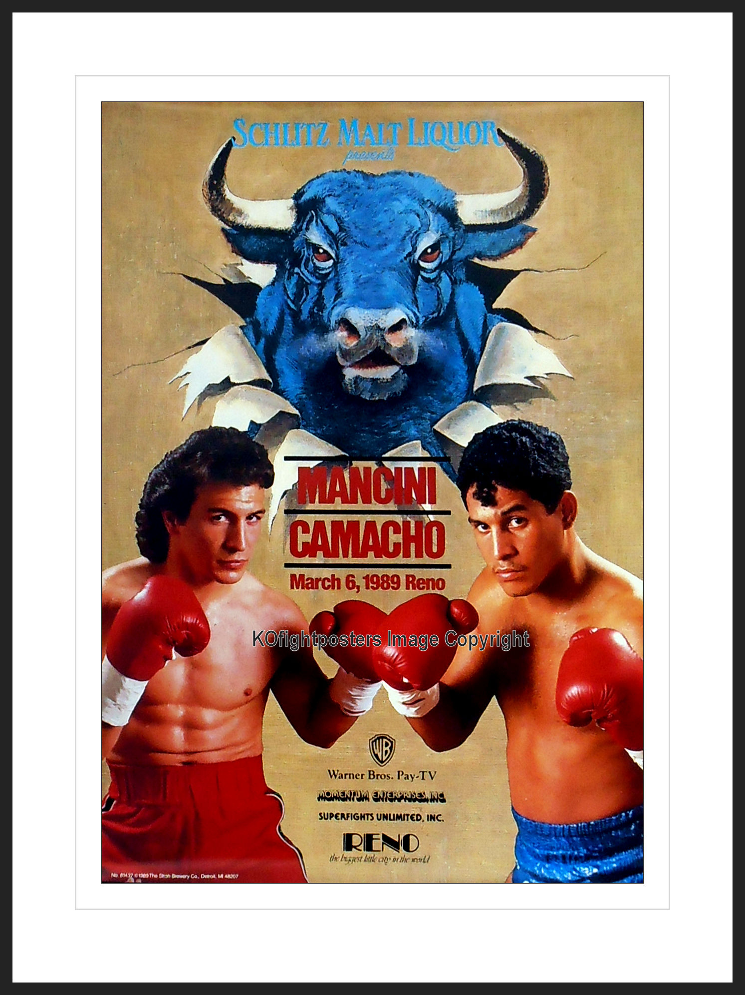 Description : Here we have an original onsite official fight sponsors boxing poster for the much anticipated comeback of the former WBA lightweight champion Ray "Boom Boom" Mancini who was contesting the WBO world super lightweight title. Lawlor Events Center, Reno, Nevada, USA, 6th March 1989.