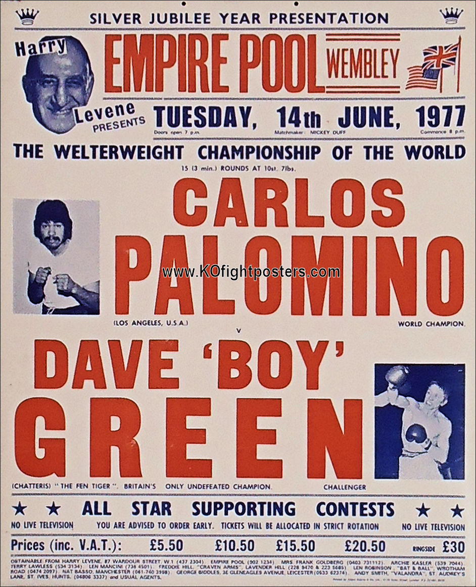 Reigning & defending WBC world welterweight champion Carlos Palomino was making his 2nd visit to these shores after defeating Britain's John H Stracey to lift the crown the previous year. He was facing the No2 contender in the rough, tough Englishman Dave 'Boy' Green.