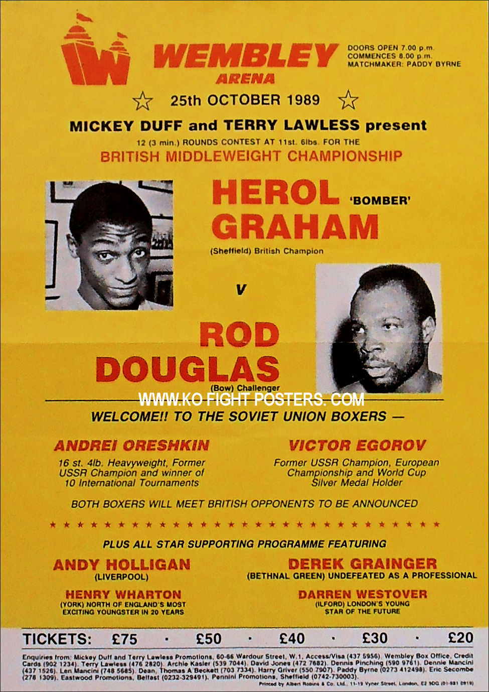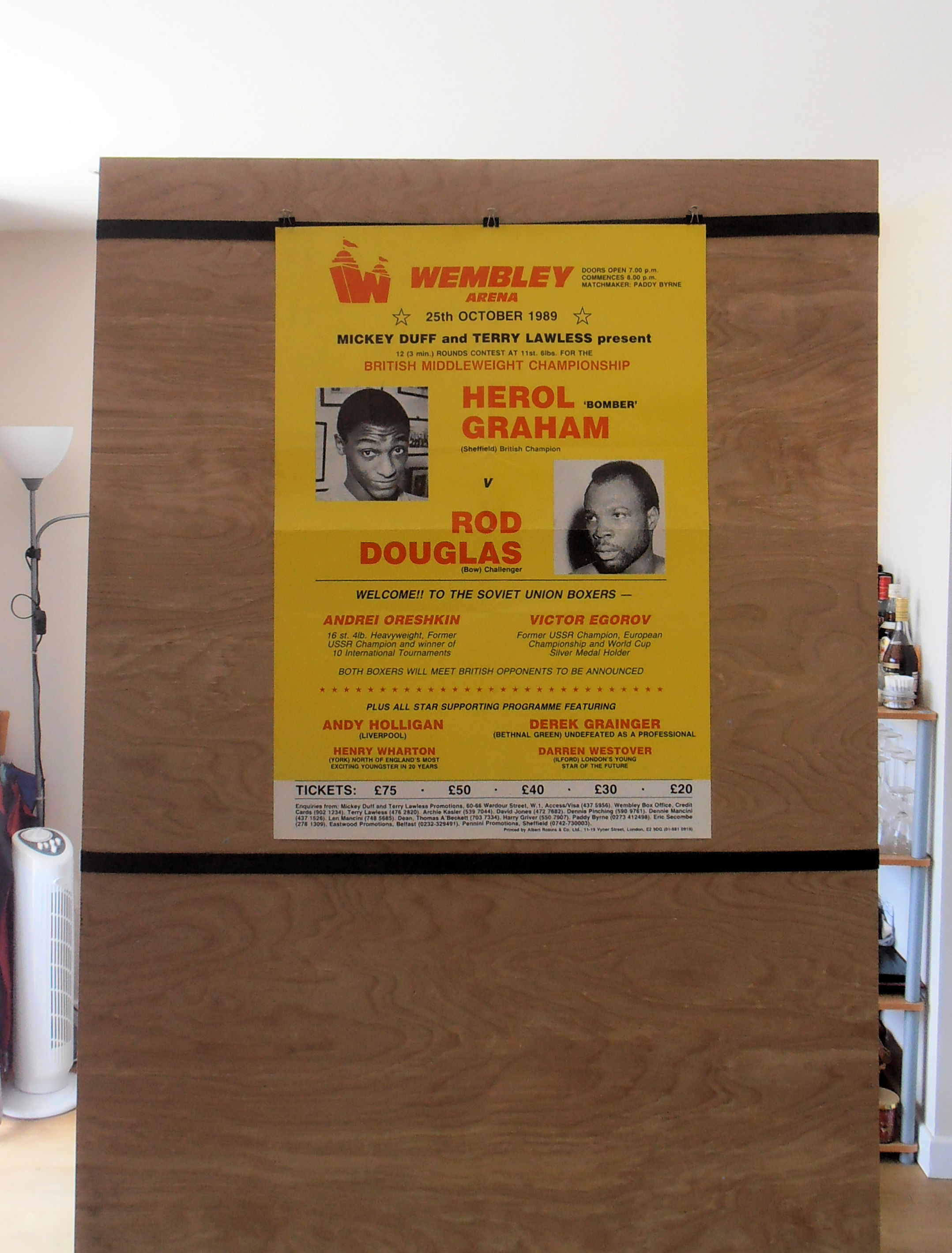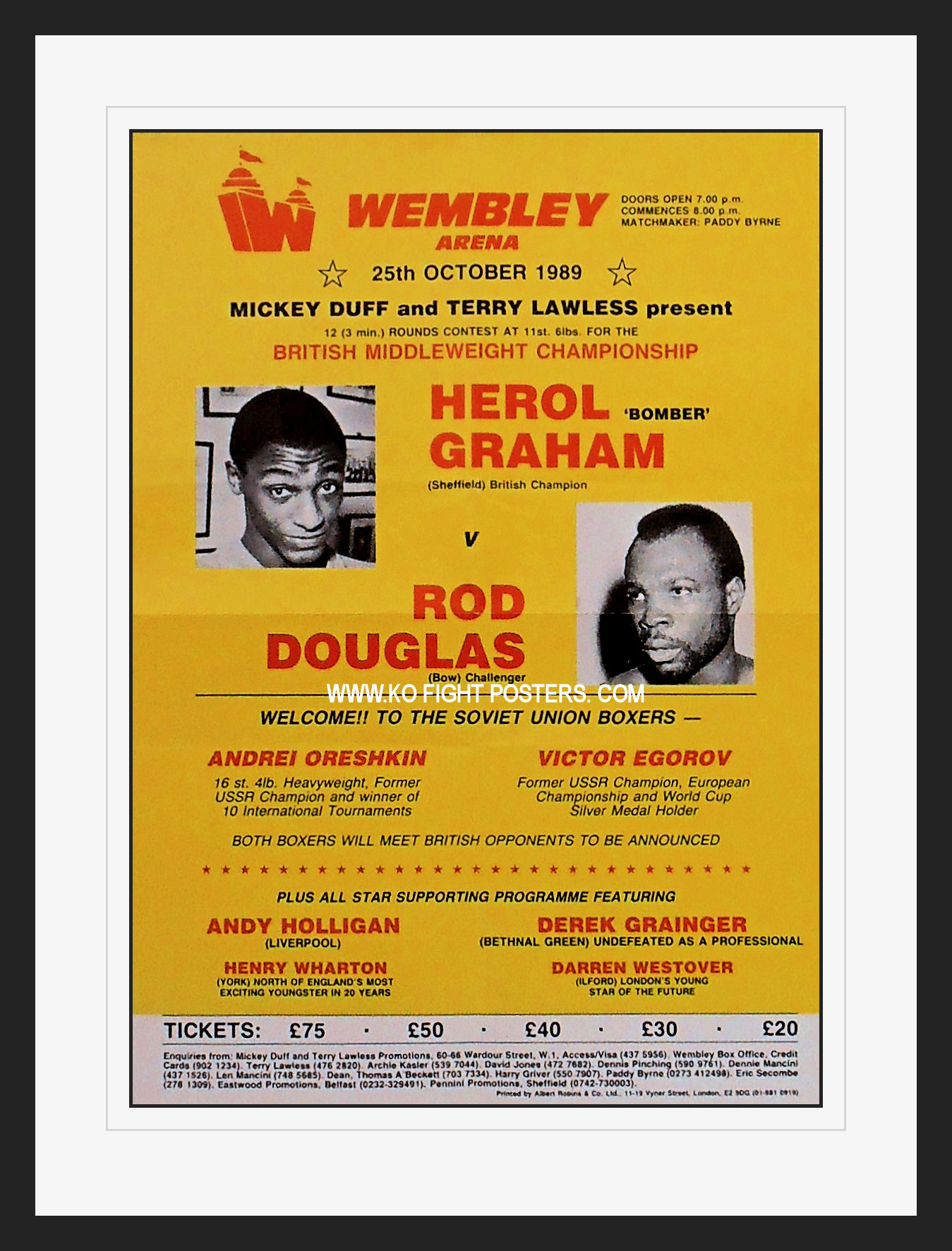 Description : Here we have an original official onsite boxing fight poster for the British middleweight championship title bout. Wembley Arena, Wembley, London, England, 25th October 1989.