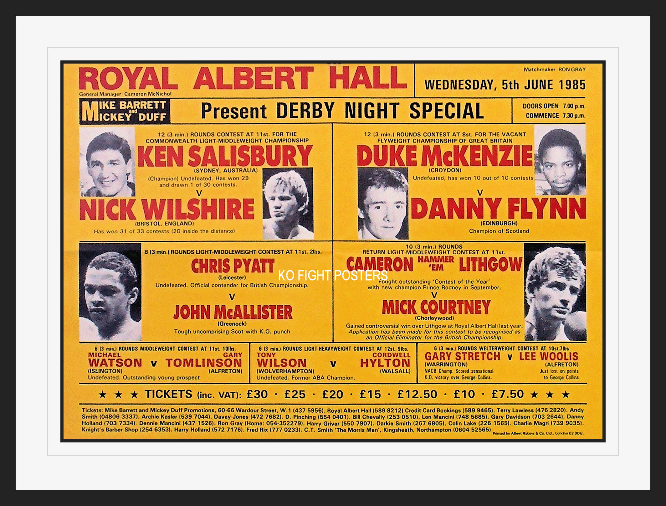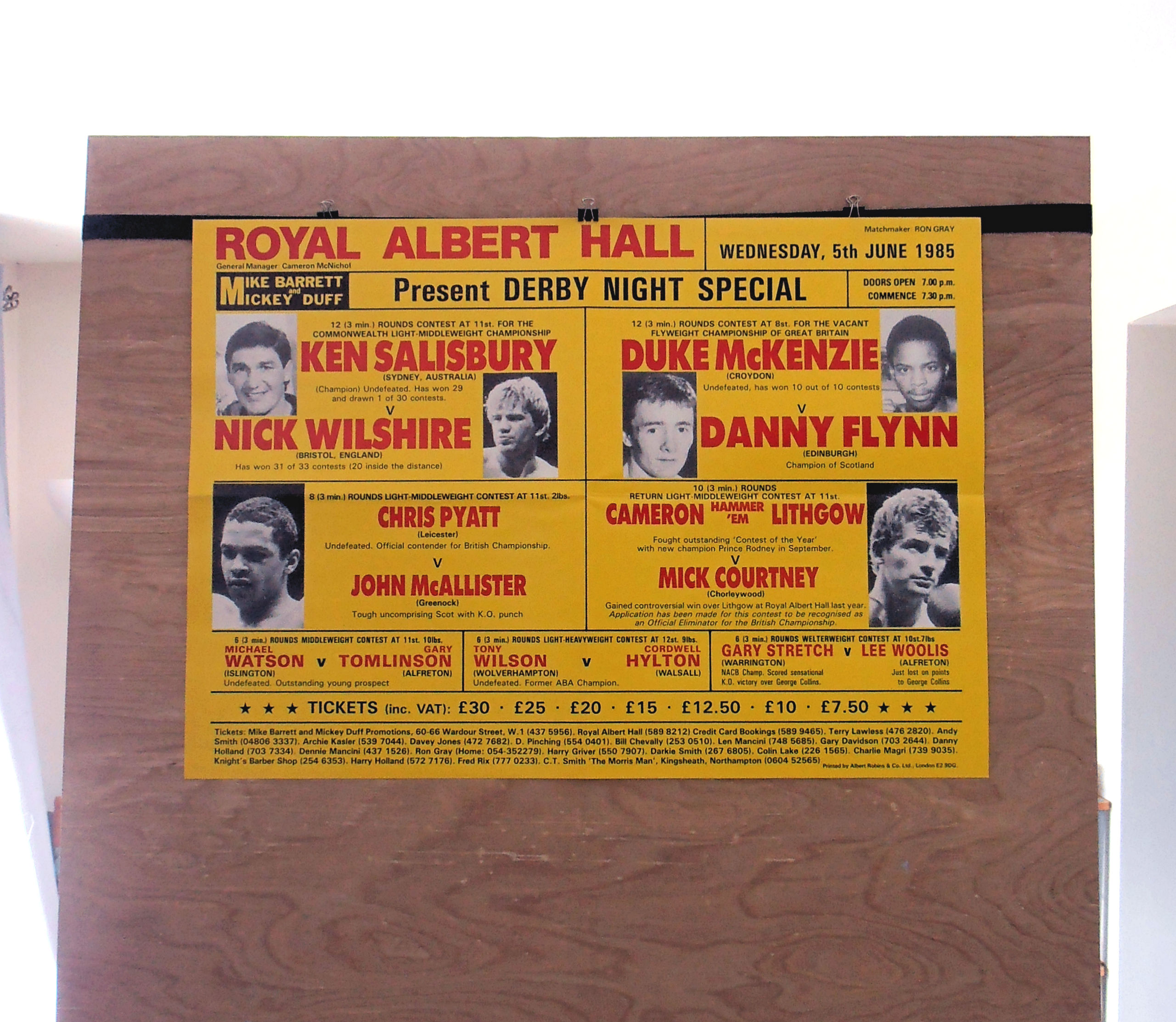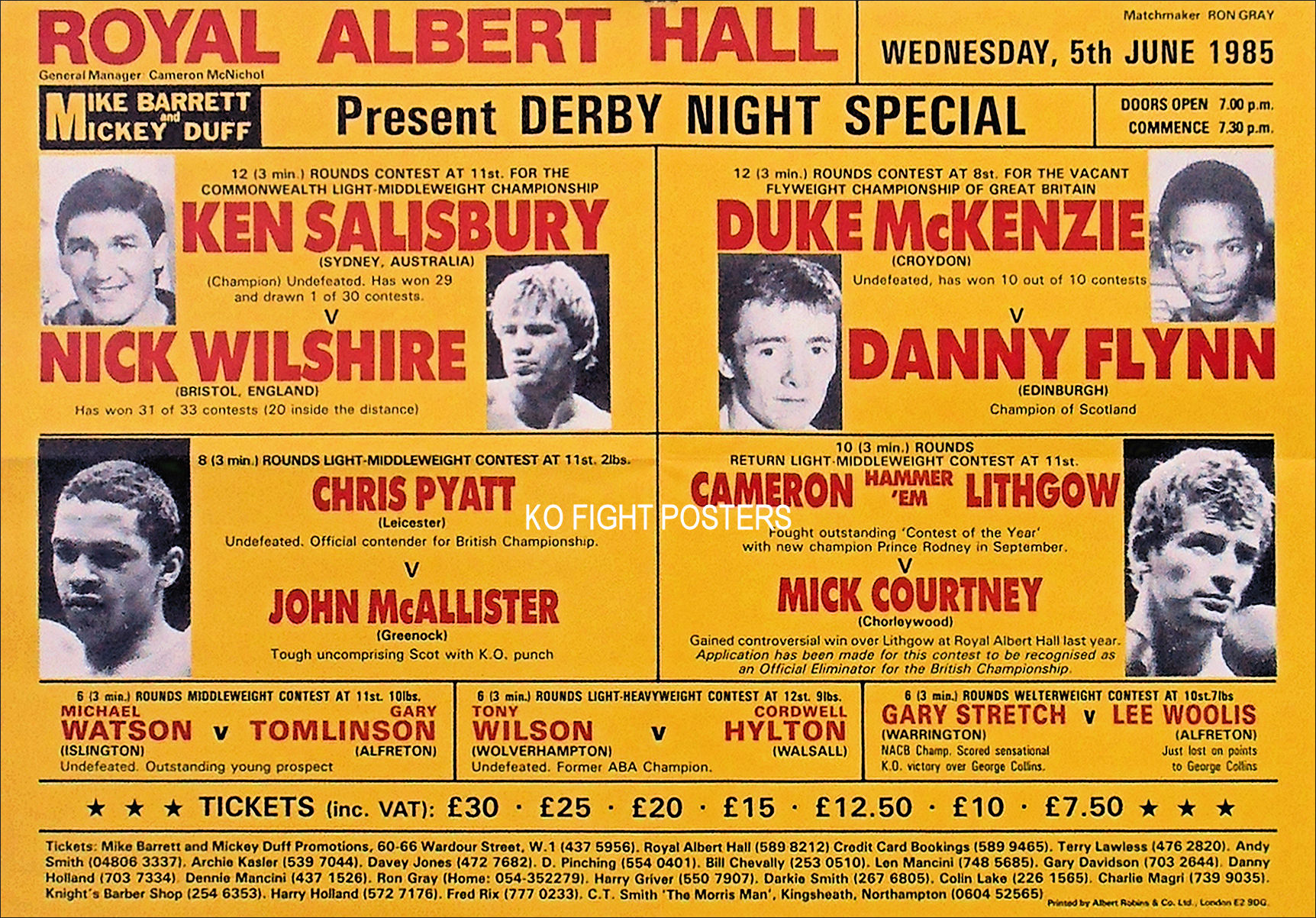 Description : Here we have an original official onsite boxing fight poster for the vacant BBBoC flyweight championship bout. Royal Albert Hall, Kensington London, England, 5th June 1985.