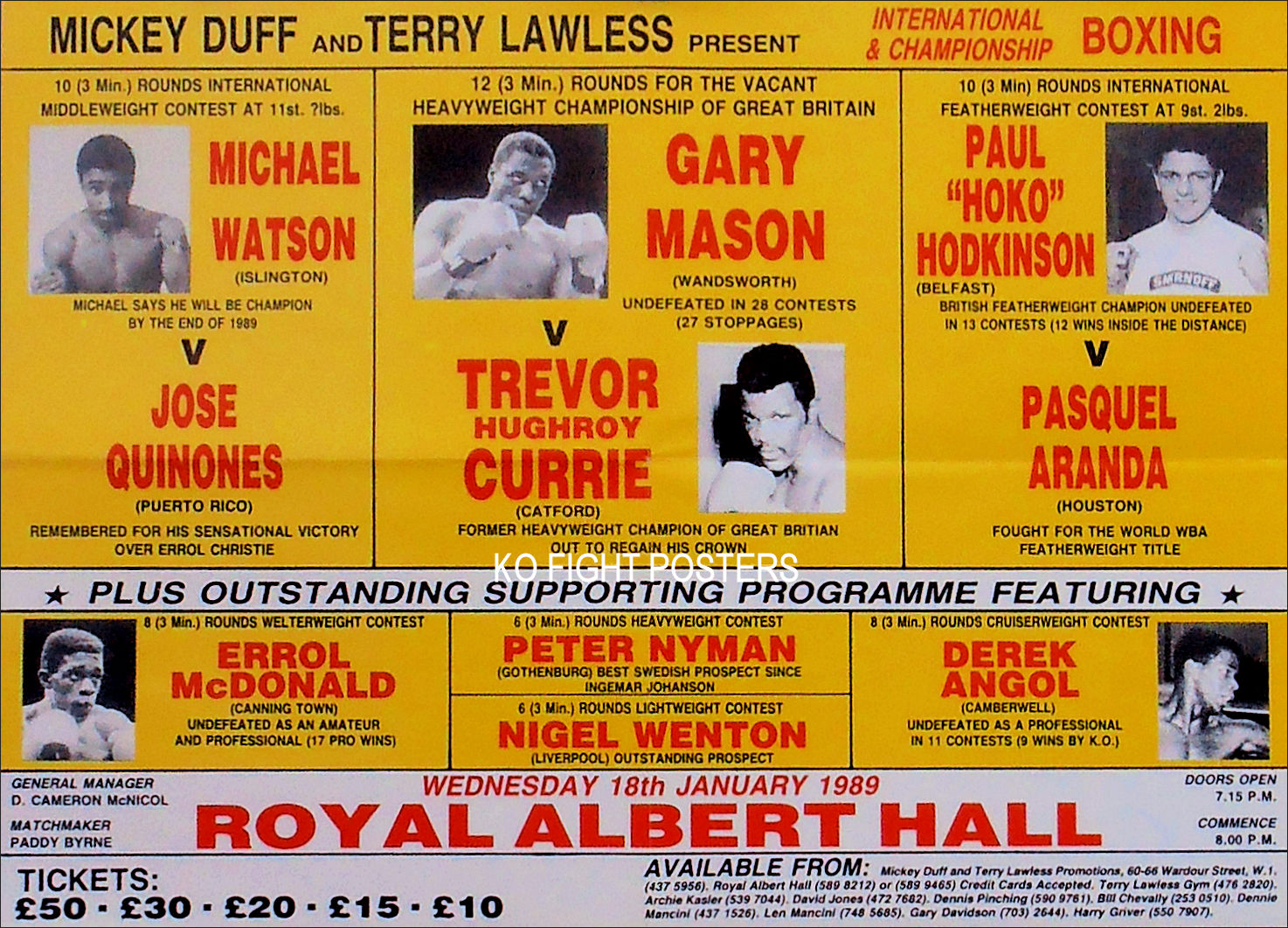 Wandsworth up & coming heavyweight Gary Mason knocked out former champion Hughroy Curry in the 4th round to lift the vacant British heavyweight title (vacated by Horace Notice).