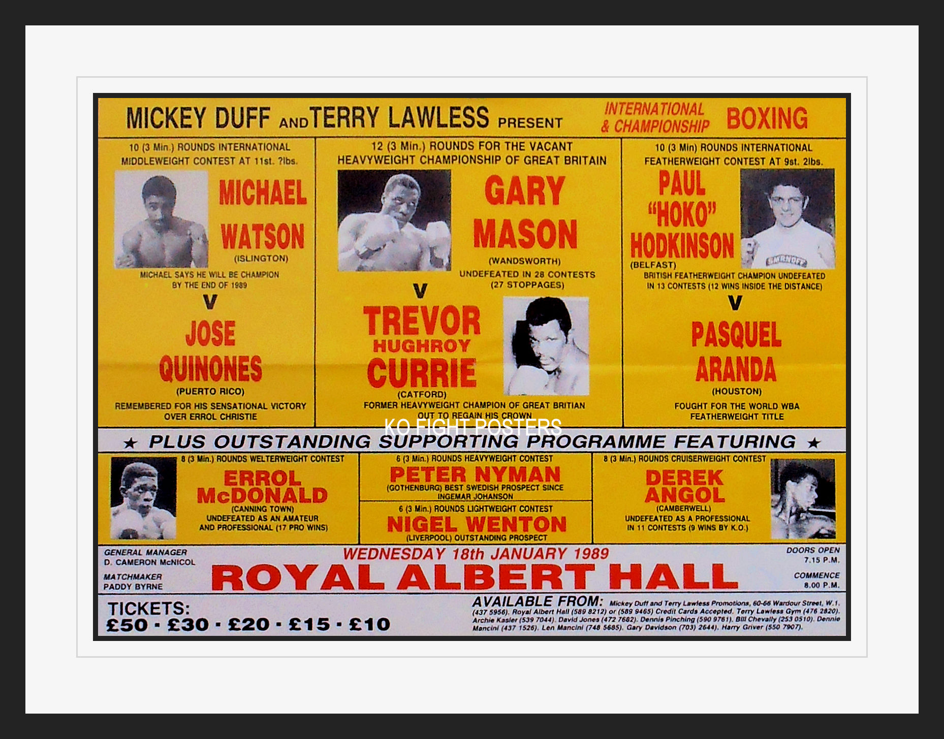 Description : Here we have an original official onsite boxing fight poster for the vacant BBBoC heavyweight championship of great Britain. Royal Albert Hall, Kensington, London, England, 19th January 1989.