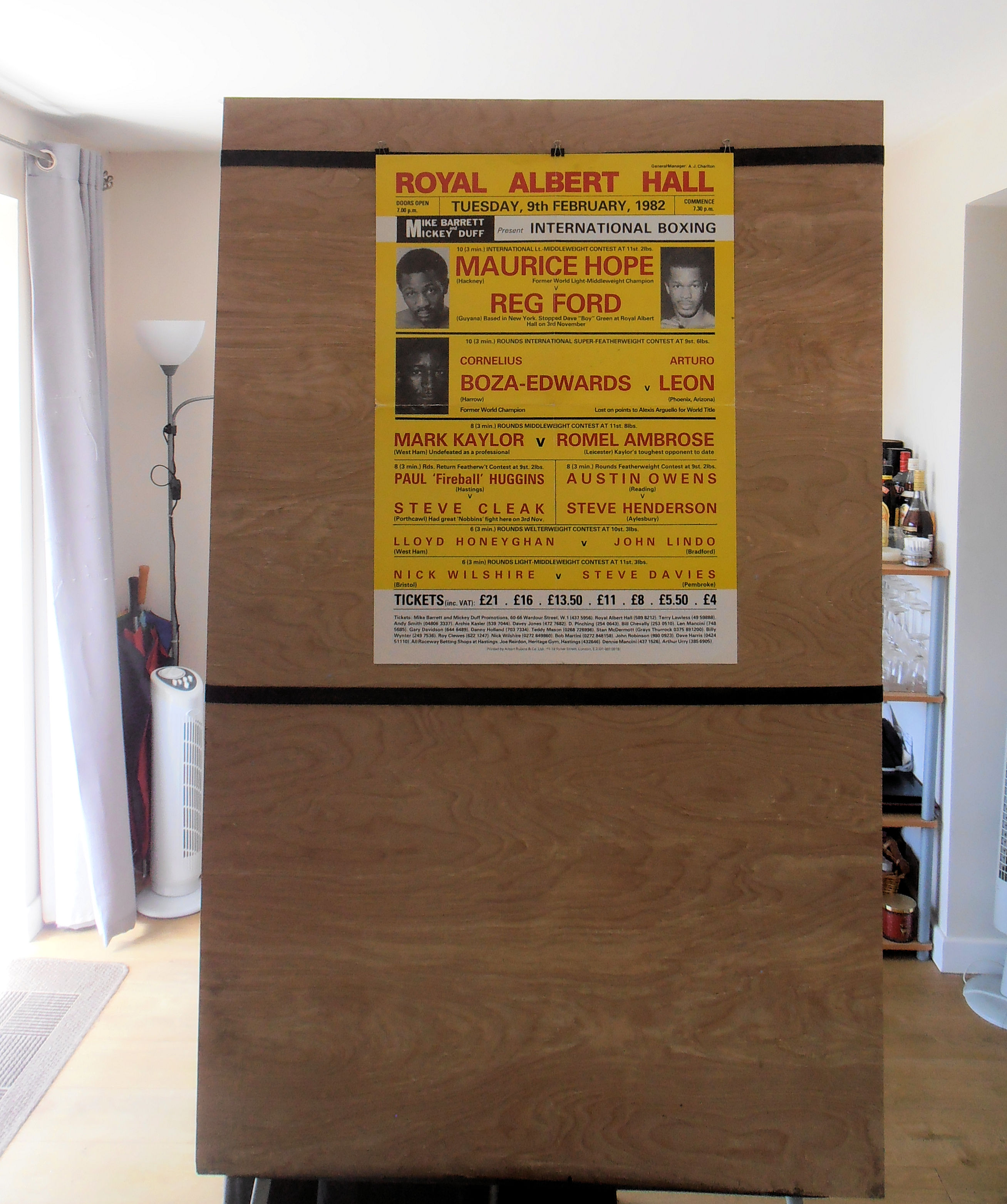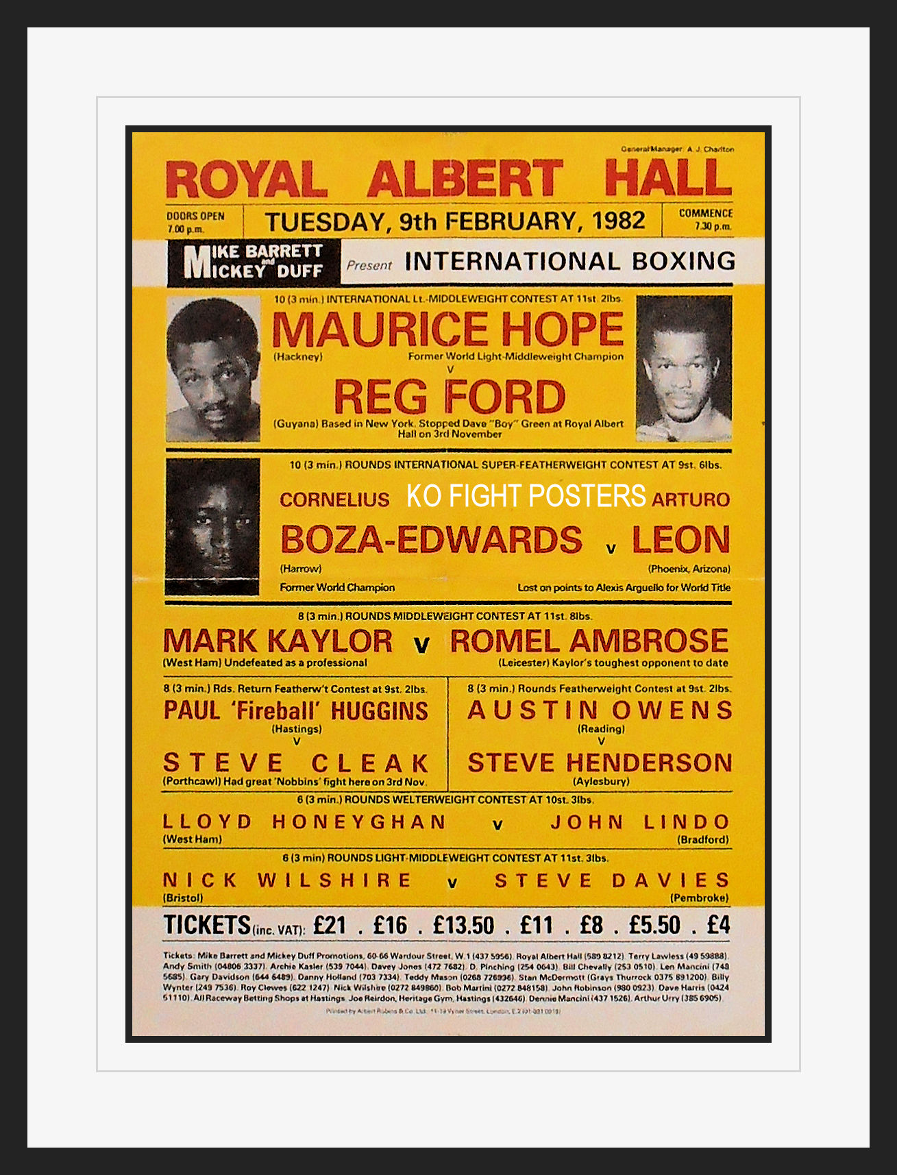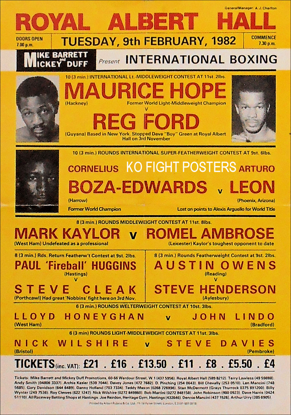Description : Here we have an original official onsite boxing fight poster for the International boxing card held at the Royal Albert Hall, Kensington, London, England, 9th February 1982.