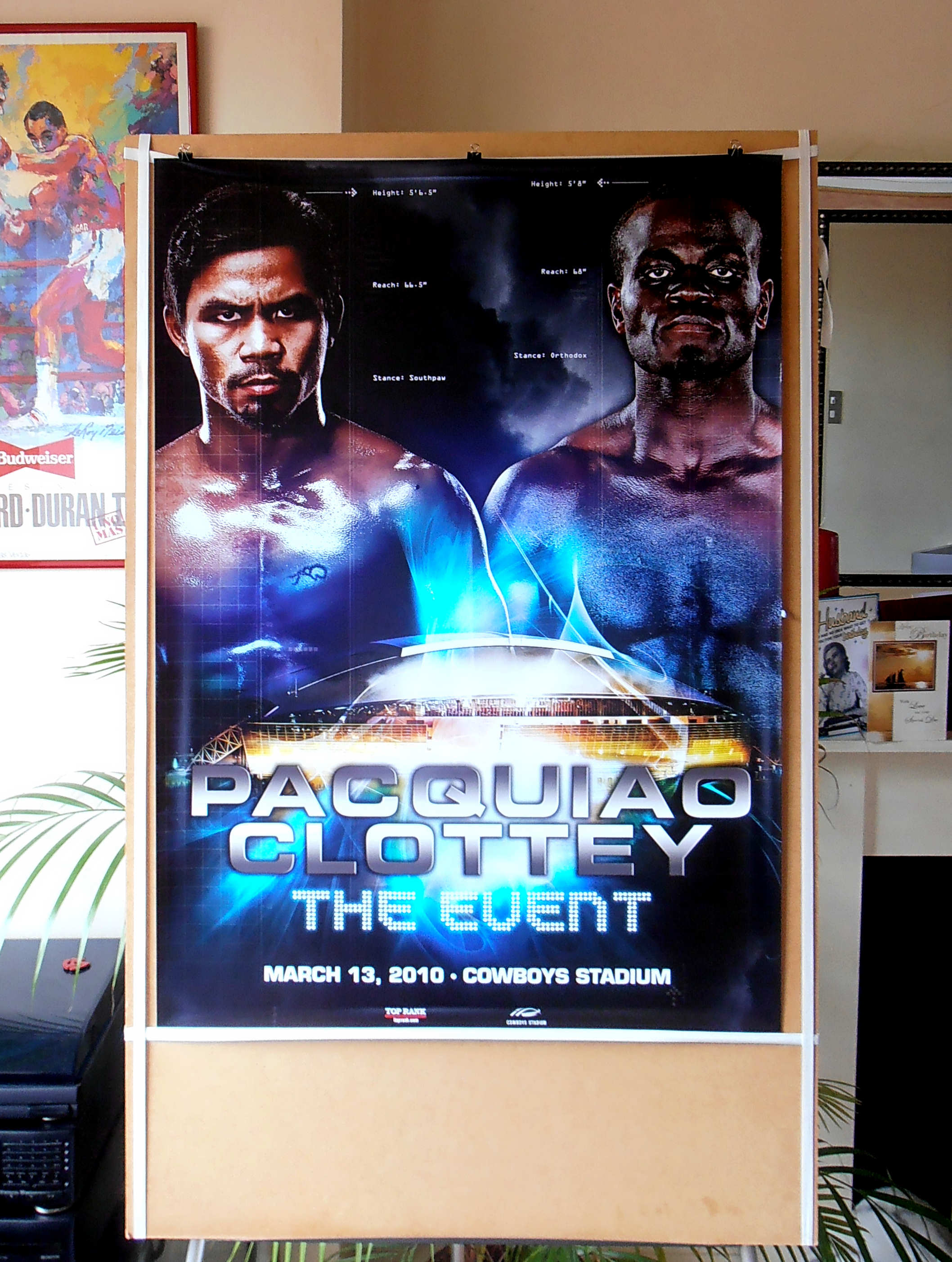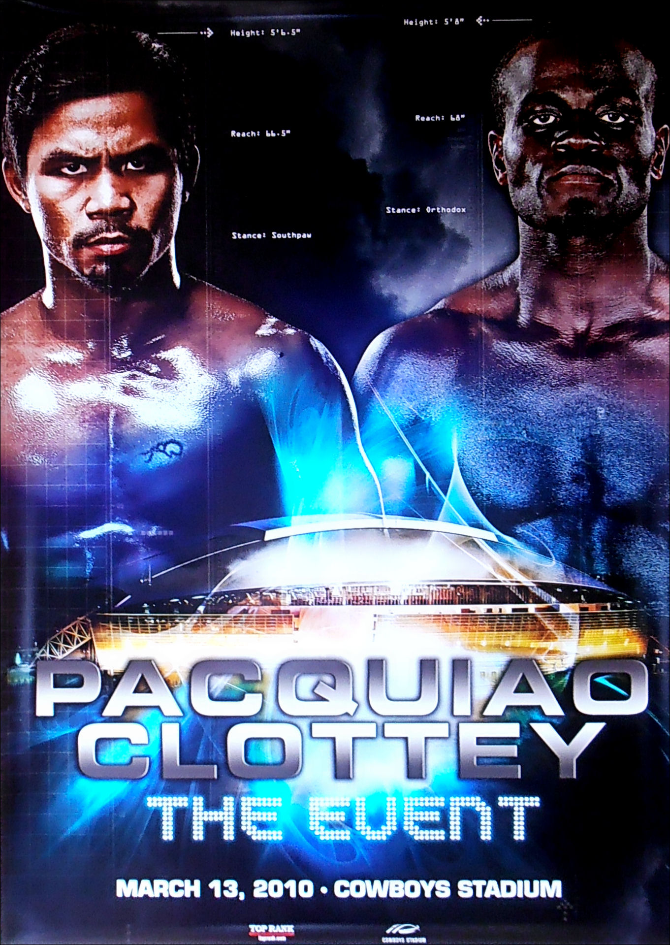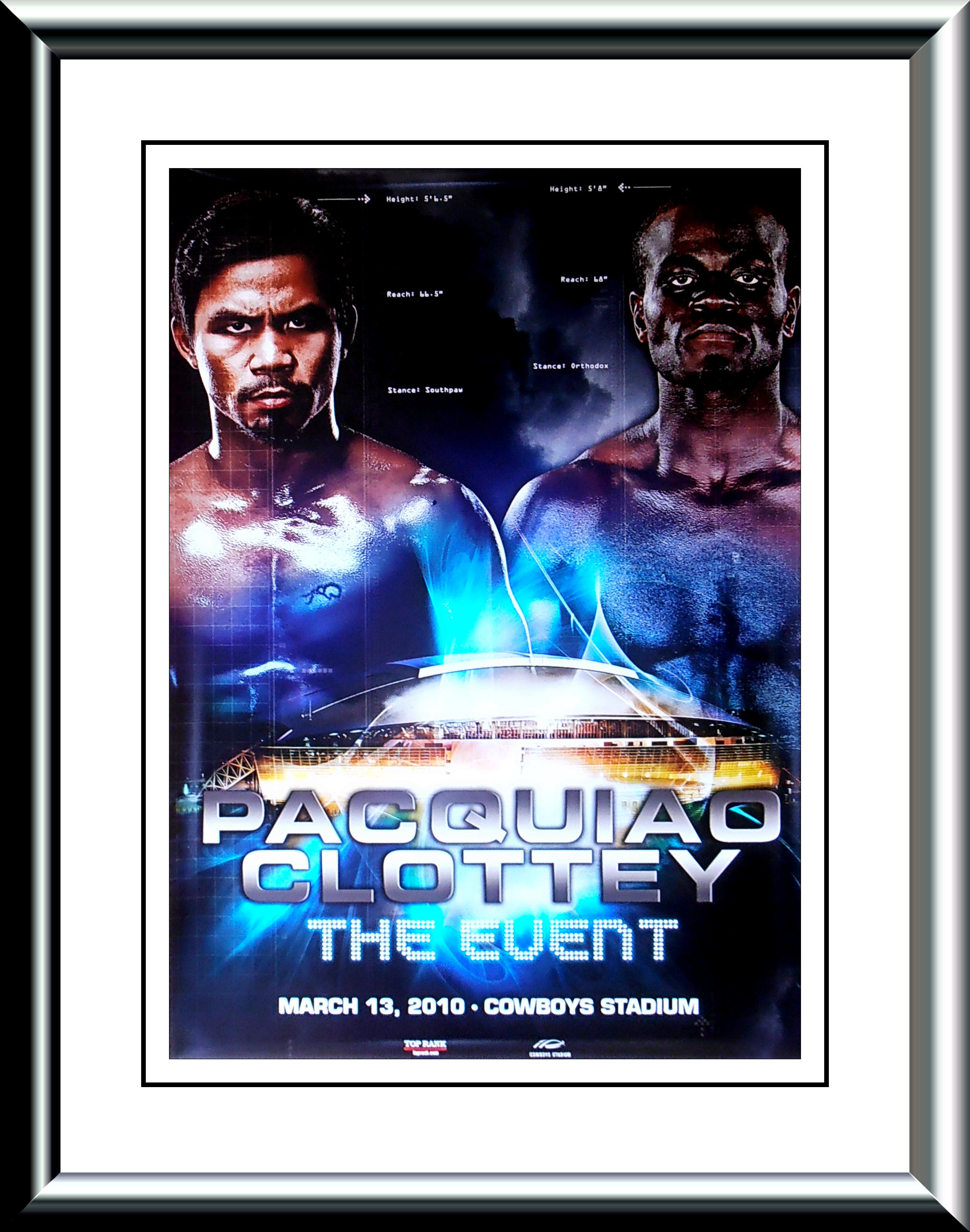 Description : Here we have an original full-sized main event boxing poster billed as "The Event" for the WBO World welterweight championship. The bout was held on March 13, 2010, at Cowboys Stadium, in Arlington, Texas, United States. This match was put together after the long awaited "superfight" between Manny Pacquiao and Floyd Mayweather, Jr. had fallen through.....