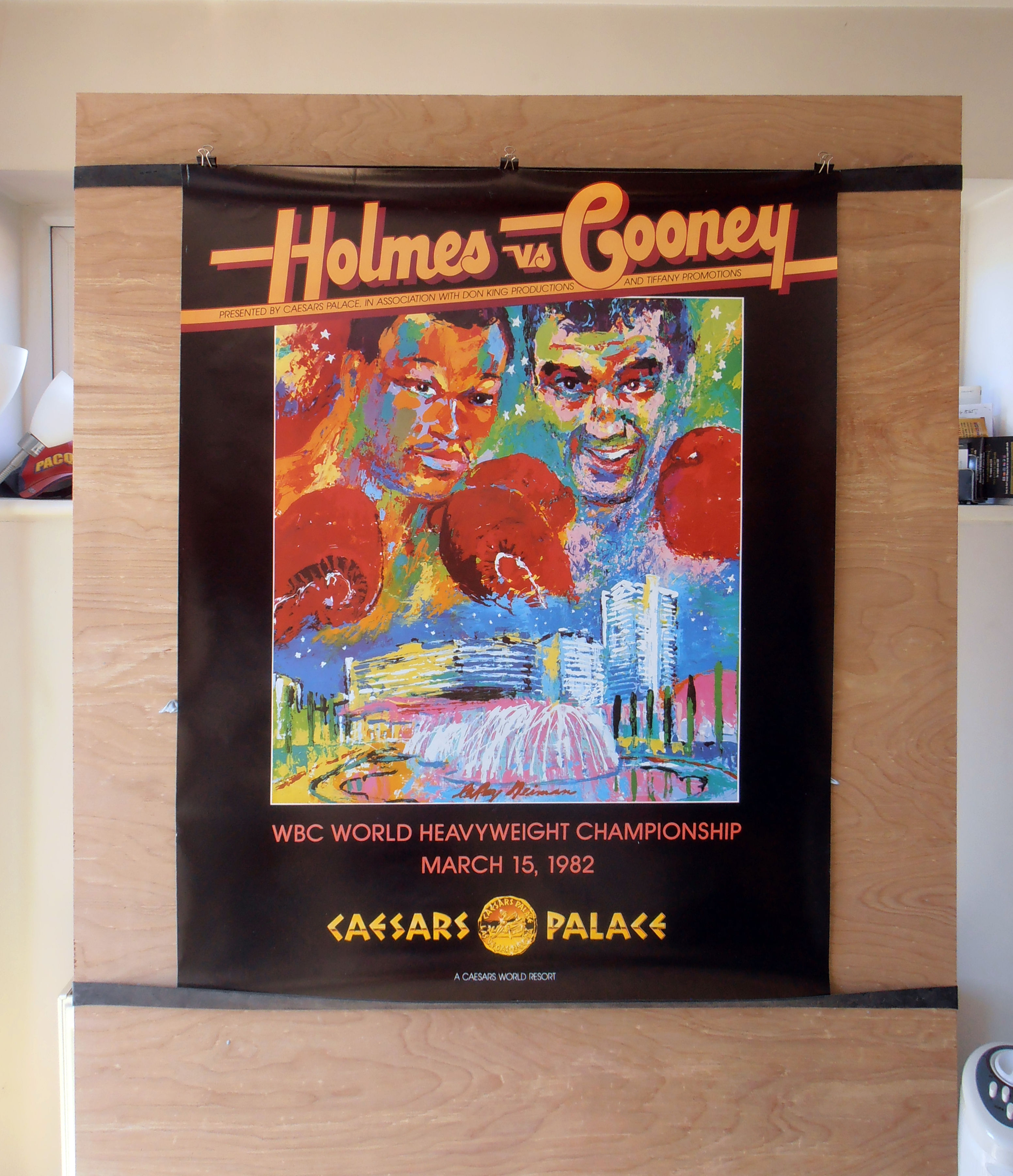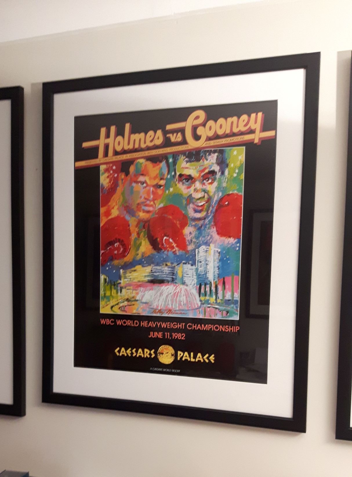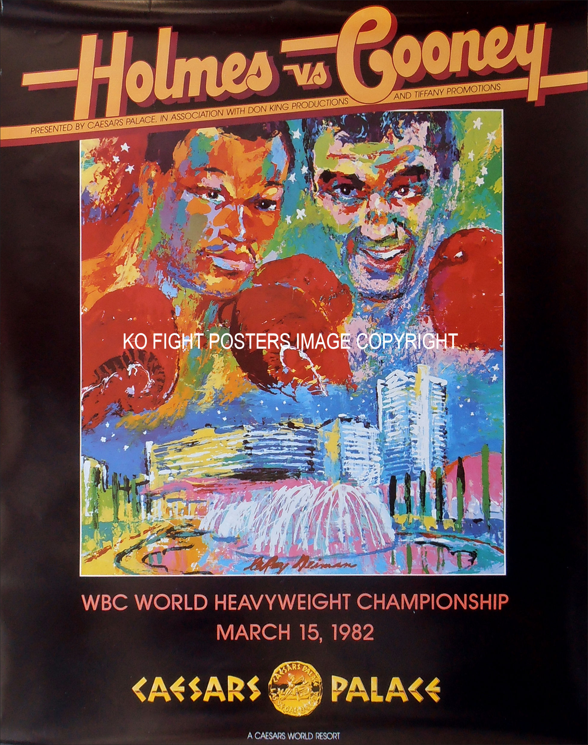 Description : Here we have an original onsite boxing fight poster (Original Fight Date) by the world famous sports artist Leroy Neiman who was commissioned by Caesars to produce the main event poster for the much anticipated showdown between reigning WBC Champion Larry Holmes & the great white hope, Gerry Cooney.
