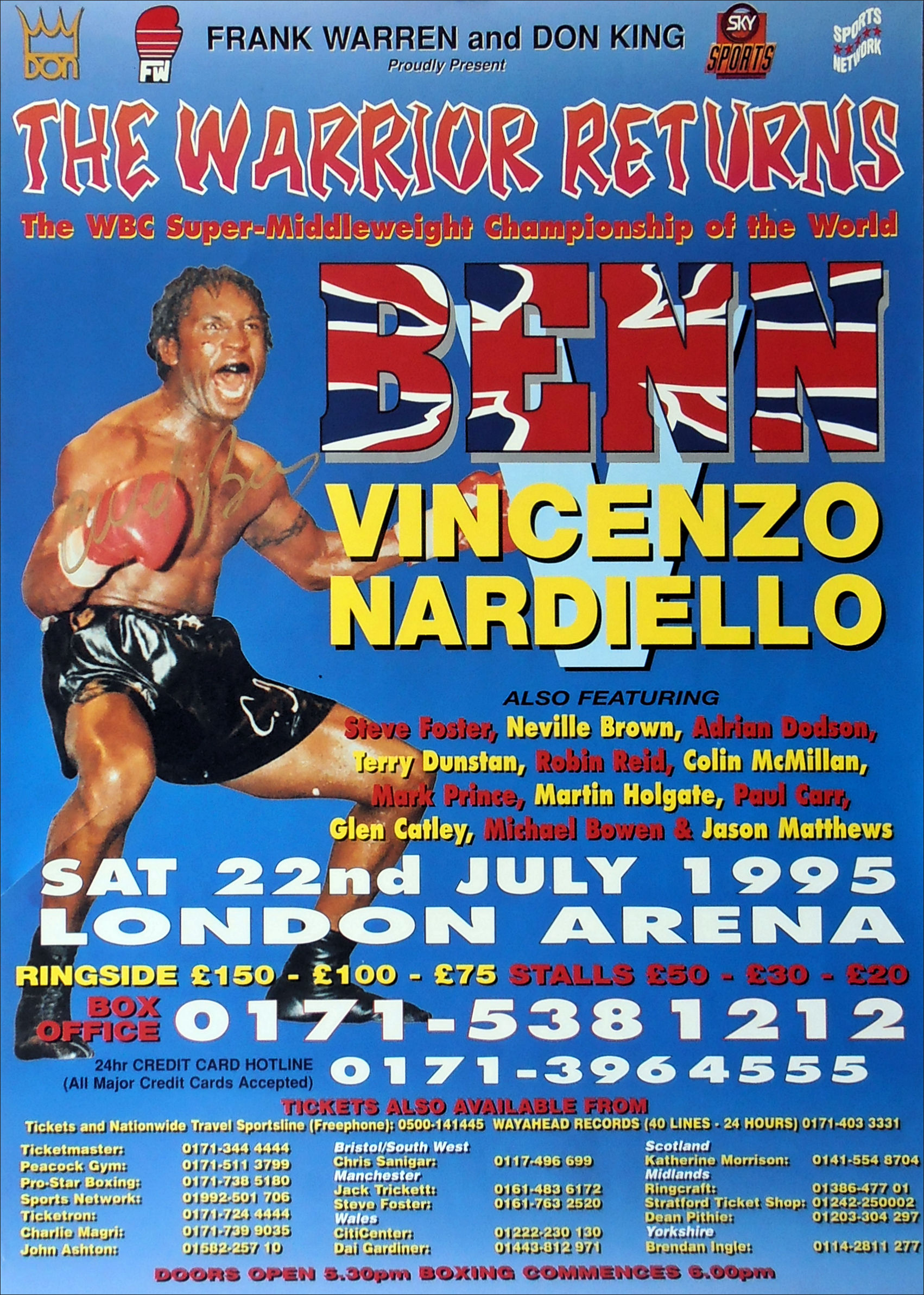 This original promotional boxing poster was signed by WBO/WBC two weight champion Nigel Benn. Lifetime LOA supplied by KOfightposters.com