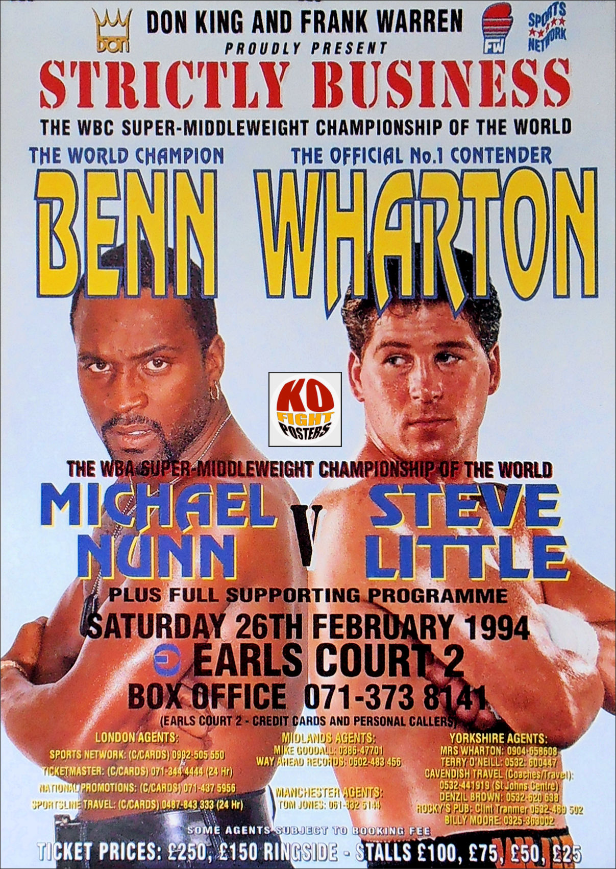 Description : Here we have an original onsite promotional boxing fight poster for the WBC world super middleweight championship title bout held at the Earls Court Exhibition Hall, Kensington, London, United Kingdom. 26th February 1994.