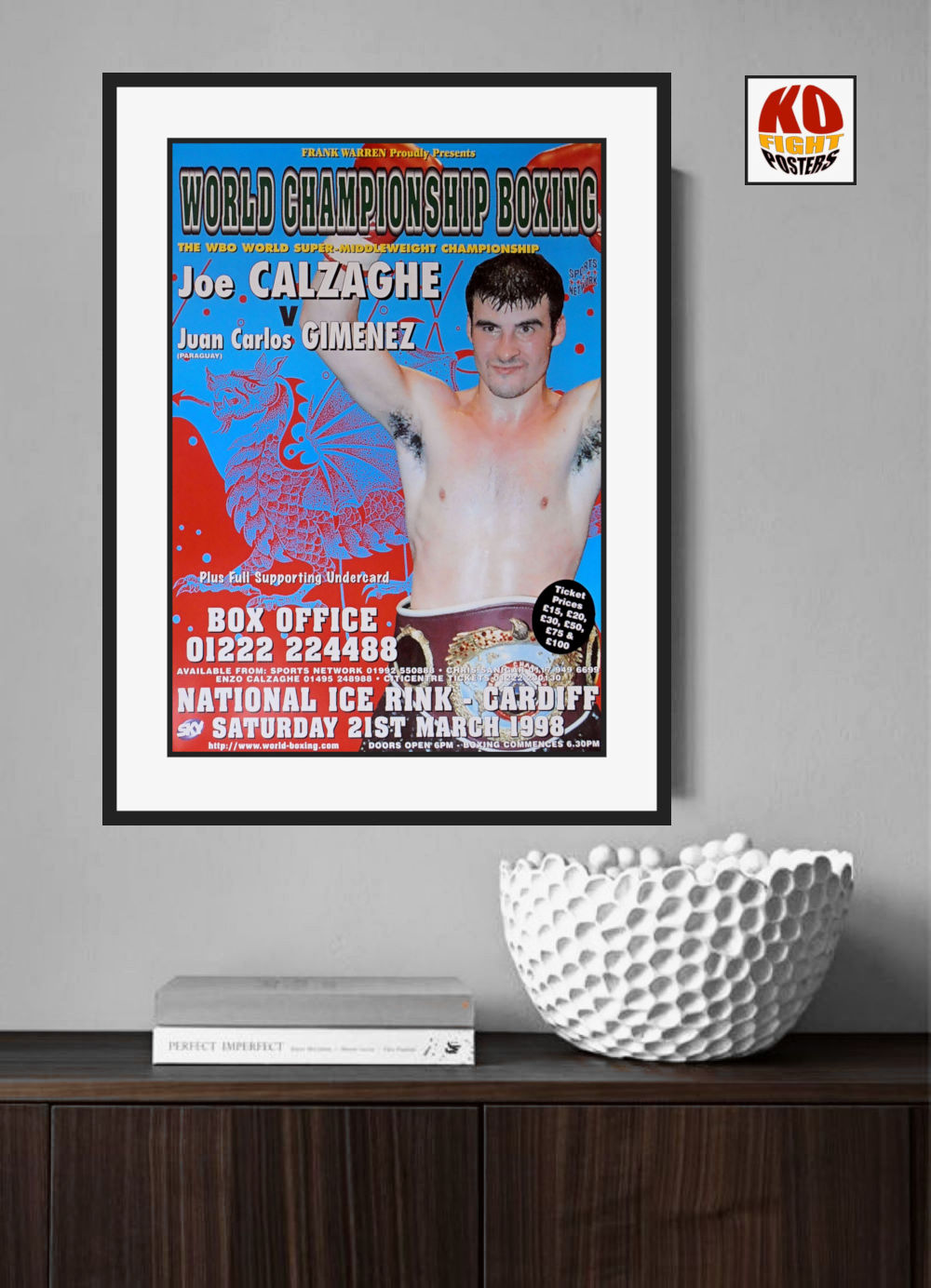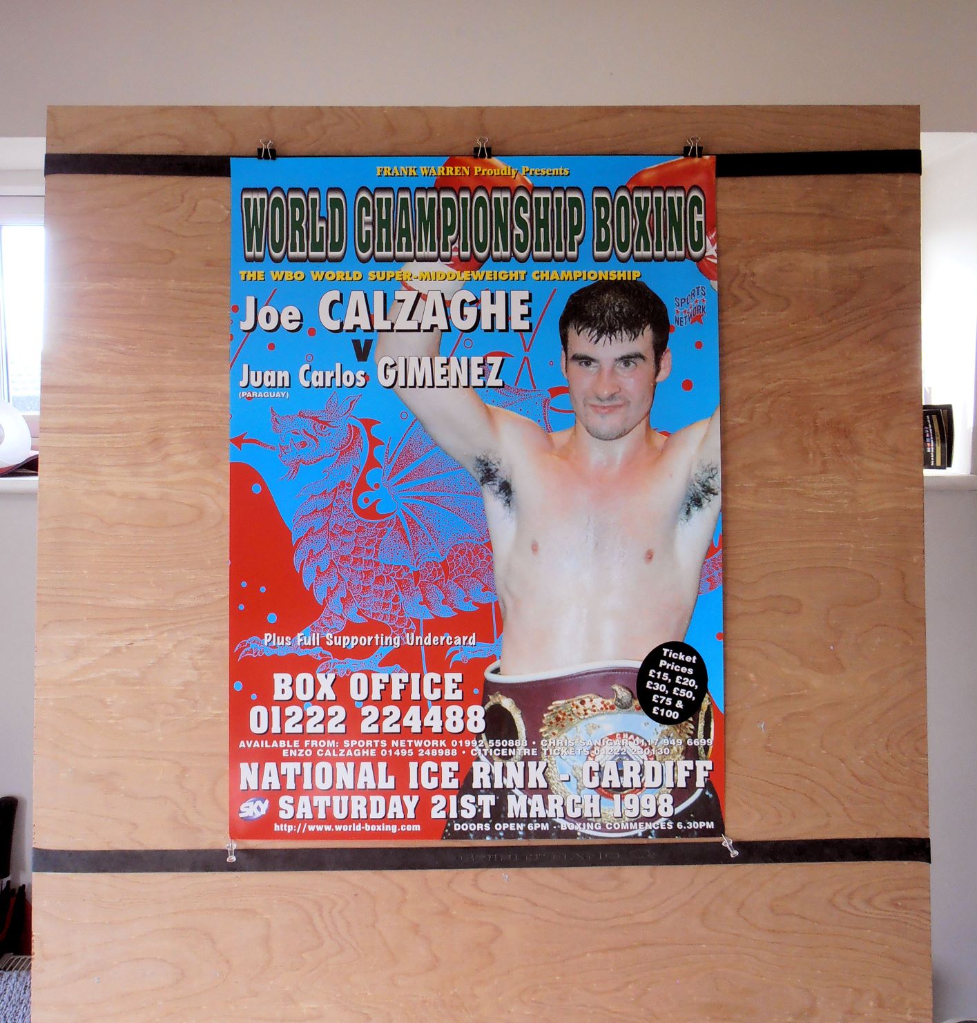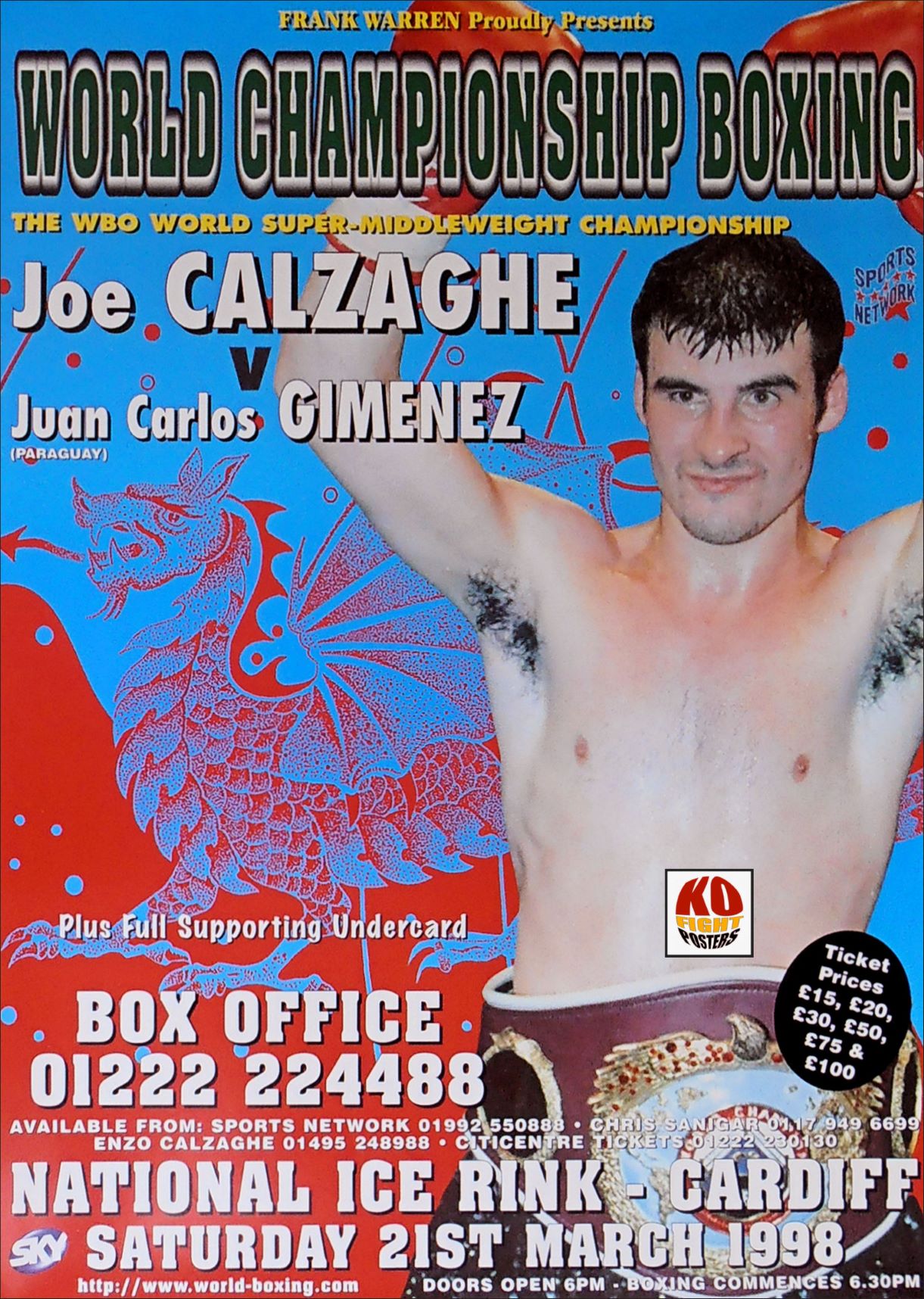 Description : Here we have an original onsite promotional boxing fight poster for the WBO world super middleweight championship title bout held at the National Ice Rink, Cardiff, Wales, United Kingdom, 21st March April 1998. (Fight rescheduled for 25th April 1998)