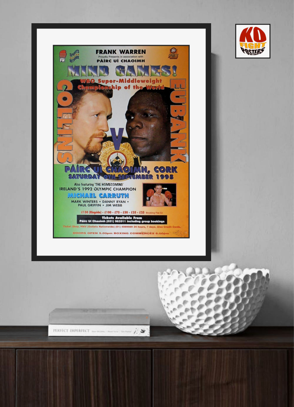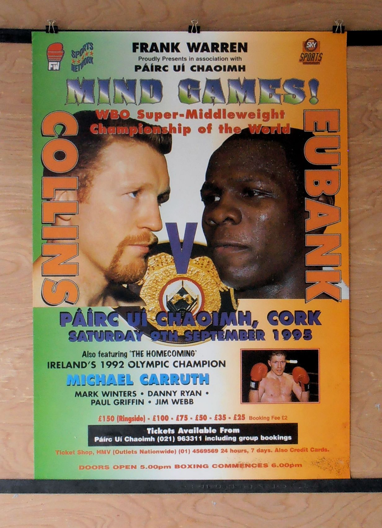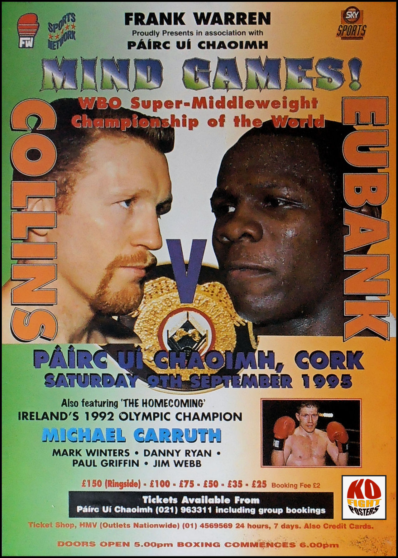 Description : Here we have an original official super-scarce Frank Warrens promotions onsite promotional boxing poster for the WBO world super-middleweight world title bout held at the Green Glens Arena Millstreet Co Cork Ireland, 9th September 1995