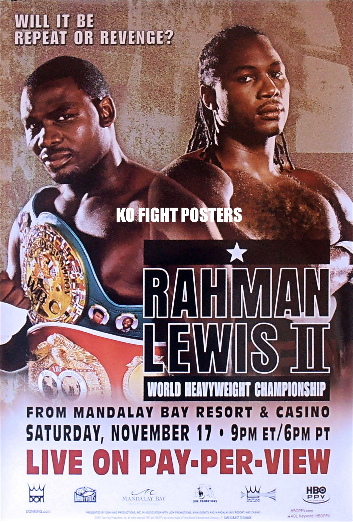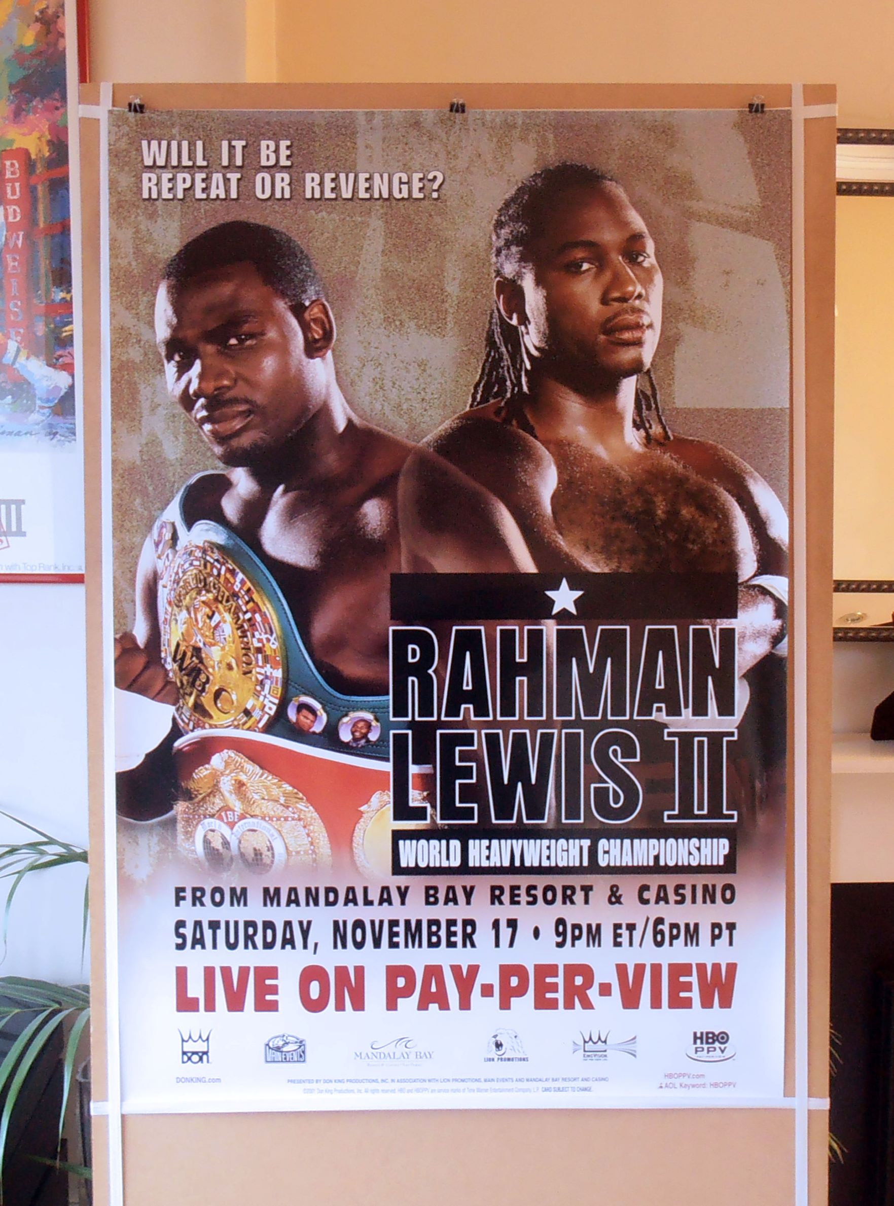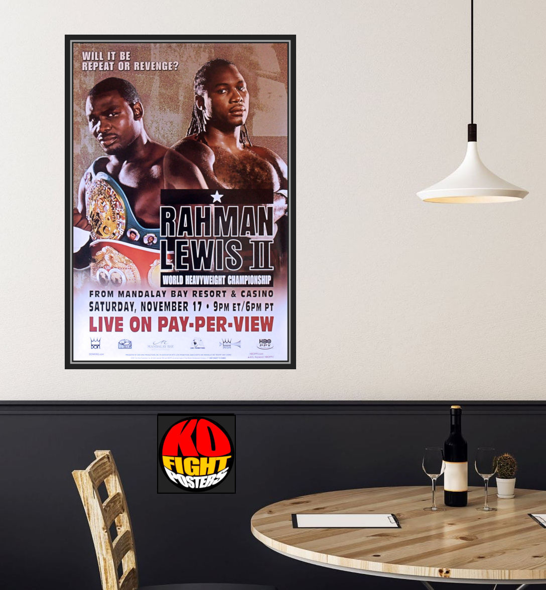 Description : Here we have an original HBO PPV boxing closed circuit poster for the World Heavyweight Title re-match between Hasim Rahman vs. Lennox Lewis II, billed as "Final Judgment", for the WBC, IBF, IBO and Lineal Heavyweight Championships, contested at the Mandalay Bay Las Vegas, USA. 17th November 2001.