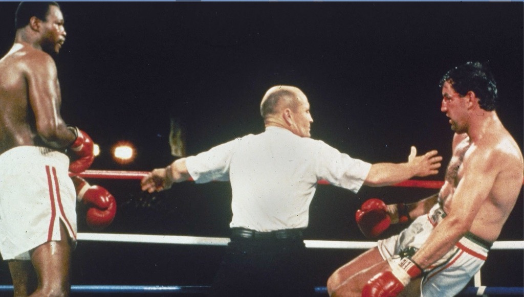 By round thirteen, Cooney seemed to believe that he would lose the fight and was just trying to last the fifteen round distance. He had suffered a cut on his left eye and was taking heavy punishment. Midway through the round, a Holmes cross landed flush on Cooney's left cheek, and Cooney's legs buckled. He landed against the ropes, near his corner, and Holmes moved in, intent on finishing his job. Cooney's trainer, Victor Valle, prevented him from doing so, however, by throwing a towel from Cooney's corner, signifying that they were quitting. It should be clarified, however, that Cooney did not quit, his corner did that for him. Another great white hope had bit the dust!