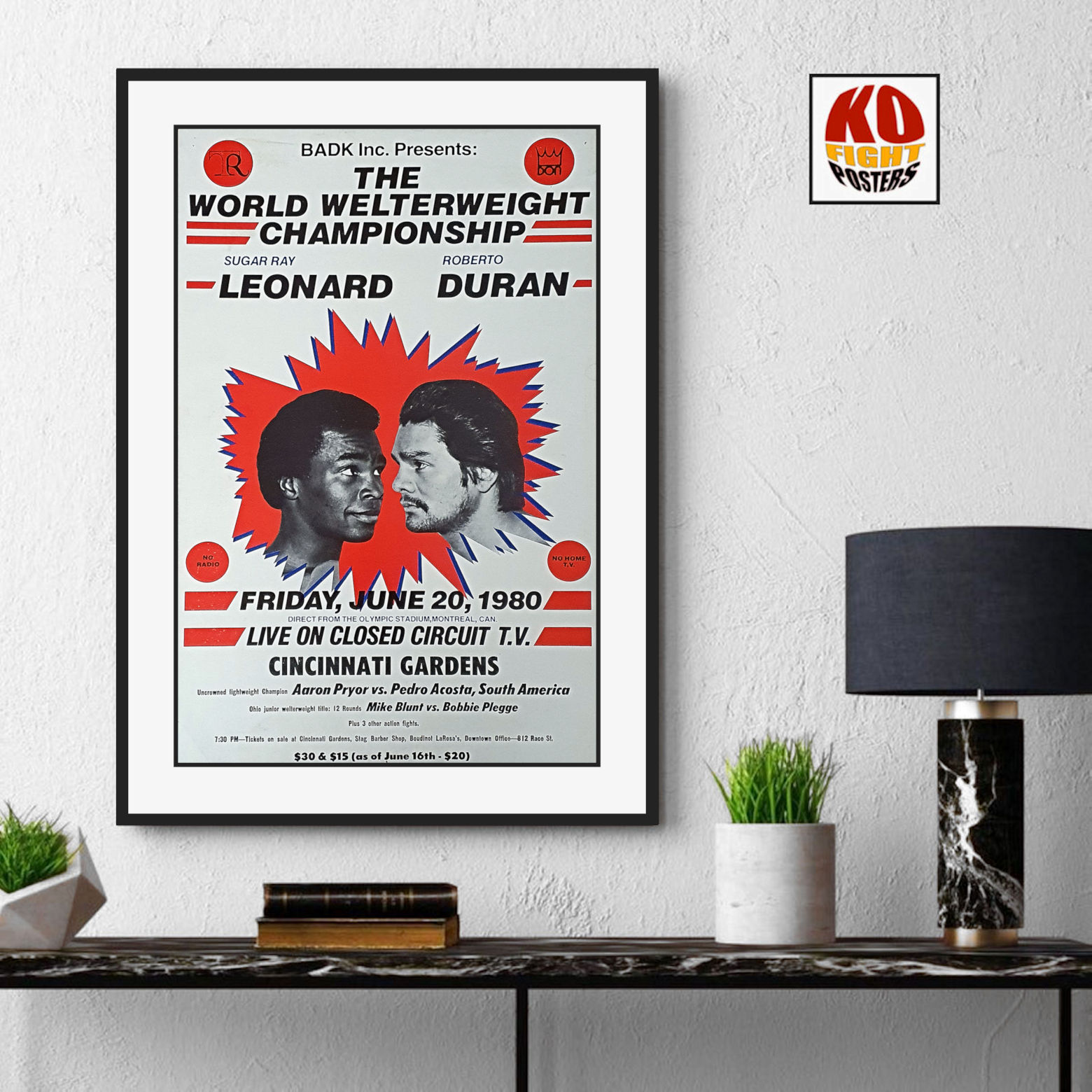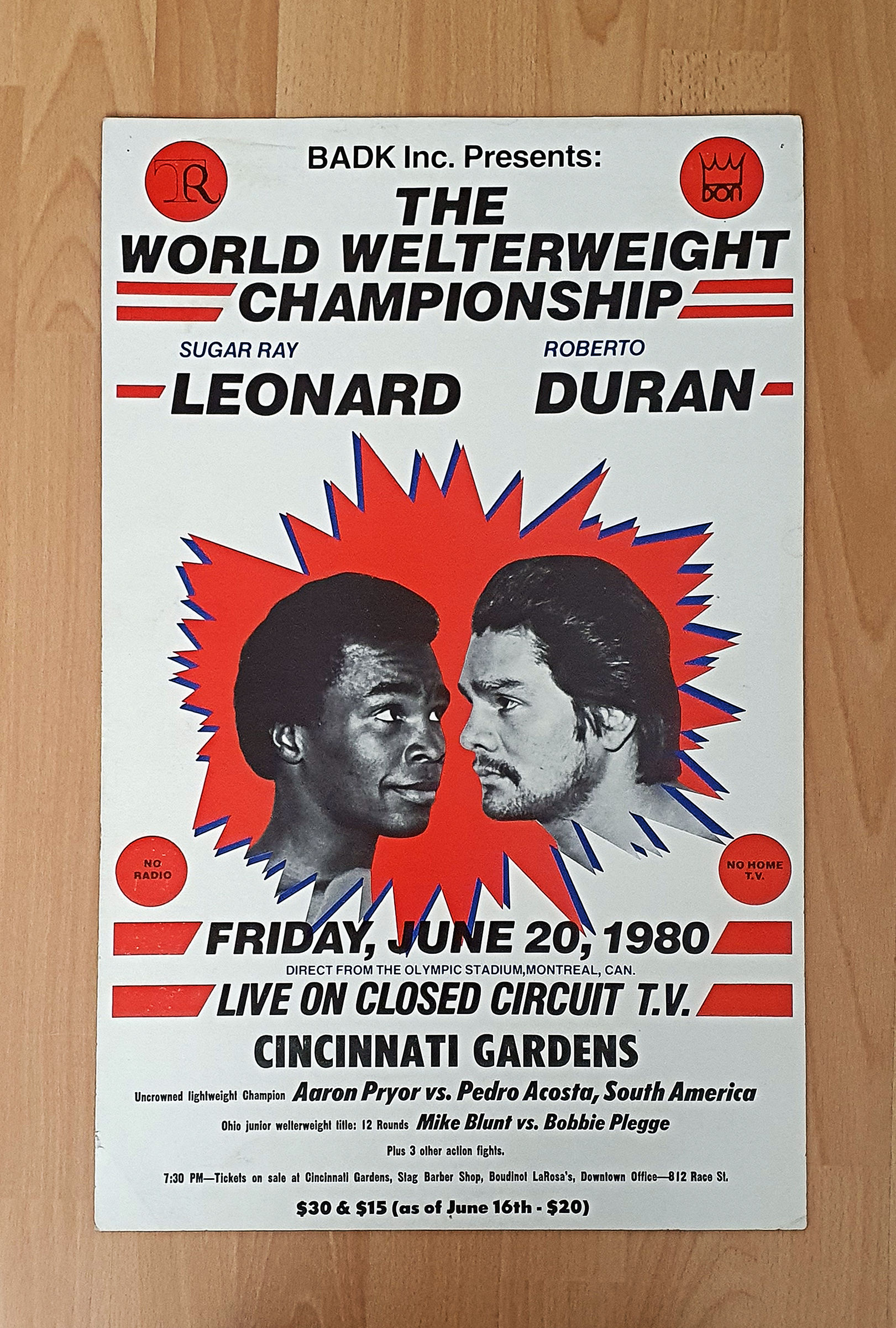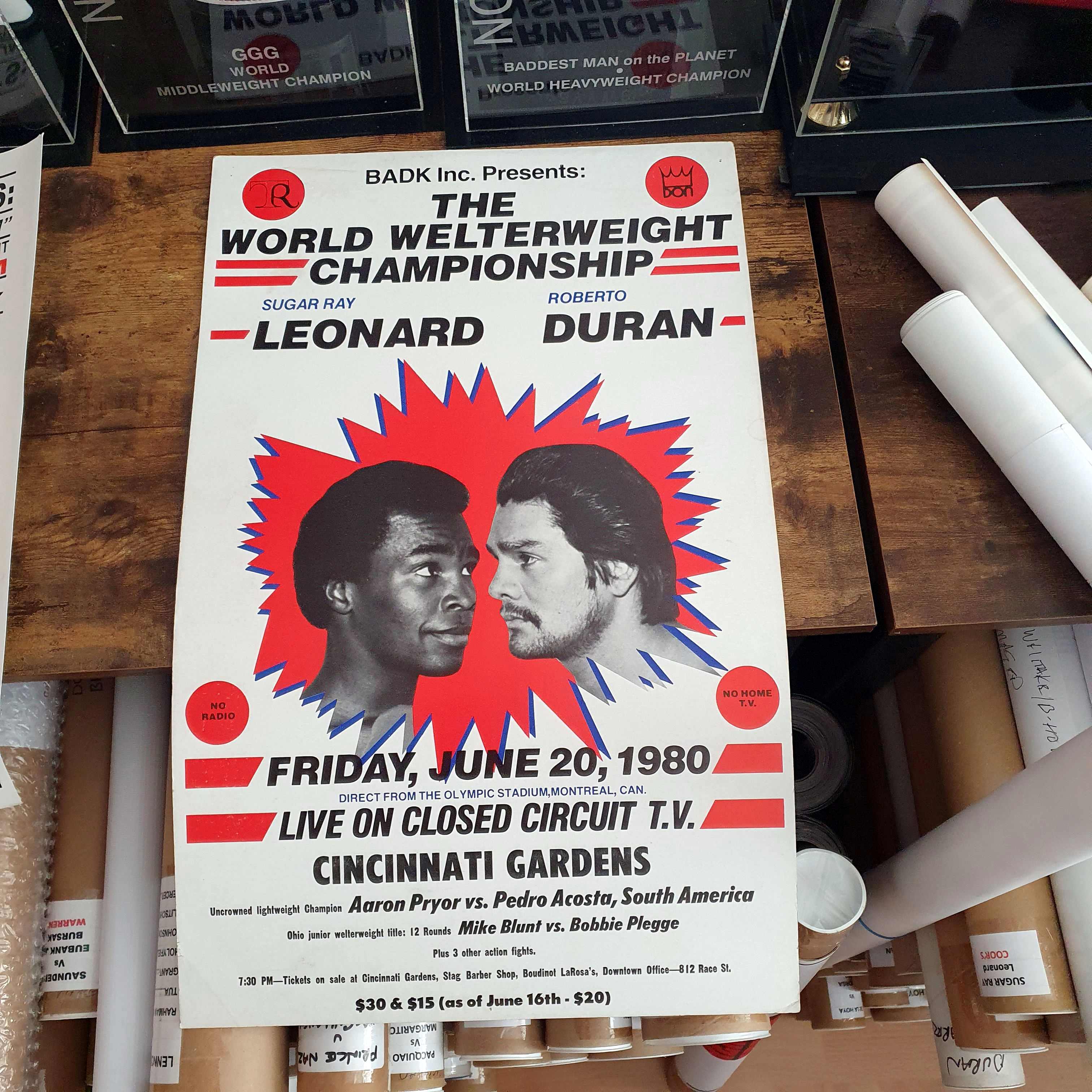 Description : Here we have the a vintage official Don King & Top Rank promotions closed circuit poster from that most momentous & historic night in Montreal. This poster was used to advertise the closed circuit showing at the Cincinnati Gardens Arena with future WBA light-welterweight champion Aaron Pryor appearing as a pre-fight screening attraction fighting Carl crowley,