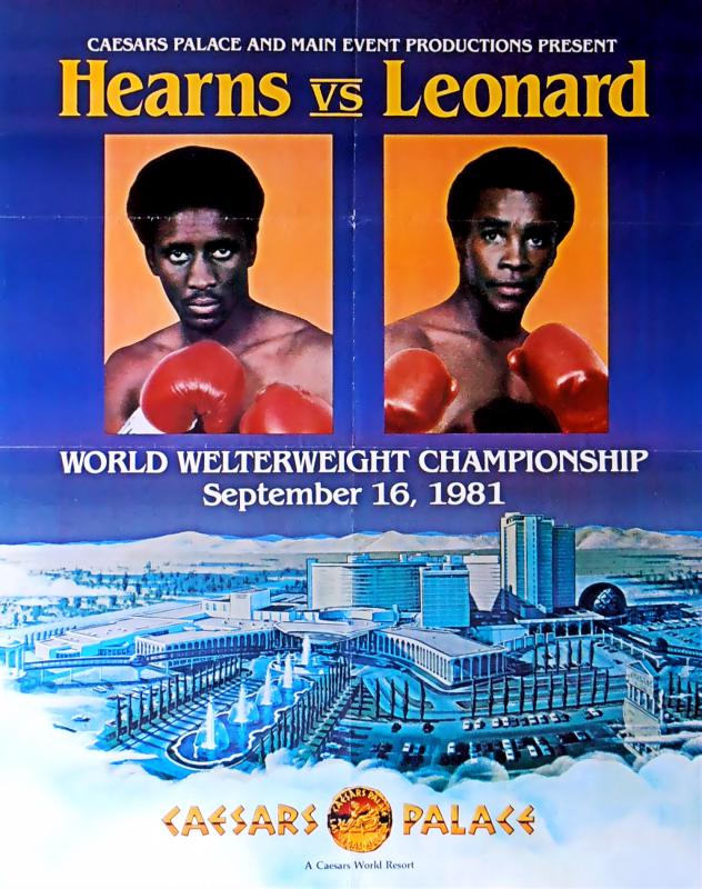 Description : Here have a fabulous super-rare vintage official Caesars Palace Las Vegas onsite main event fight poster for the Undisputed Welterweight Championship of the world. Promoted as "The Showdown," Leonard (30-1 with 21 KO) fought Hearns (32-0 with 30 KO) on September 16, 1981 at Caesars Palace Las Vegas, Nevada to unify the world welterweight championship in a scheduled fifteen-rounder. They fought before a live crowd of 23,618 and a worldwide TV audience of some 300 million.