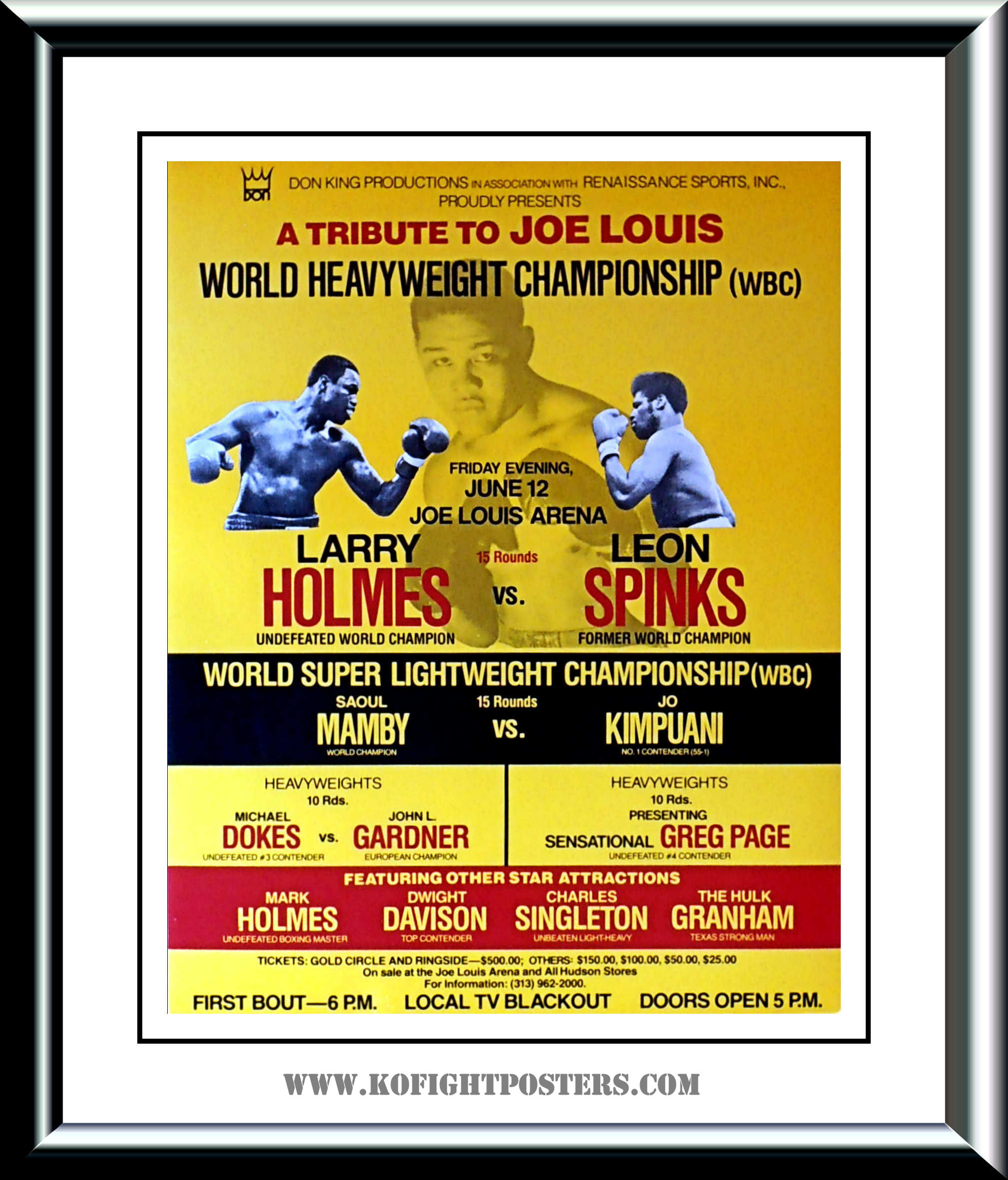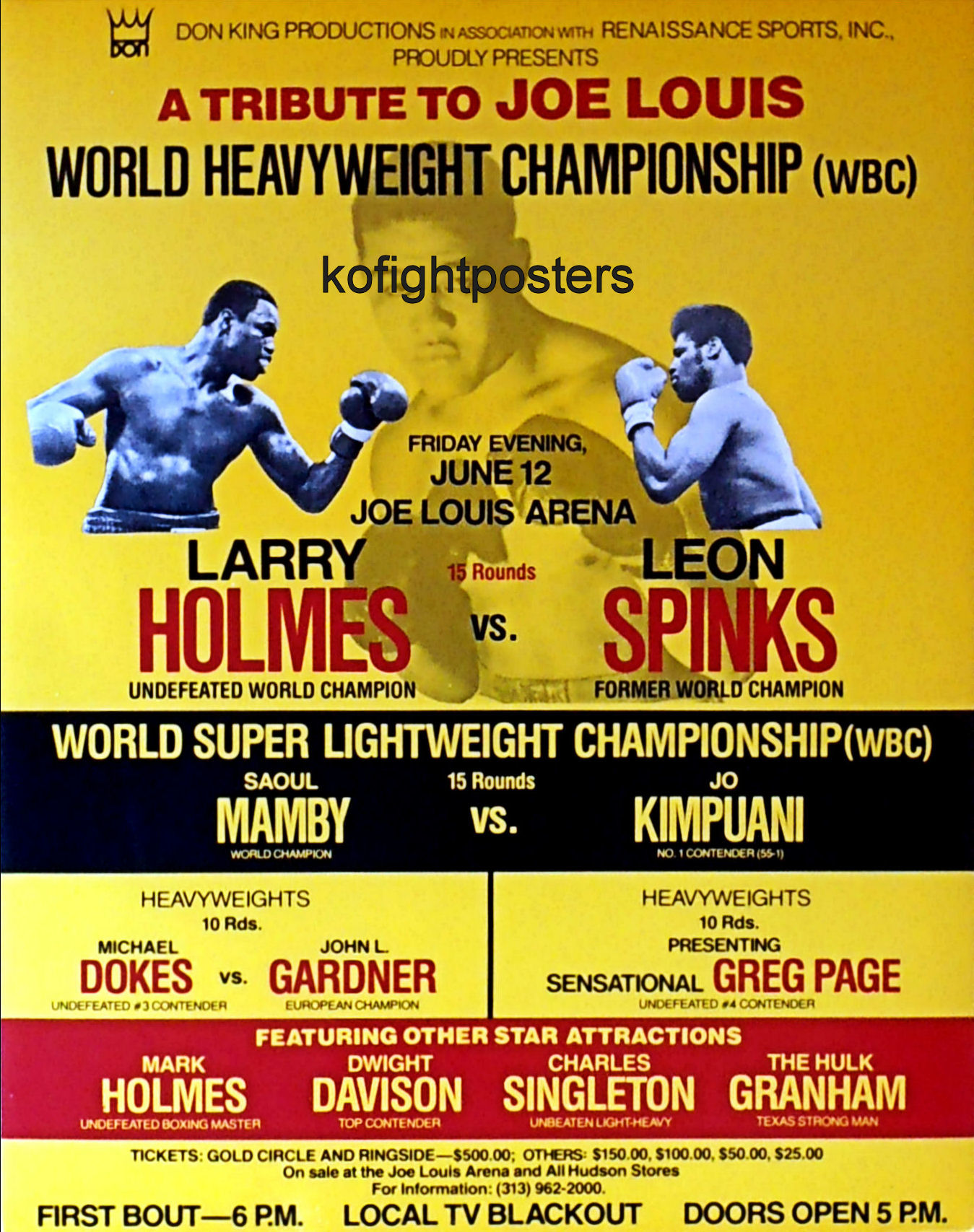 The 4/1 favorite Holmes was making his 10th defence of his WBC crown against former champion & Ali conqueror Leon Spinks. The fight was billed as a tribute to Joe Louis, who died two months earlier. Holmes started slow but poured out his spite on Spinks who was hammered in the 3rd round, Holmes pinned Spinks to the ropes and pounded him with a barrage of right hands. Spinks went down but was able to regain his feet at the count of nine. Holmes then trapped Spinks in the challenger's corner and hit him with right after right until the referee stepped in and stopped the fight, just as Spinks' corner threw in the towel.