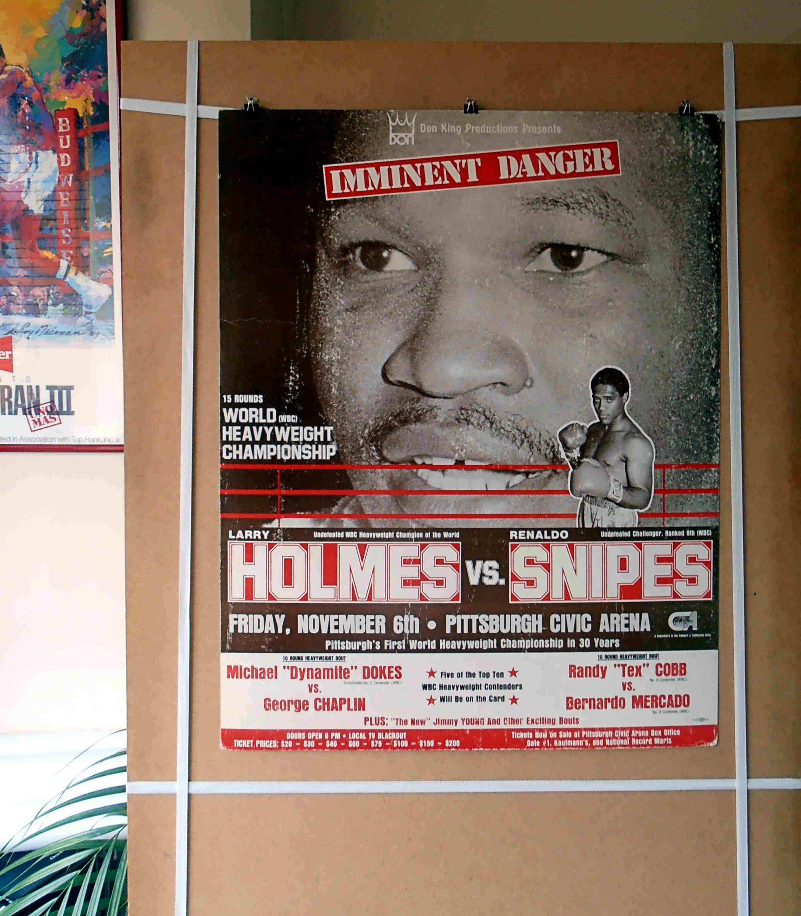 Description : Here we have a vintage onsite poster from the Civic Arena, Pittsburgh, Pennsylvania, USA. The fight was billed as "Imminent Danger." for the WBC heavyweight title defence between reigning & defending WBC heavyweight champion Larry Holmes pitted against challenger Renaldo Snipes. Holmes was such a heavy favorite that there was no betting line on the fight.