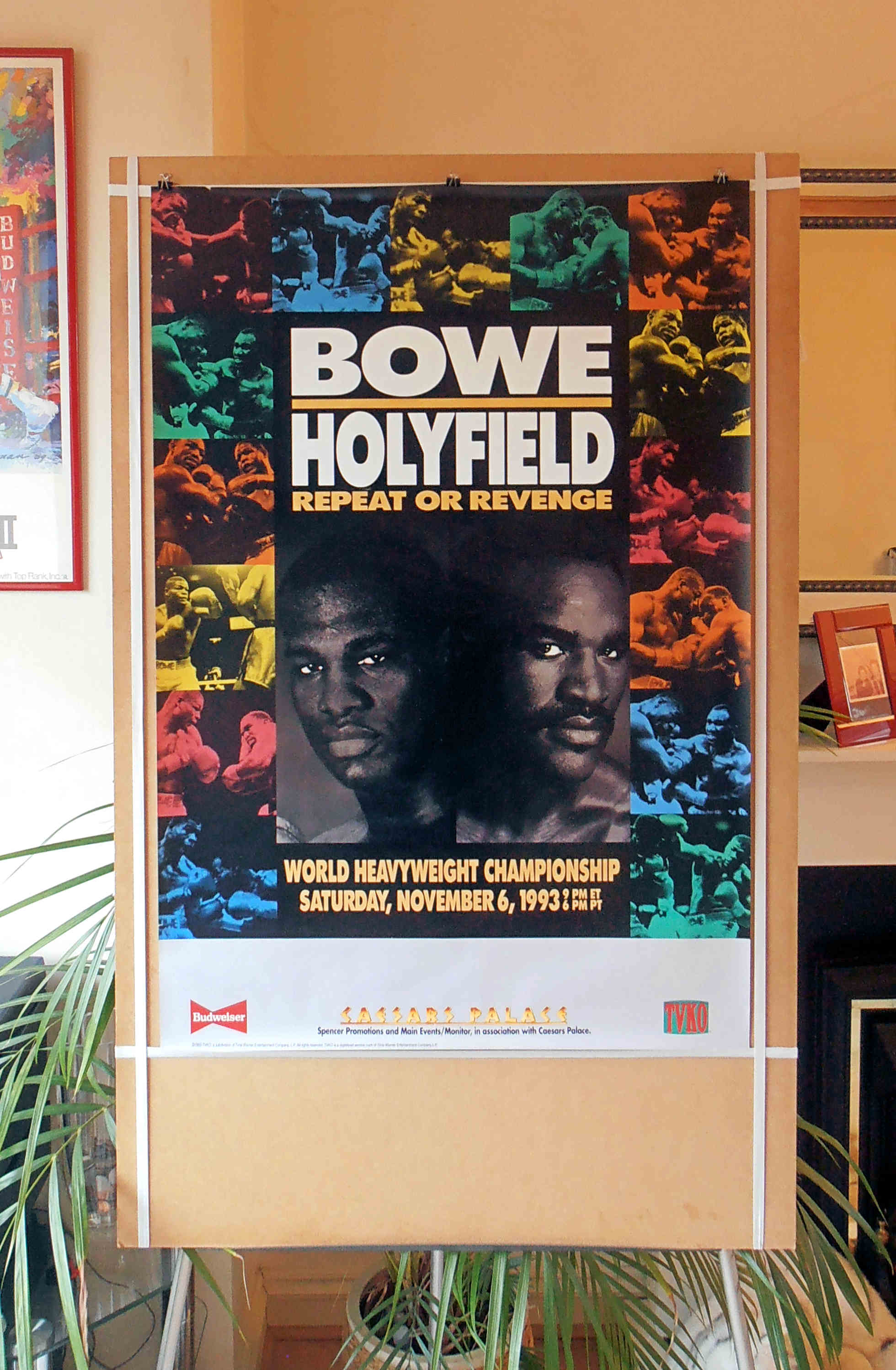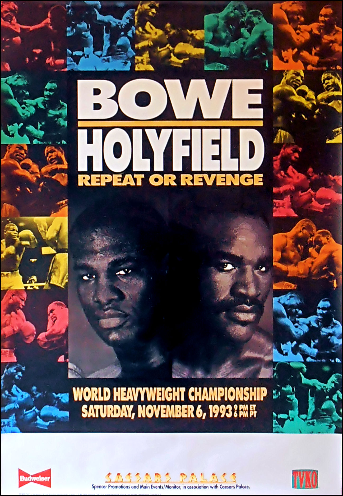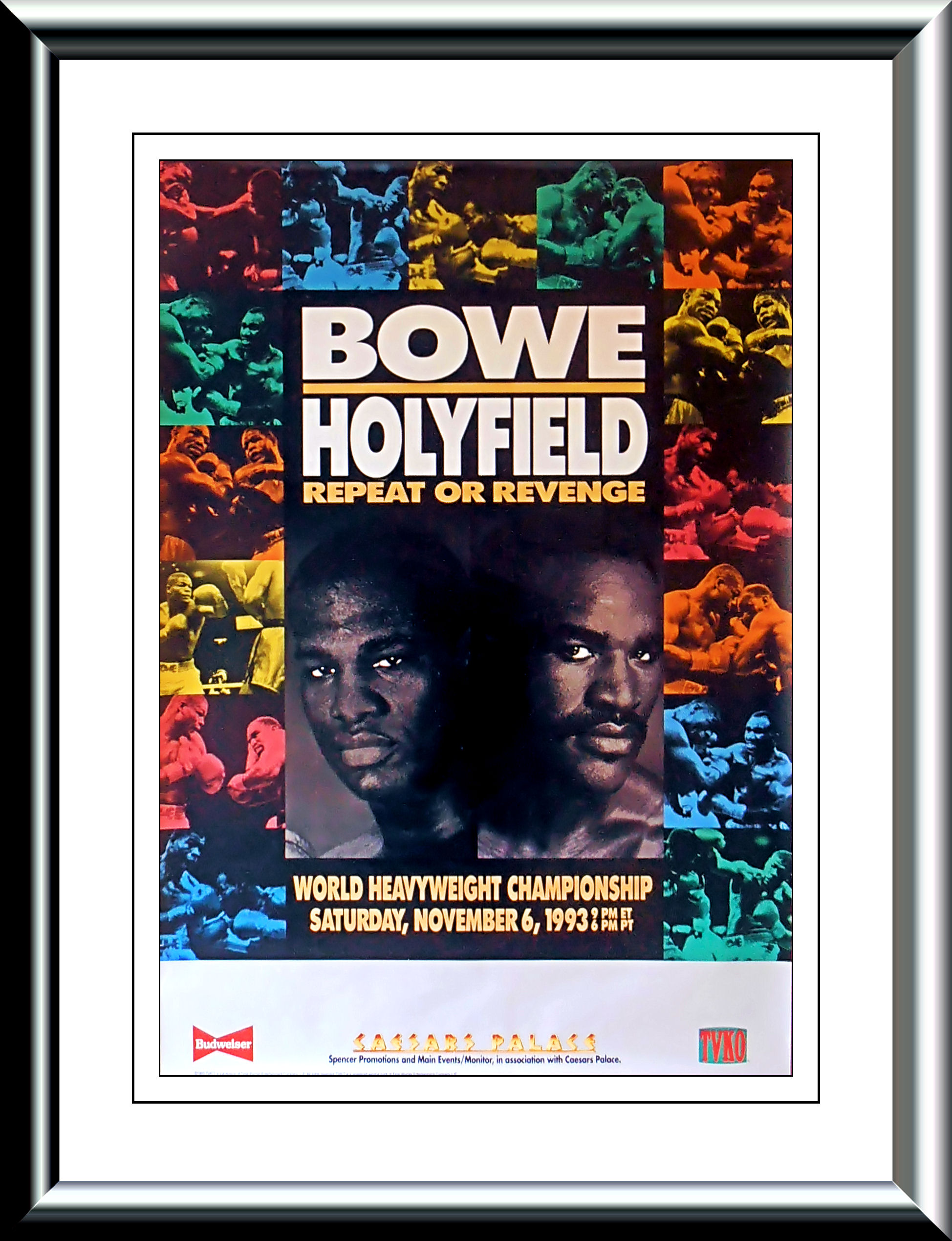 Description : Here we have an original full-size TVKO boxing closed circuit fight poster for the undisputed world heavyweight championship title bout held at Caesars Palace, Las Vegas, Nevada USA, 6th November 1993.