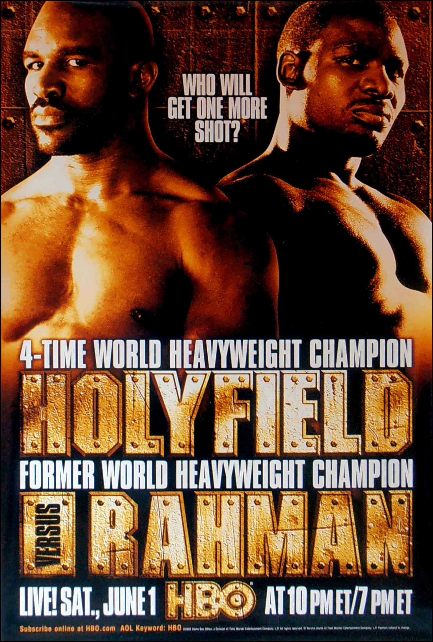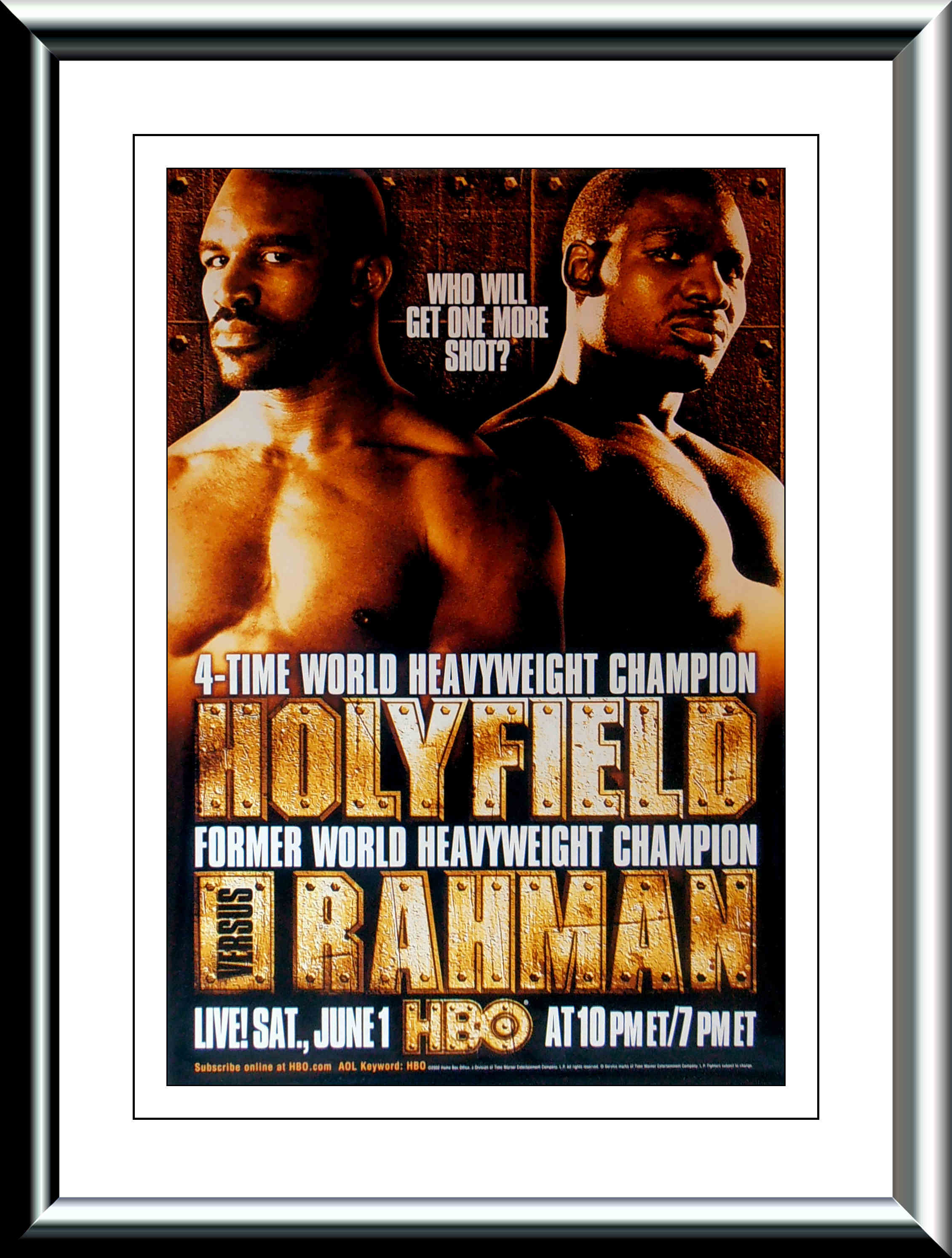 Description : Here we have an original full-size HBO boxing closed circuit fight poster. 2002 began as a promising year for Holyfield: in June, he met former World Heavyweight Champion Hasim Rahman, to determine who would face Lewis next. Holyfield was leading on two of the three scorecards when the fight was stopped in the eighth round due to a severe hematoma on Rahman's forehead above his left eye that was caused by a headbutt earlier in the fight. Holyfield was ahead, so he was declared the winner by a technical decision.