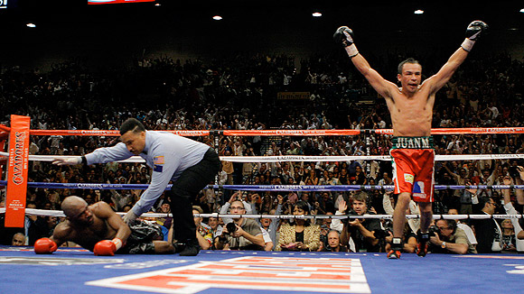 Juan Manuel Marquez vs. Joel Casamayor was a boxing lightweight super-fight. In 2008 reigning lightweight Champion “El Cepillo” Casamayor met former two-division World Champion Juan Manuel Dinamita Márquez at the MGM Grand Garden Arena in Las Vegas for a 12-round championship bout. Casamayor was the champion of boxing's lightweight division, recognized as the title holder by Ring Magazine, even though he didn't own any of the belts from boxing's four major sanctioning bodies. Márquez defeated Casamayor in the 11th round after two knockdowns, and captured his sixth world title in three different weight classes. Two minutes into the eleventh round, Casamayor was knocked down by a right punch as he pulled away from an intense exchange. Casamayor was able to get on his feet, but it was clear he was still shakey from the knockdown. As soon as the action was allowed to resume, Márquez went in for the kill as he let his punches go in furious combination. Casamayor punched back, but he was knocked down again with about 7 seconds left in the round. Referee Tony Weeks stepped and stopped the bout, as he deemed Casamyor unable to continue. The official judges had the fight scored 95-95, 95-95, and 97-93 for Márquez before the 11th round knockout. After the win, Ring magazine ranked Márquez second on its pound for pound list, and rated him as the lightweight champion.