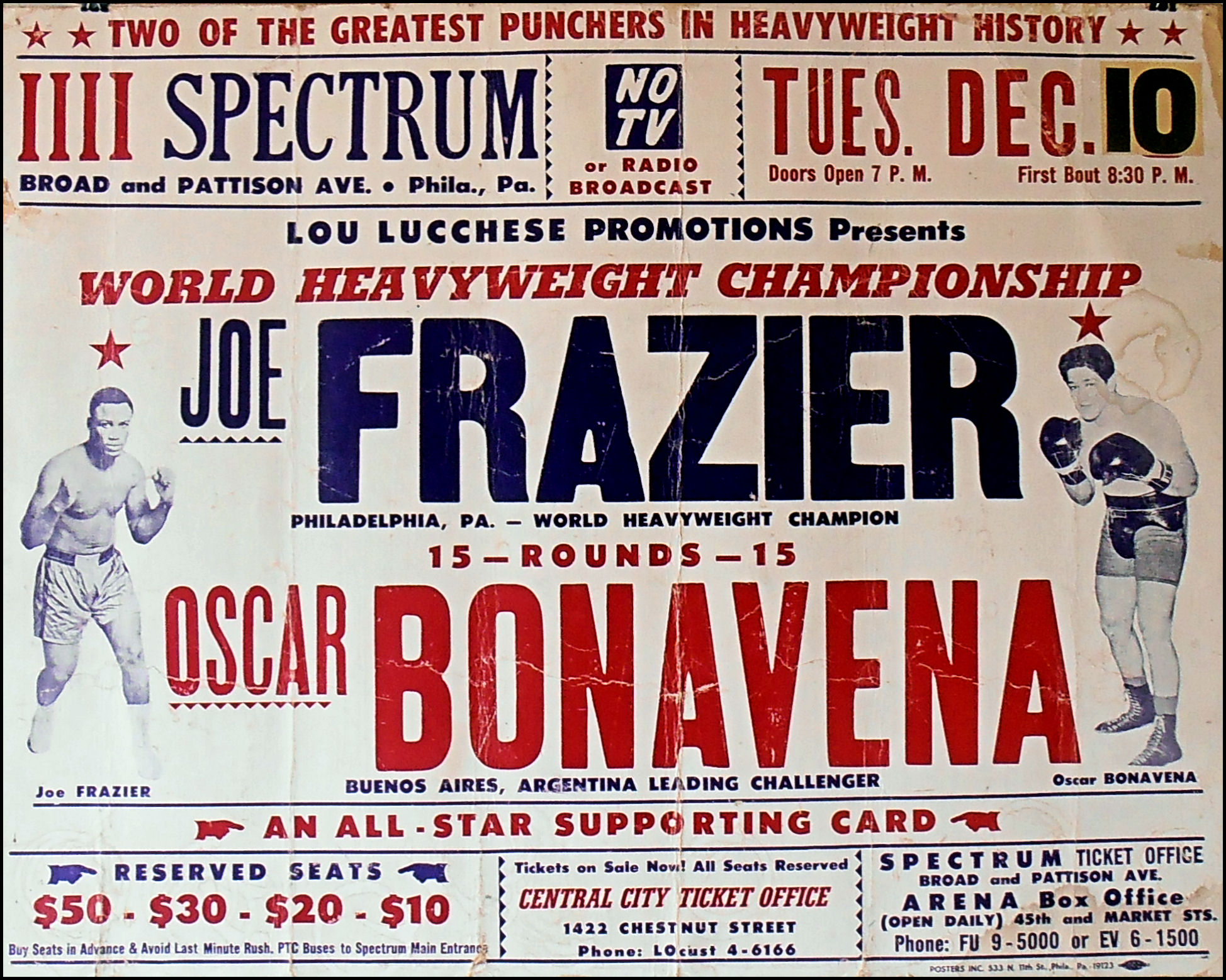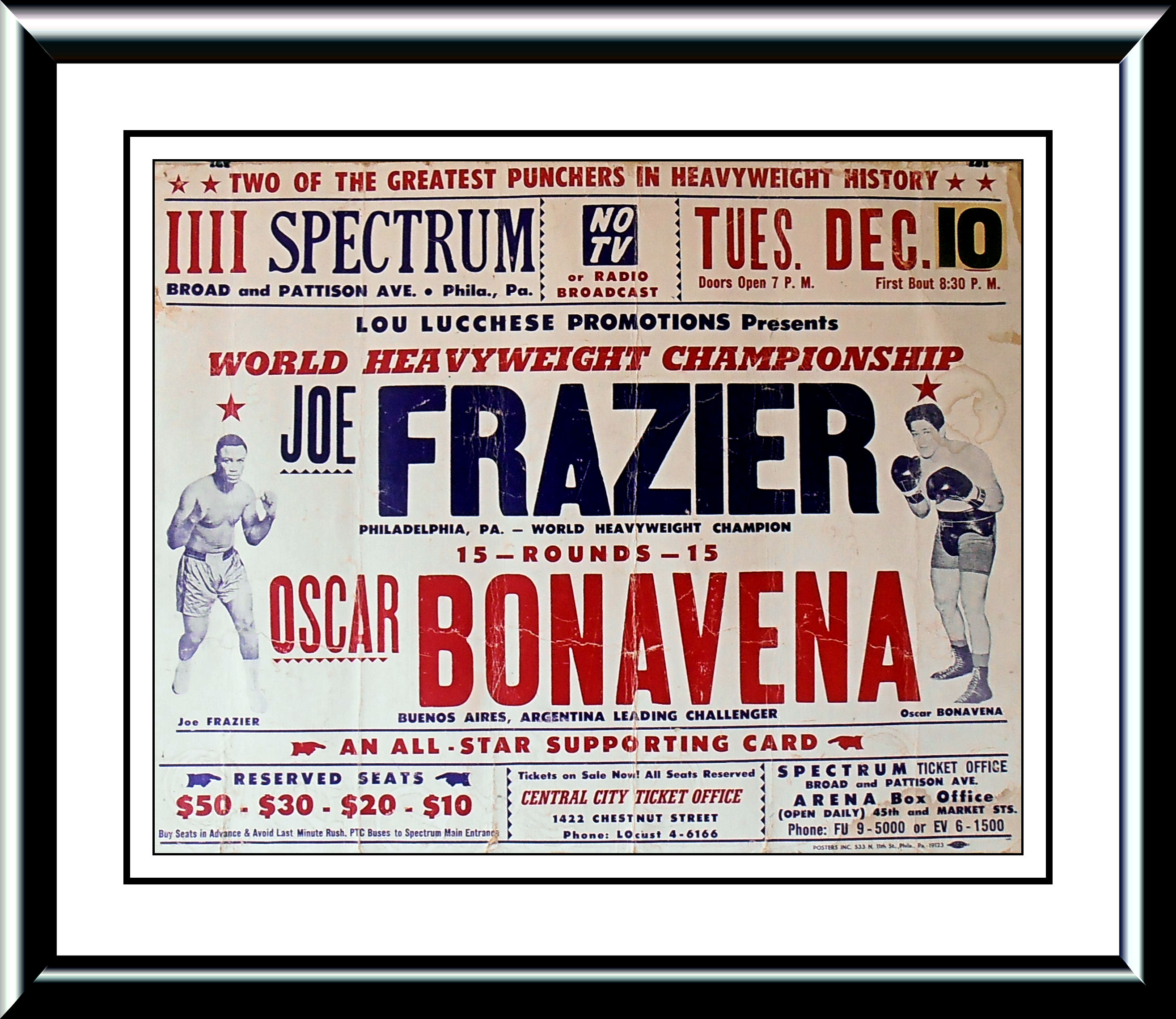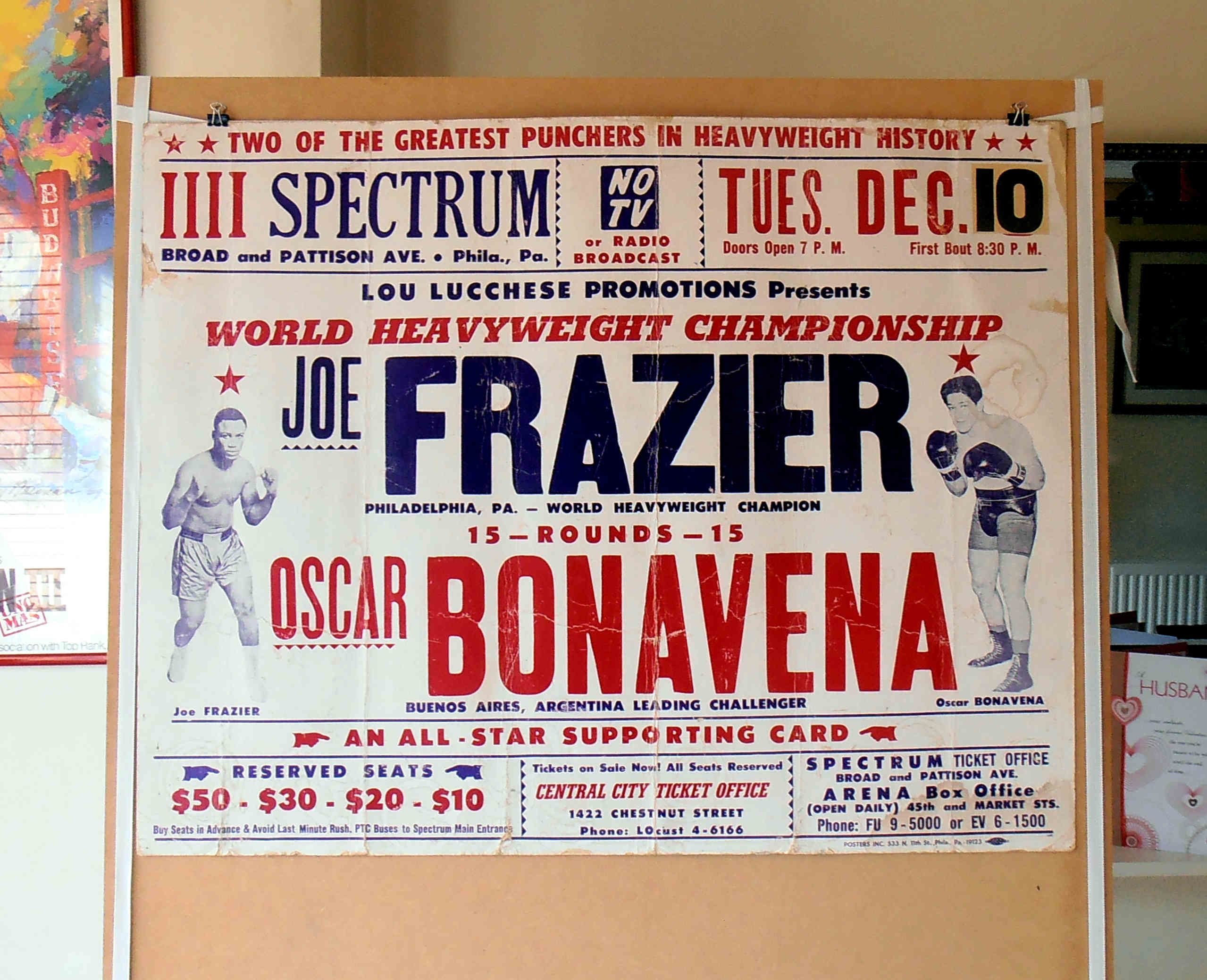 Description : Here we have a mega piece of heavyweight boxing history, a rare vintage onsite poster from the 1960's featuring Joe Frazier & Oscar Bonavena.