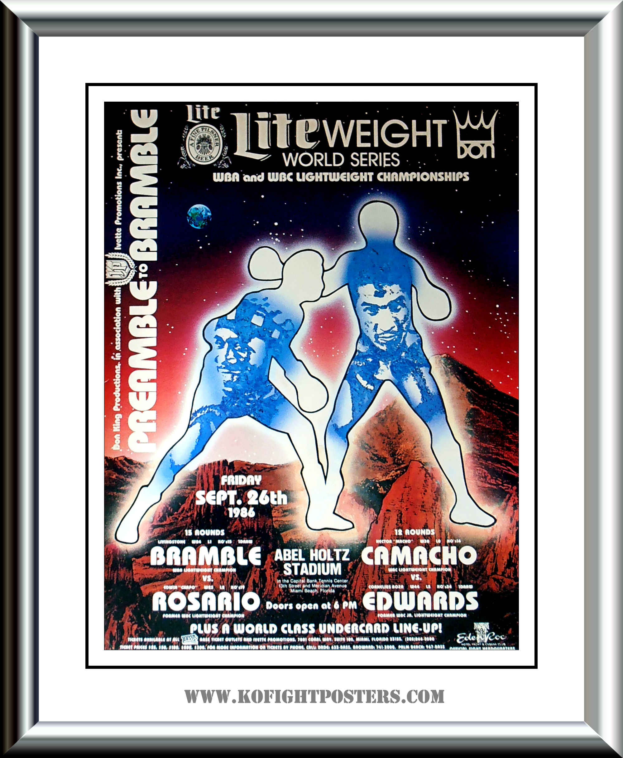 Description : He we have an original onsite poster from the Abel Holtz Stadium, Miami tournament sponsors 'Miller Lite' in association with Don King Productions for the lightweight tournament to decide the undisputed champion of the Lightweight division.