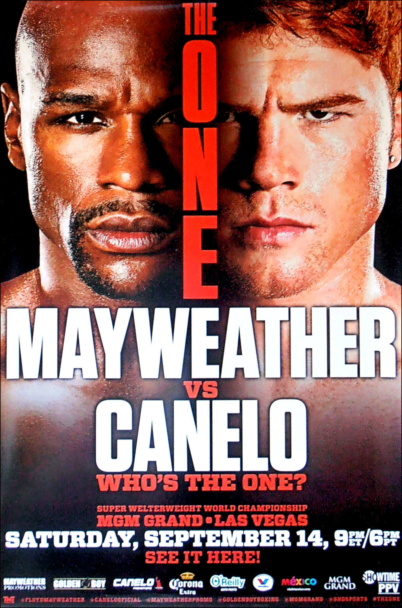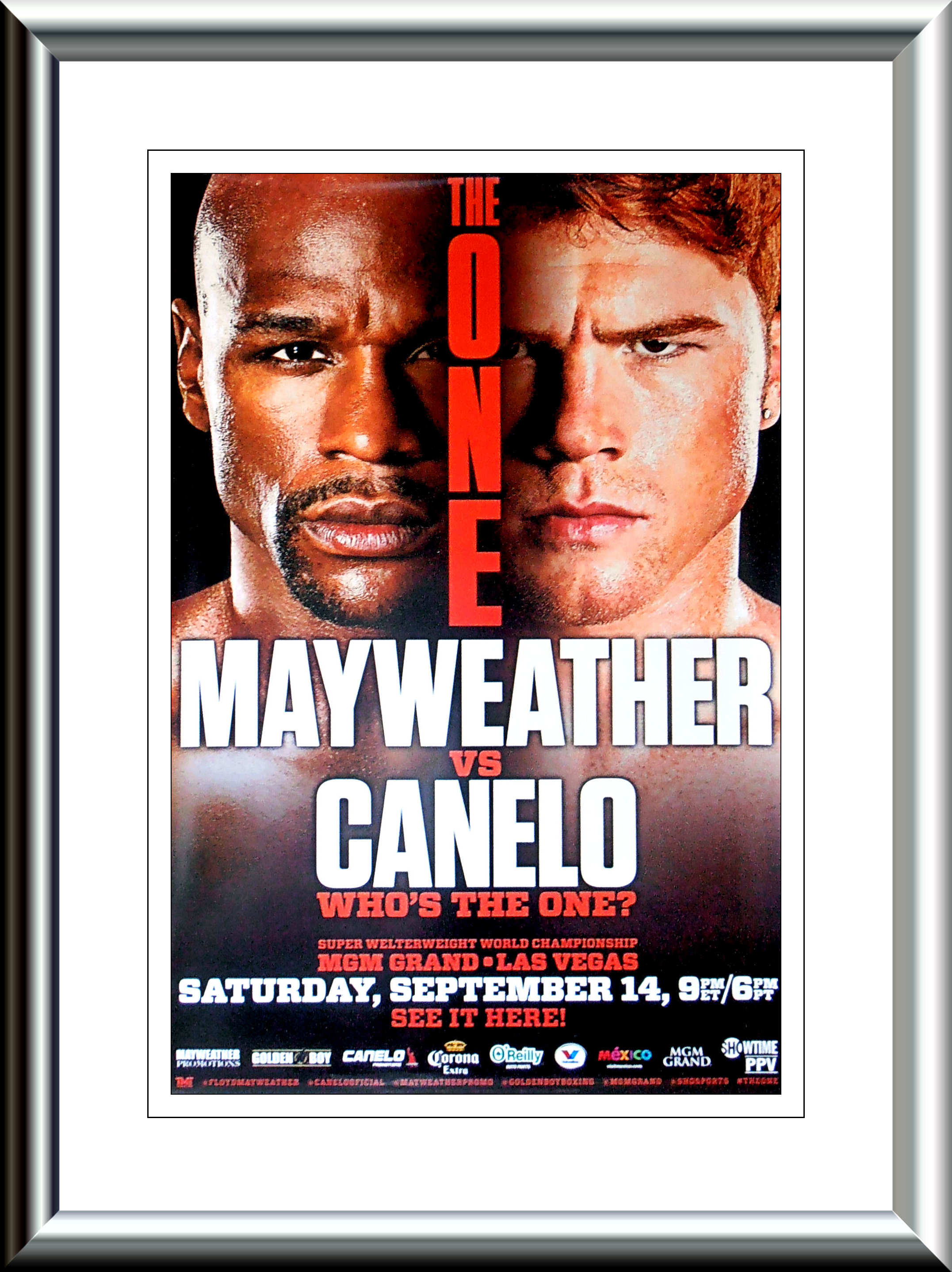Description : Official SHOWTIME/Goldenboy Boxing PPv poster from the Mega Fight at the MGM Grand Garden Arena in Las Vegas. Where Floyd Mayweather Jr dished out another boxing lessen to the up & coming Mexican Superstar Saul 'Canelo' Alvarez.