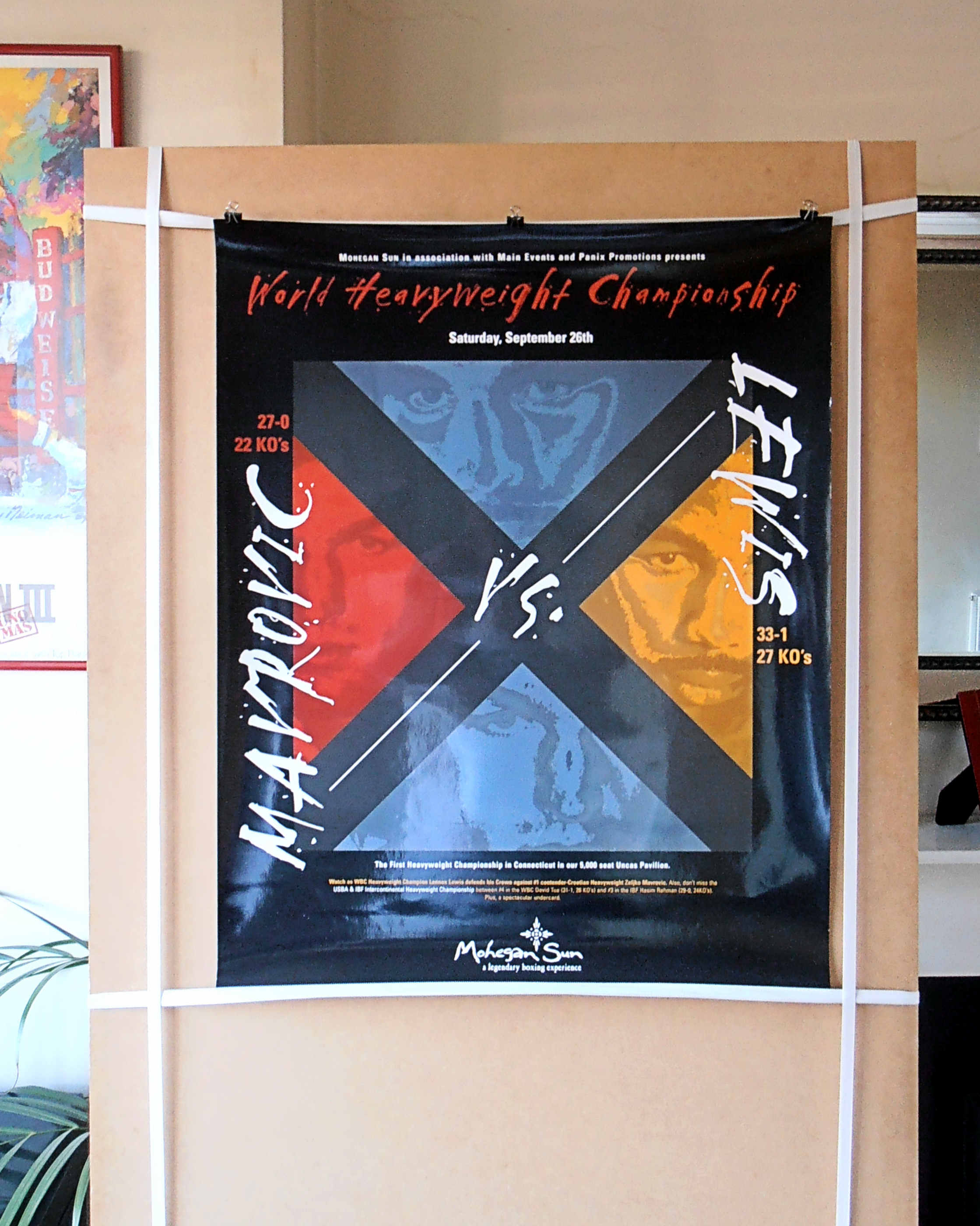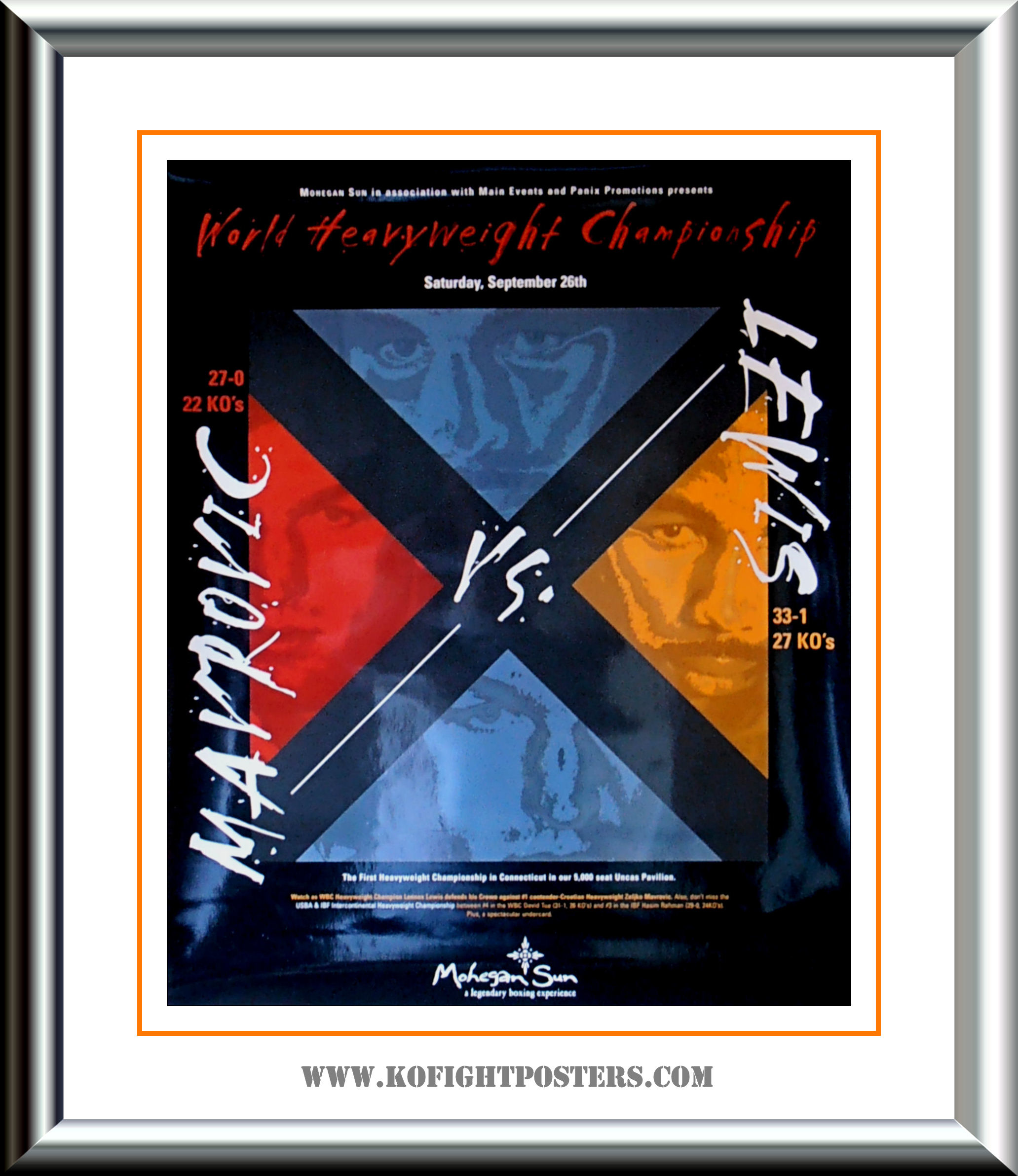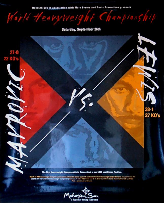 Description : Here we have an original onsite boxing fight poster for Lennox Lewis vs. Zeljko Mavrovic, the WBC No#1 contender. Billed as "Battle of the Giants", contested on September 26th, 1998 at the Mohegan Sun Casino, Connecticut, for the WBC and Lineal Heavyweight Championships.