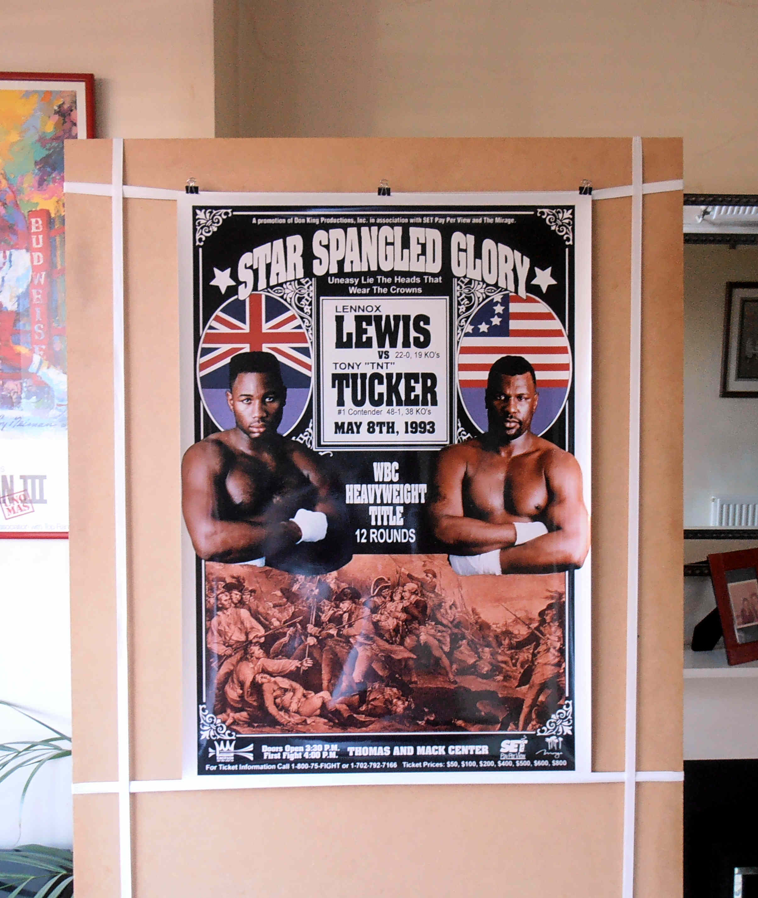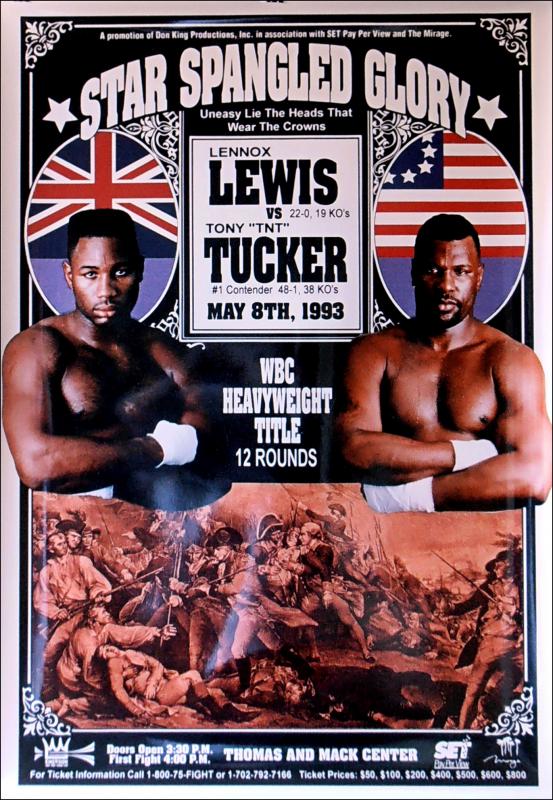 Description : Here we have an original official onsite poster for Lennox Lewis vs. Tony 'TNT' Tucker, billed as "Star Spangled Glory", contested on May 8th, 1993 at the Thomas & Mack Center, Las Vegas Nevada USA, for the WBC World Heavyweight Championship.