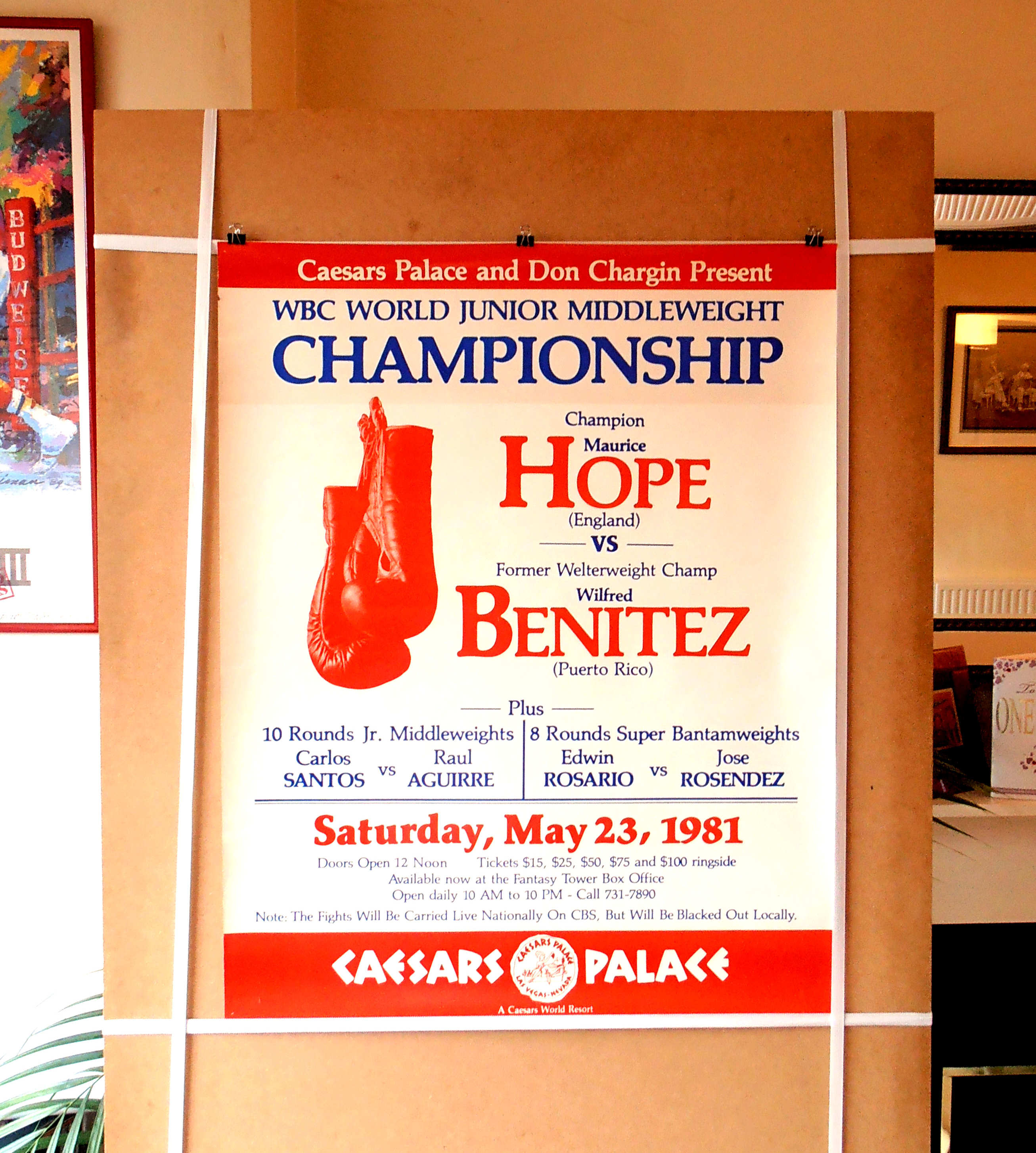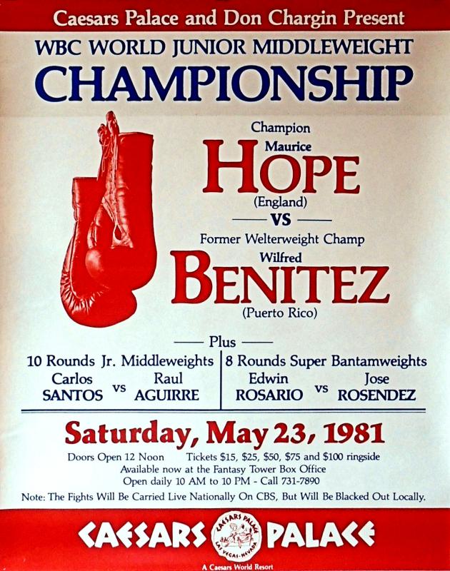 Description : Here we have the original vintage onsite poster from Caesars Palace Las Vegas for the WBC Light/Middleweight Title between reigning & defending champion Maurice Hope & Puerto Rican sensation Wilfred 'El Radar' Benitez.