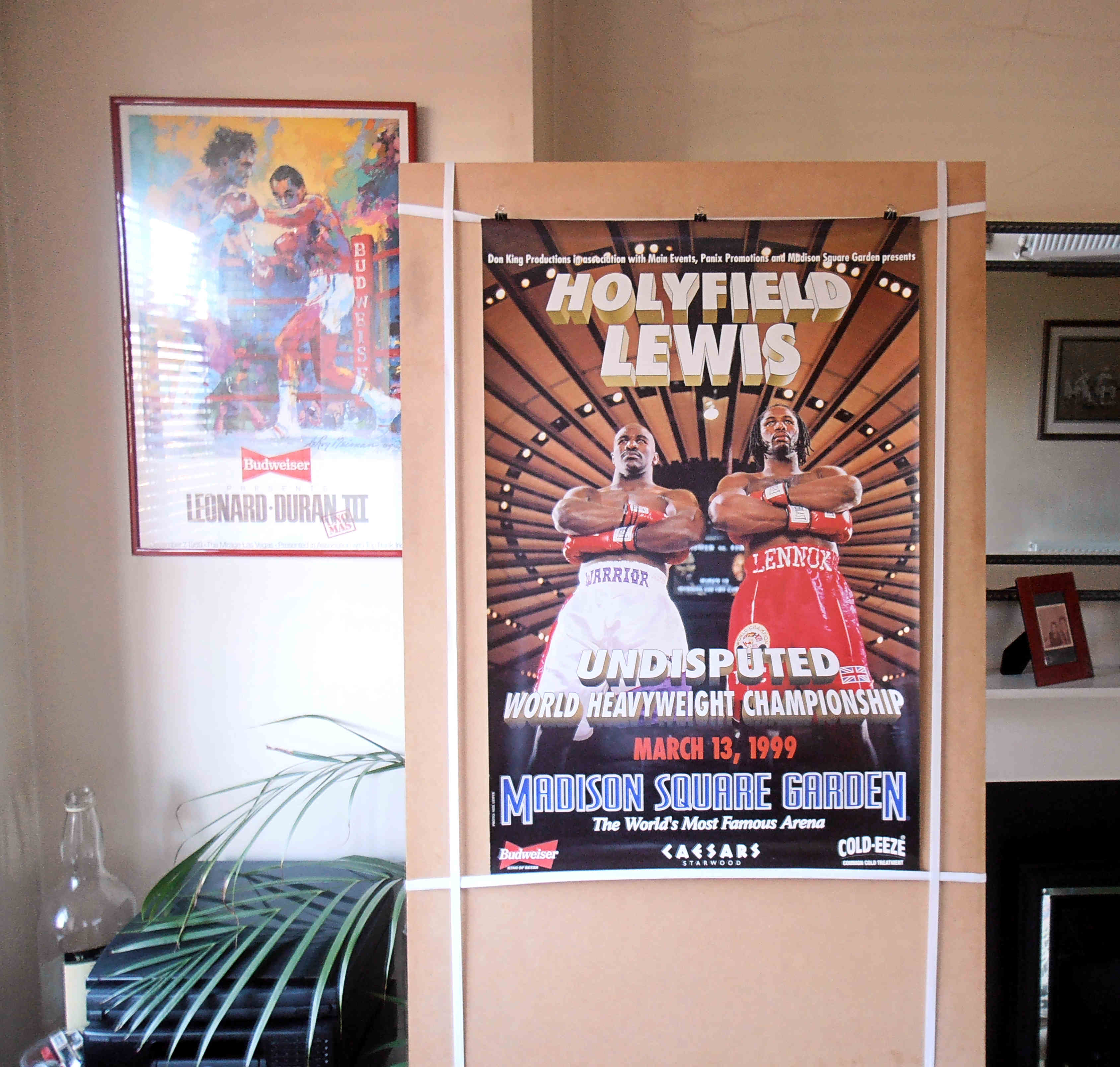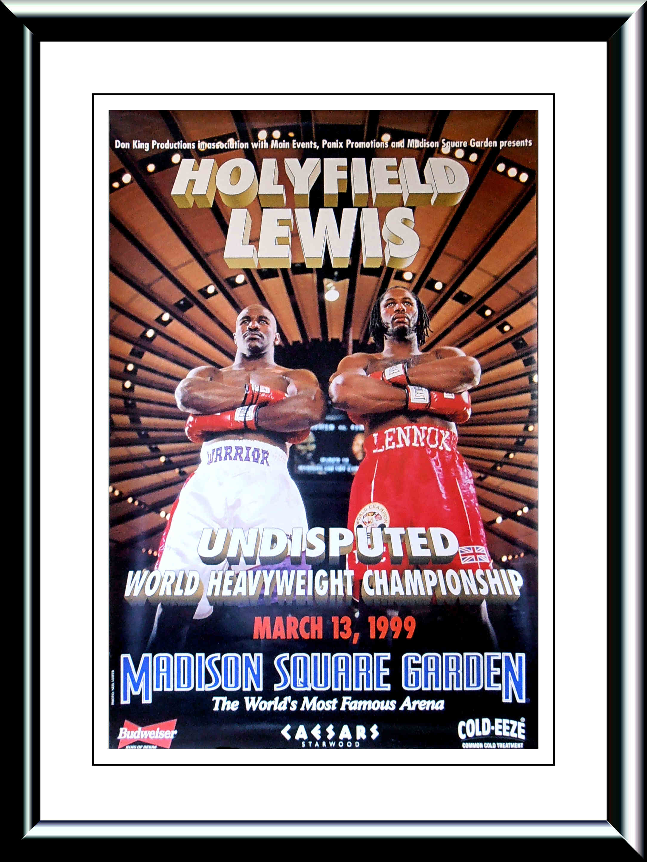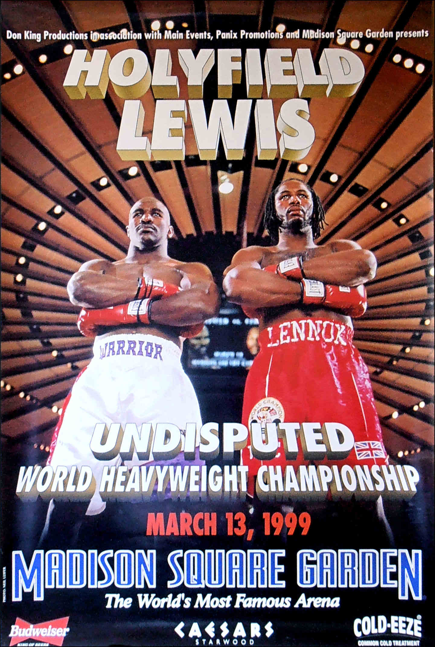Description : Here we have the official onsite main event fight poster from Madison Square Garden New York. By 1999, the public was clamoring for a unification bout versus the WBC World Champion, Lennox Lewis of the United Kingdom. That bout happened in March of that year. The bout was declared a controversial draw after twelve rounds, where it appeared to most that Lewis dominated the fight. There was uproar at the scoring, myself I thought it was close, not much really happened, lewis was more than a tad cautious. Holyfield claimed his performance was hindered by stomach and leg cramps. Holyfield and Lewis were ordered by the three leading organizations of which they were champions to have an immediate rematch. | judge: Stanley Christodoulou 113-116 | judge: Eugenia Williams 115-113 | judge: Larry O'Connell 115-115.