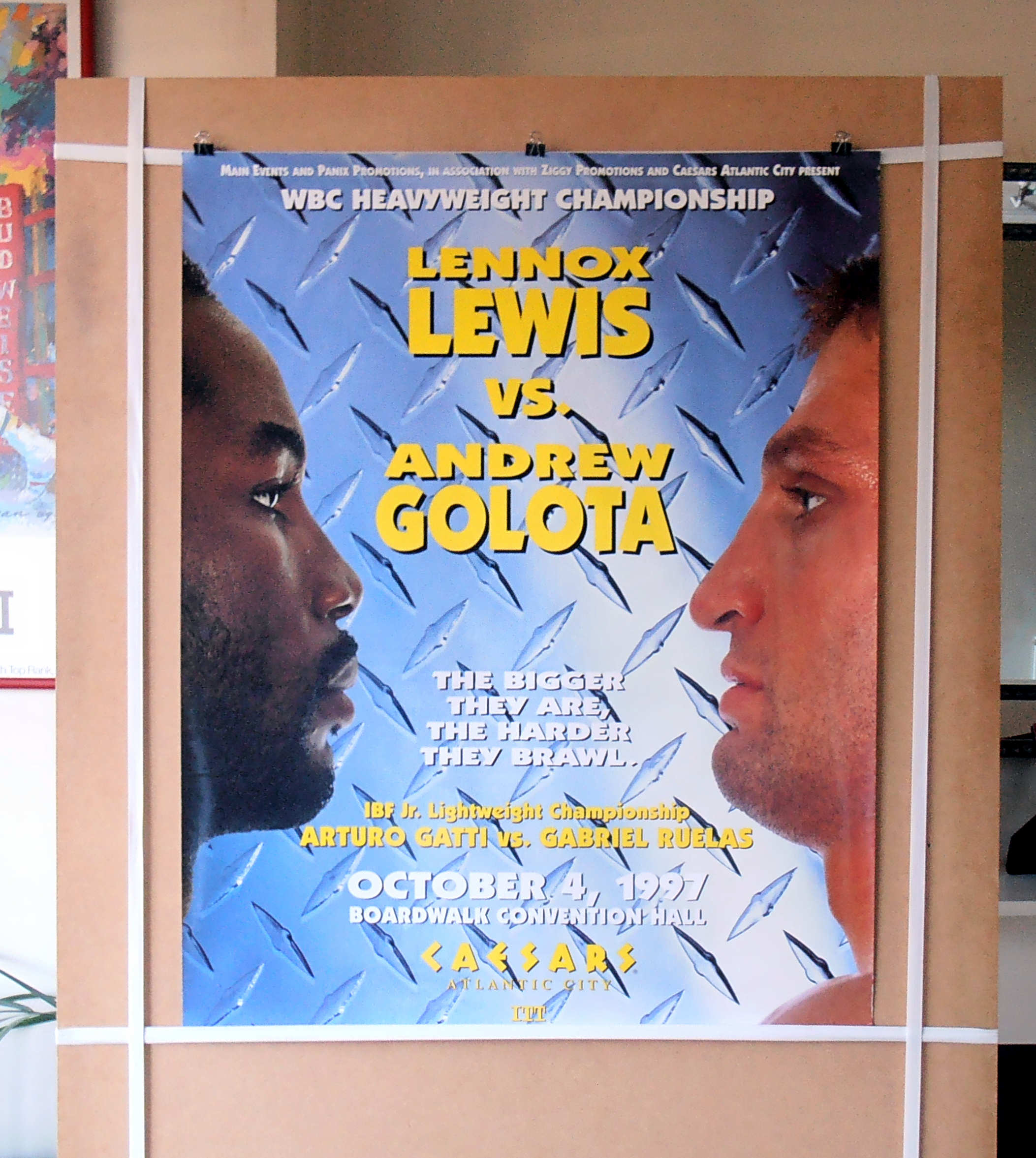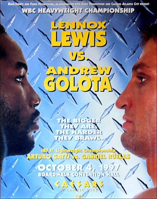 Description : Hewe we have an original onsite poster from Caesars Atlantic City NJ, October 4, 1997 for the WBC Heavyweight Championship battle between reigning & defending champion Lennox Lewis vs. Andrew Golota, WBC no1 ranked contender.